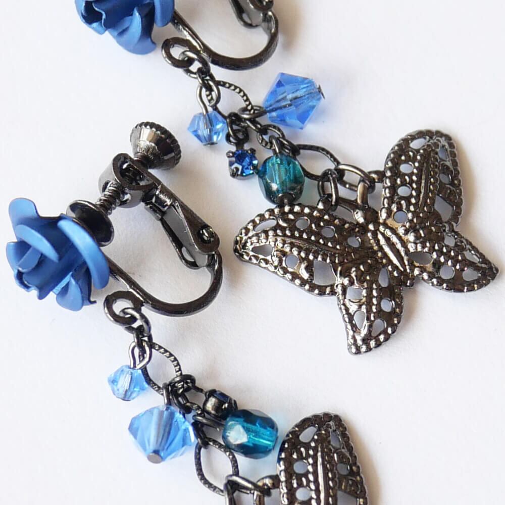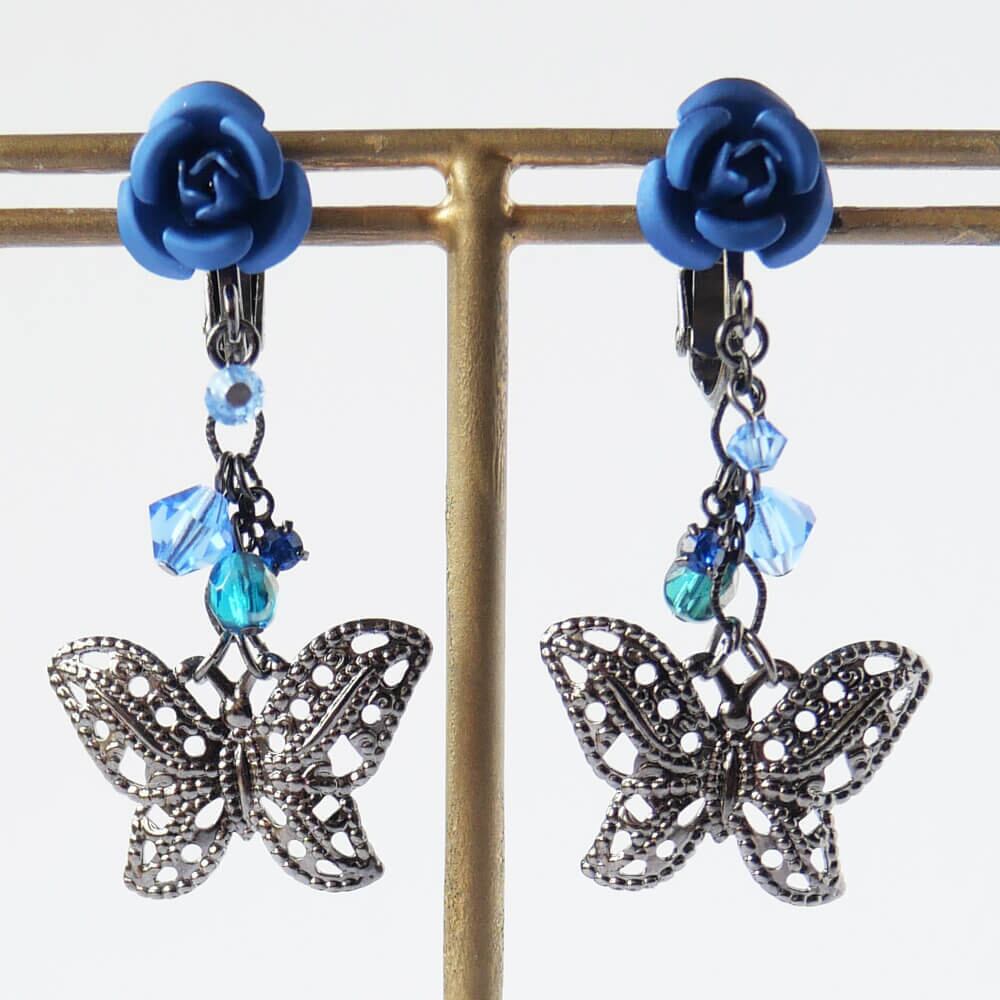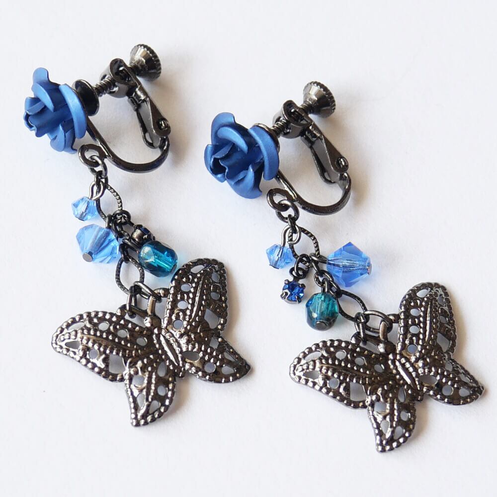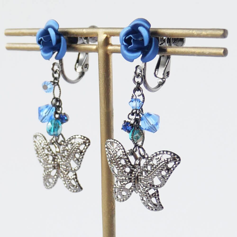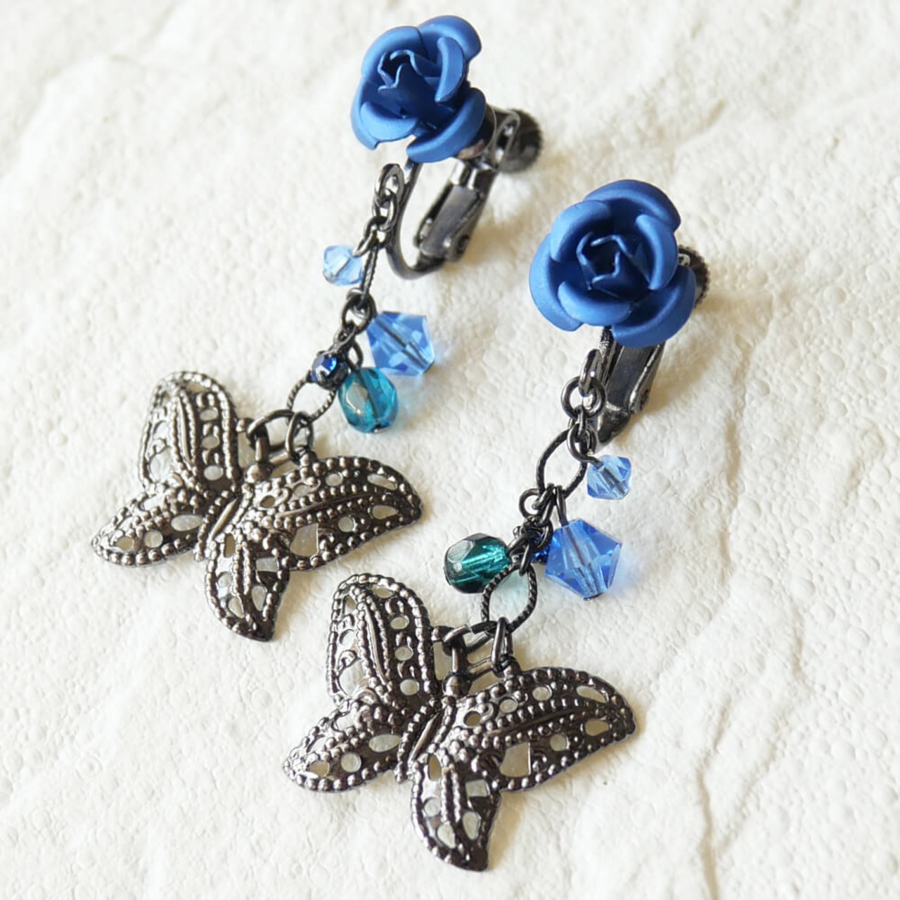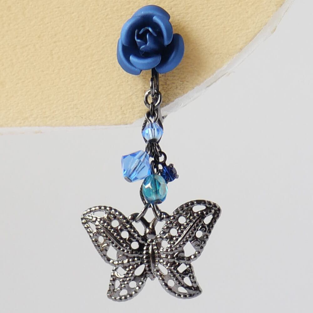 青い薔薇と蝶のデザインが美しい、ブルークリスタルイヤリング