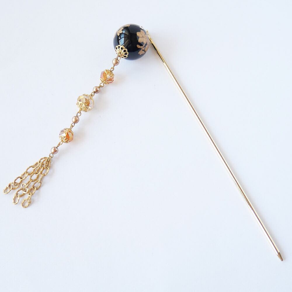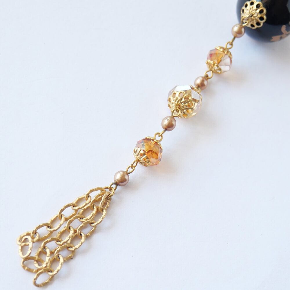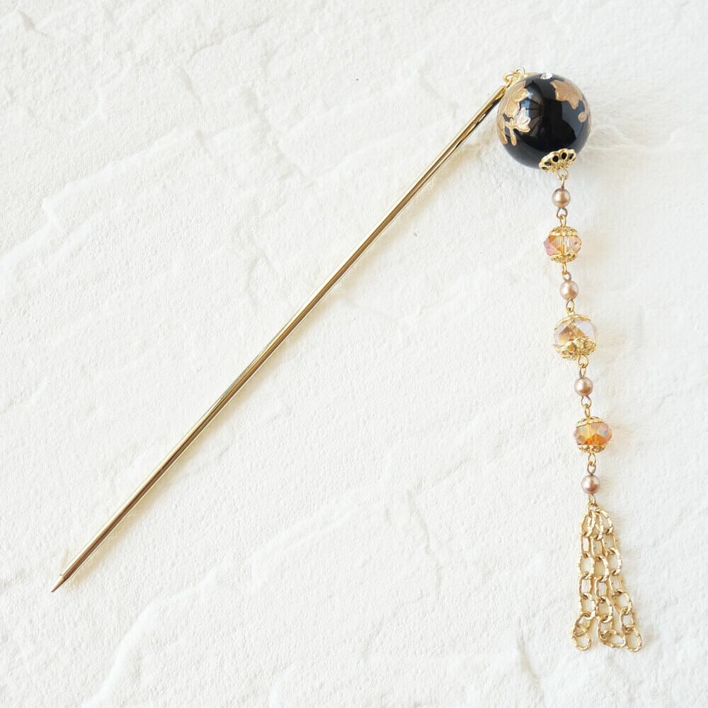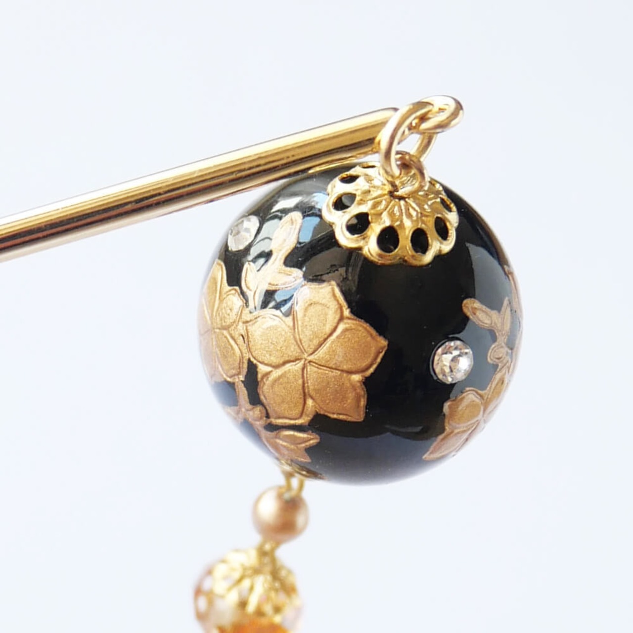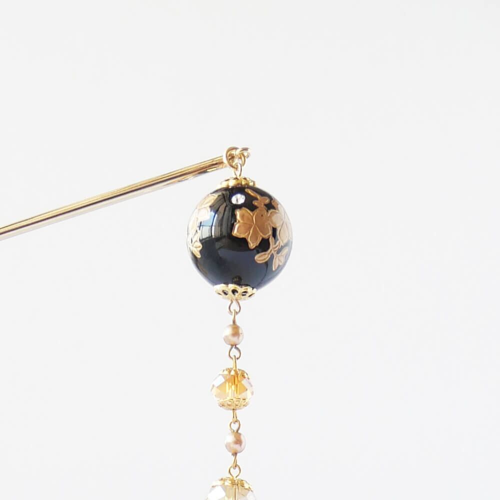 黒の珠に金の花をペイント、クリスタルストーンのアクセント
