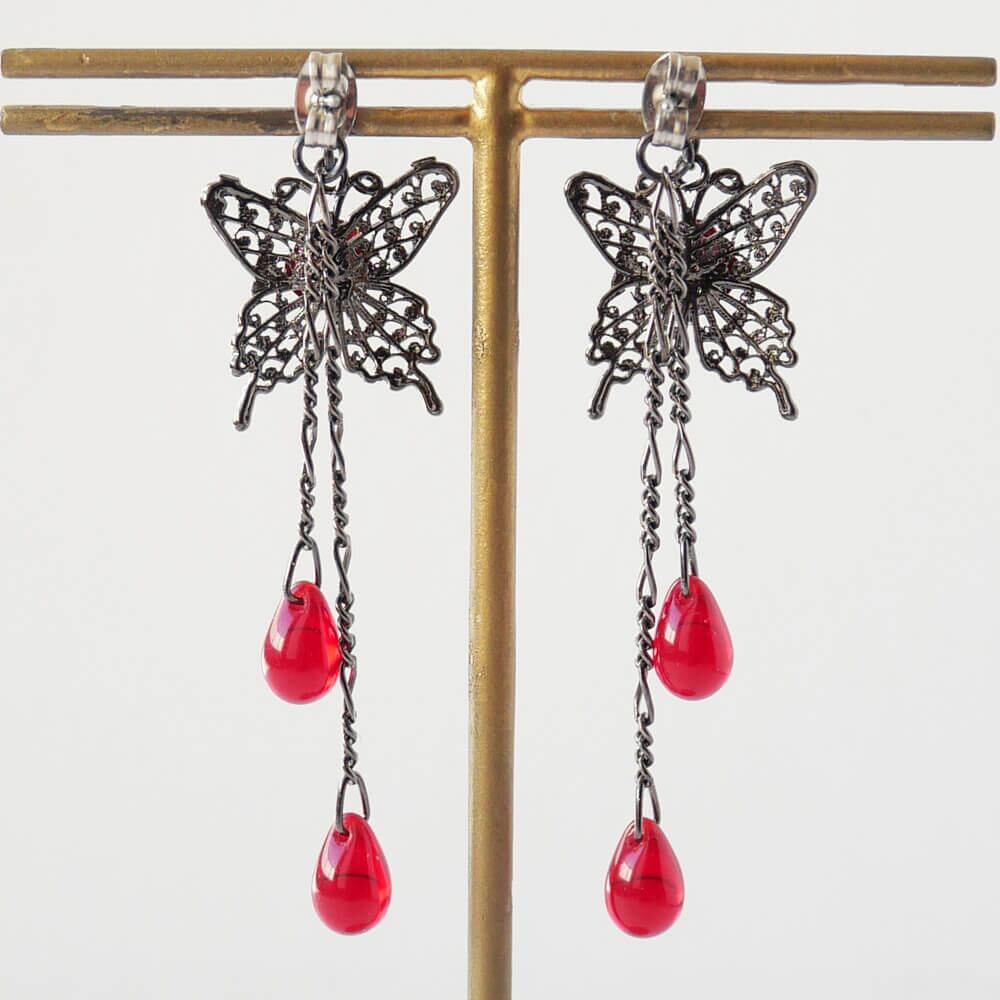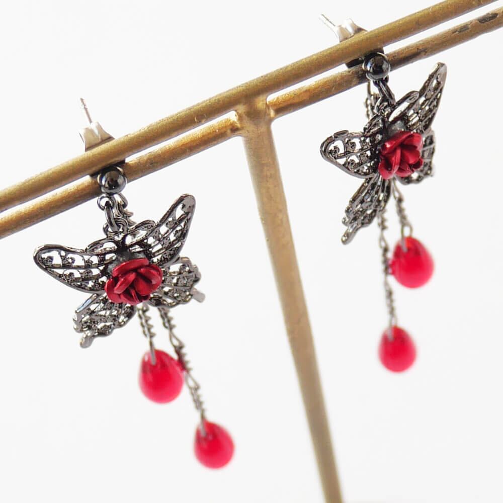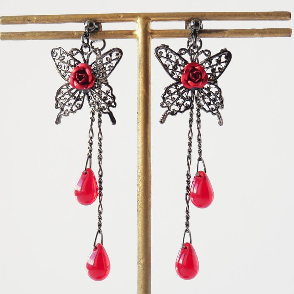 薔薇 蝶 ピアス ドロップガラス