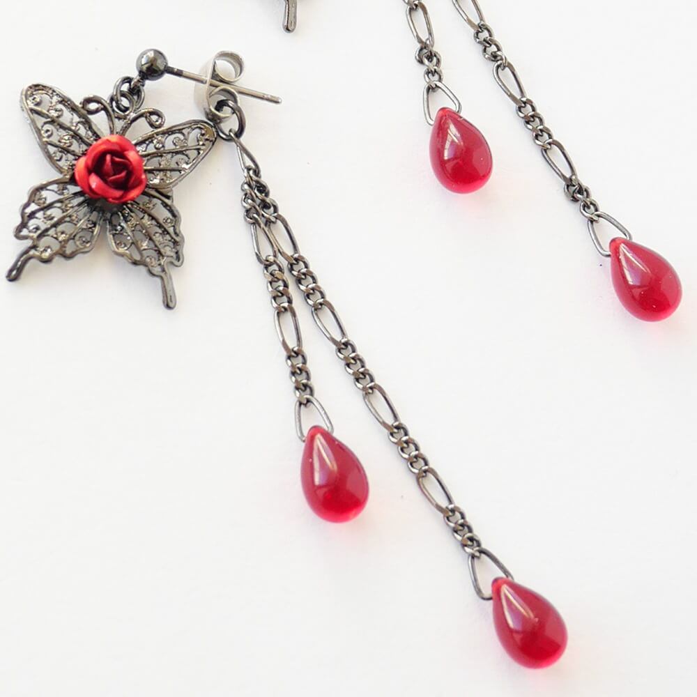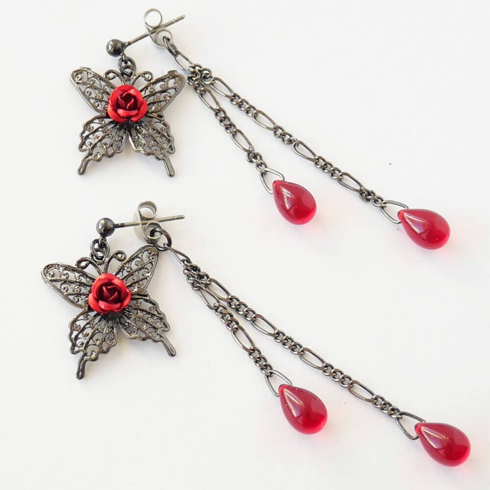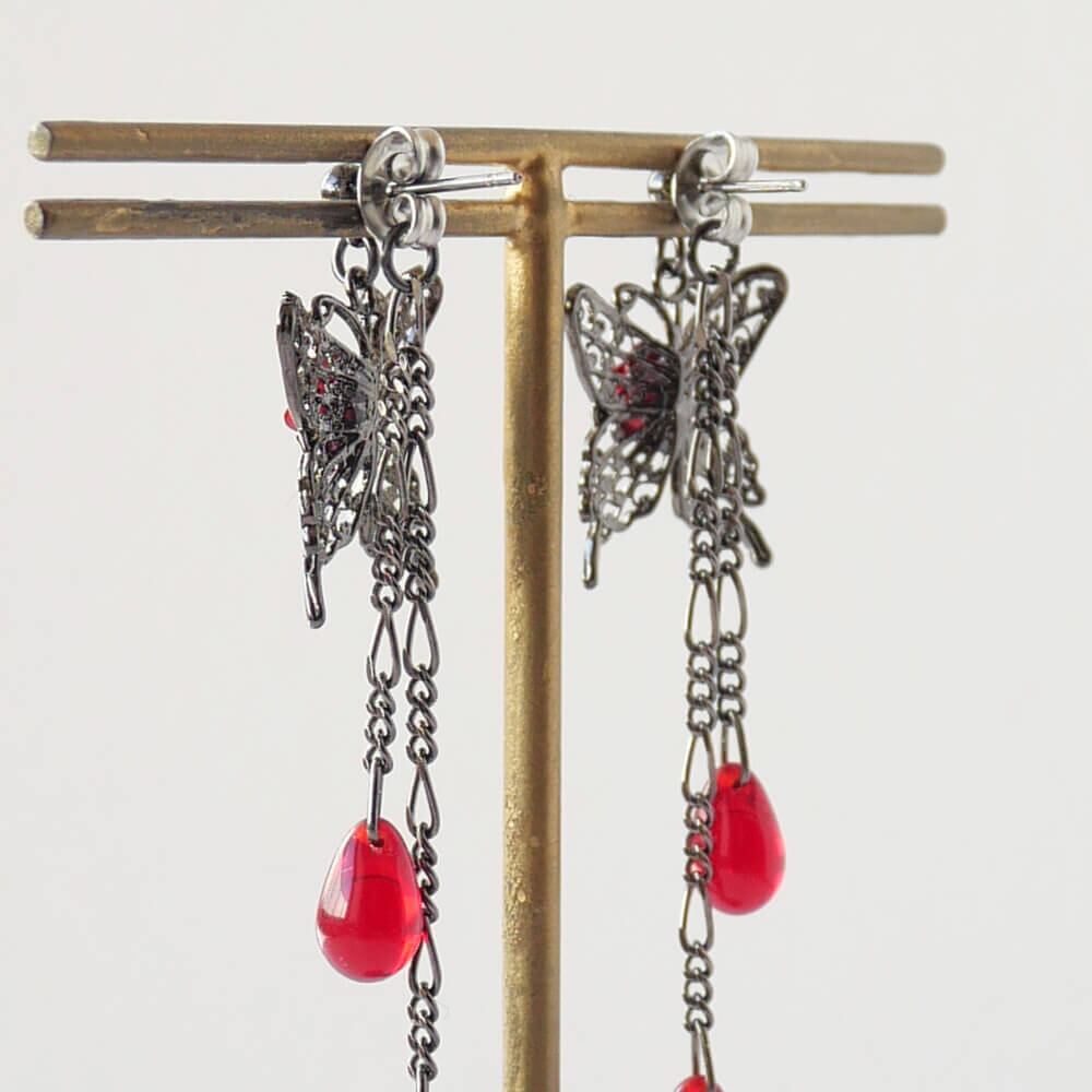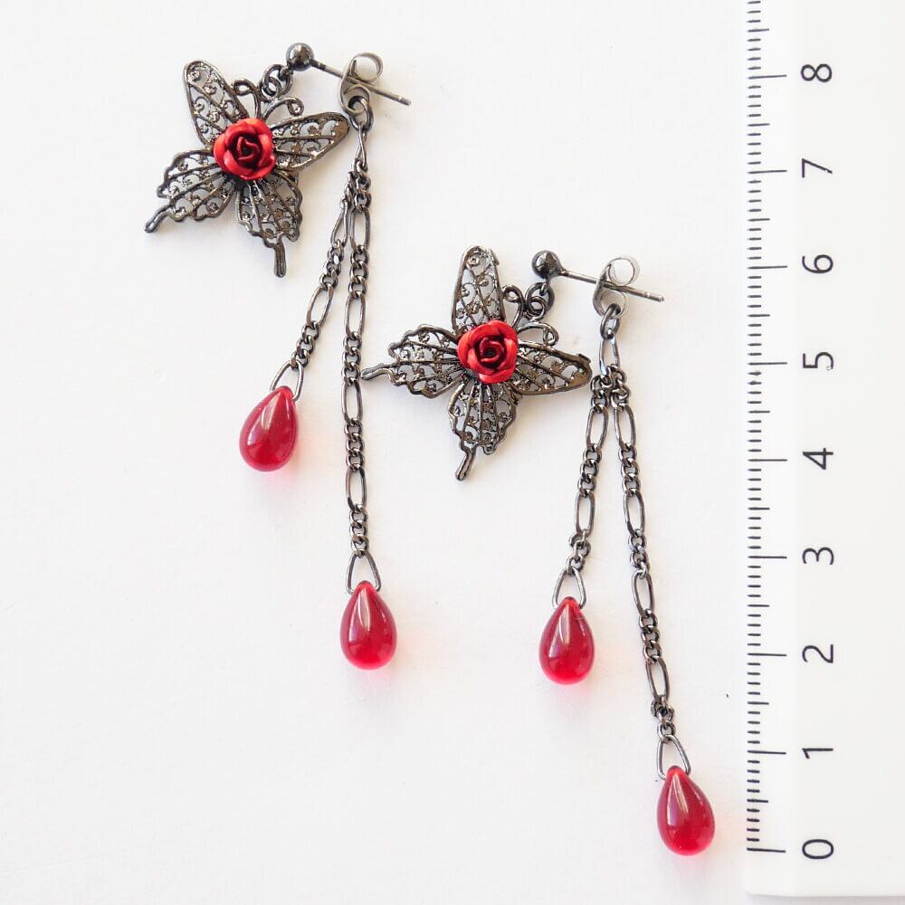 薔薇 蝶 ピアス ドロップガラス