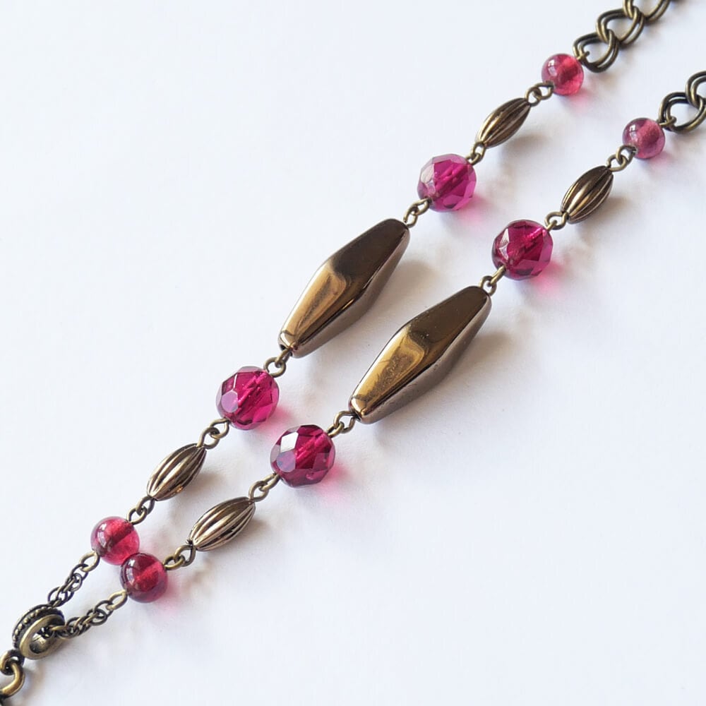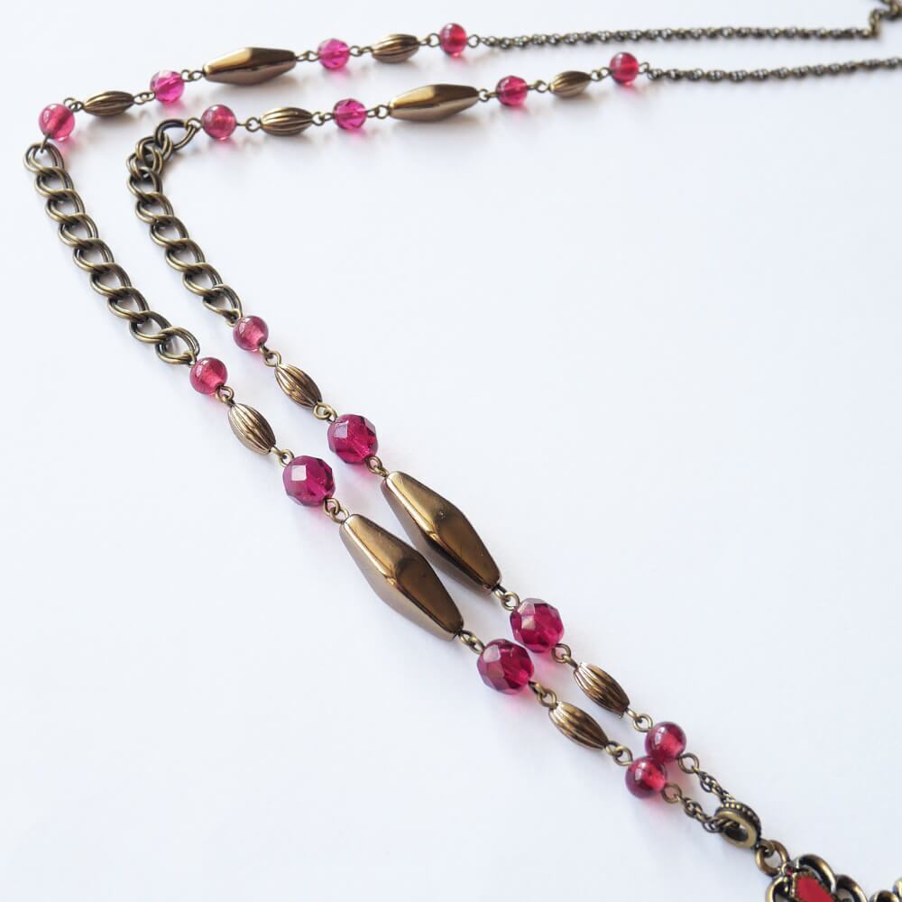 ネック部分はアンティークゴールドチェーンにレッド系のガラス玉、チェコビーズ