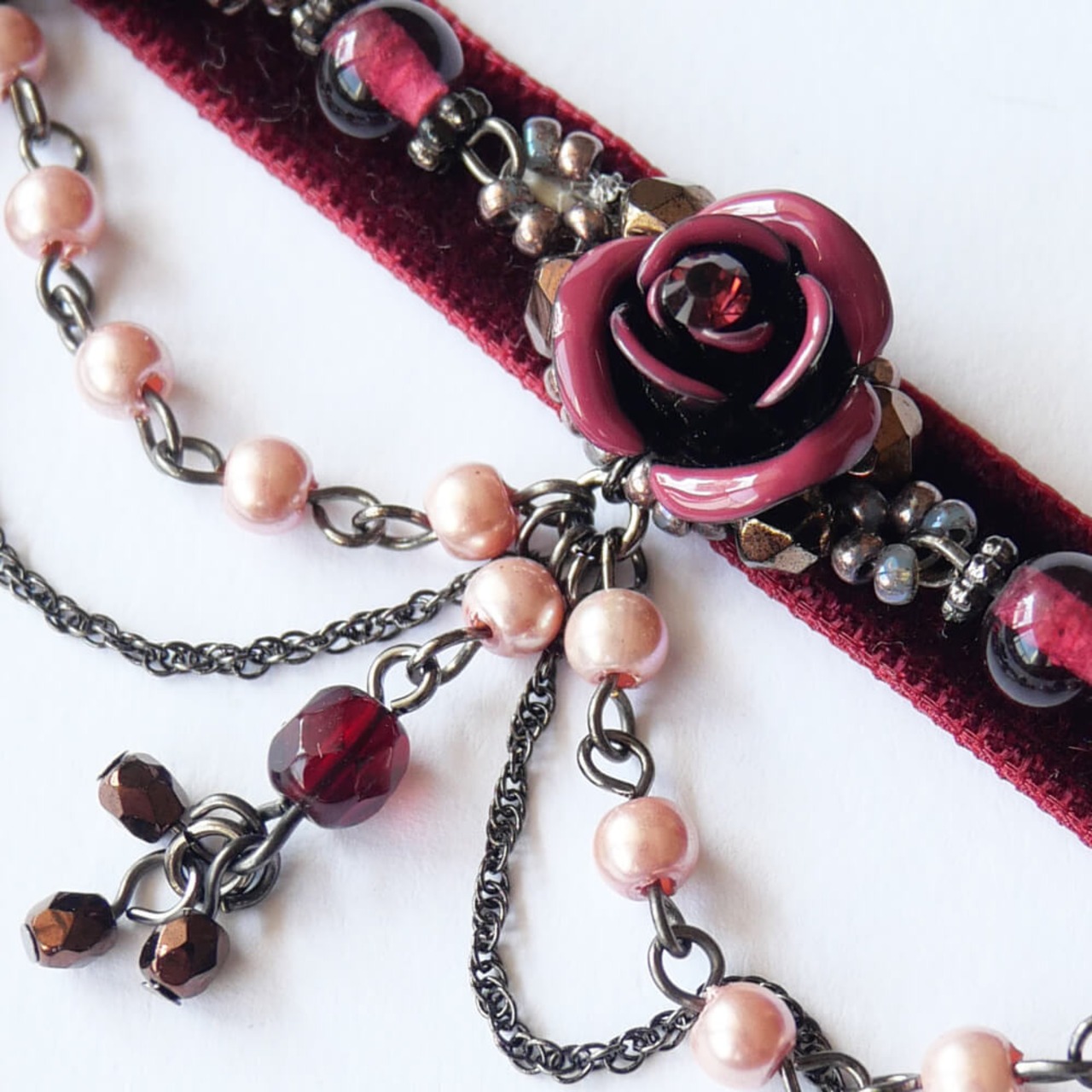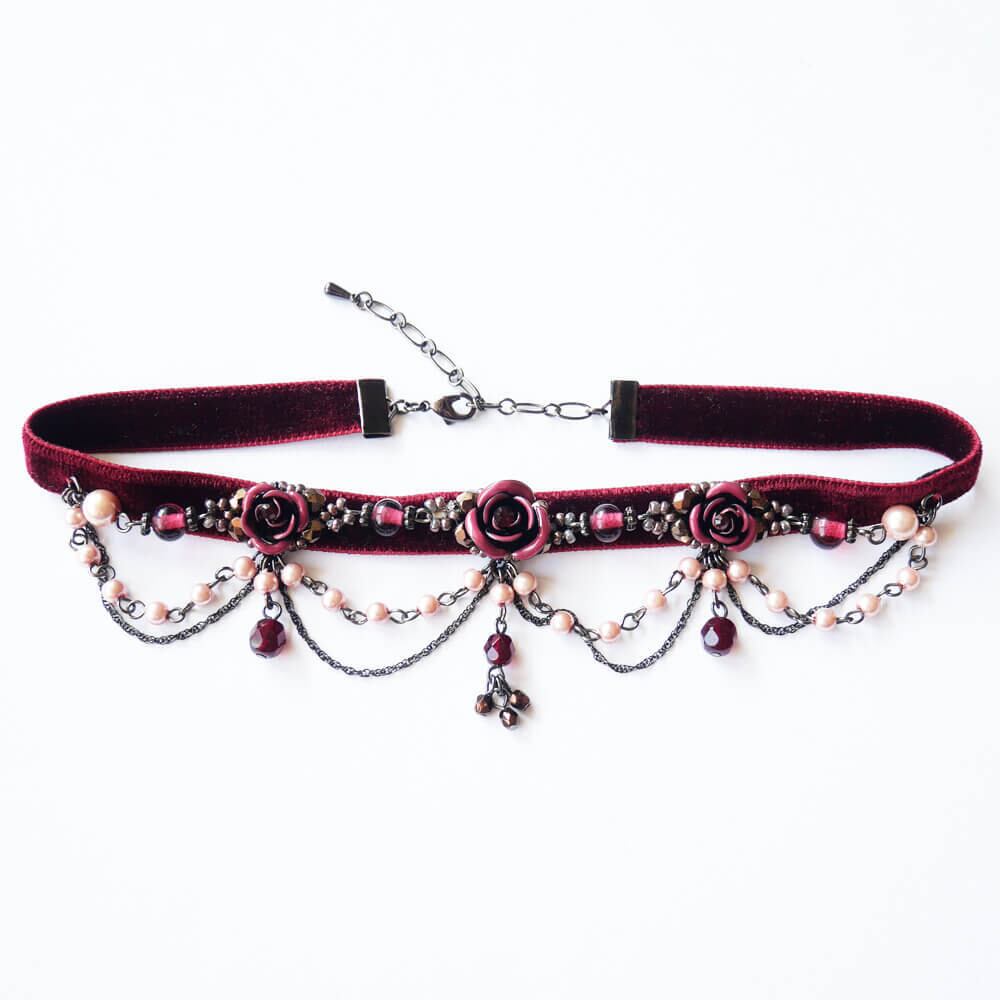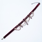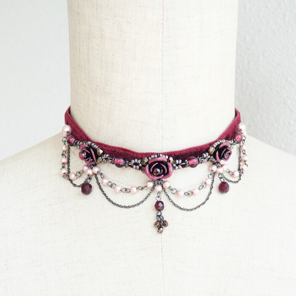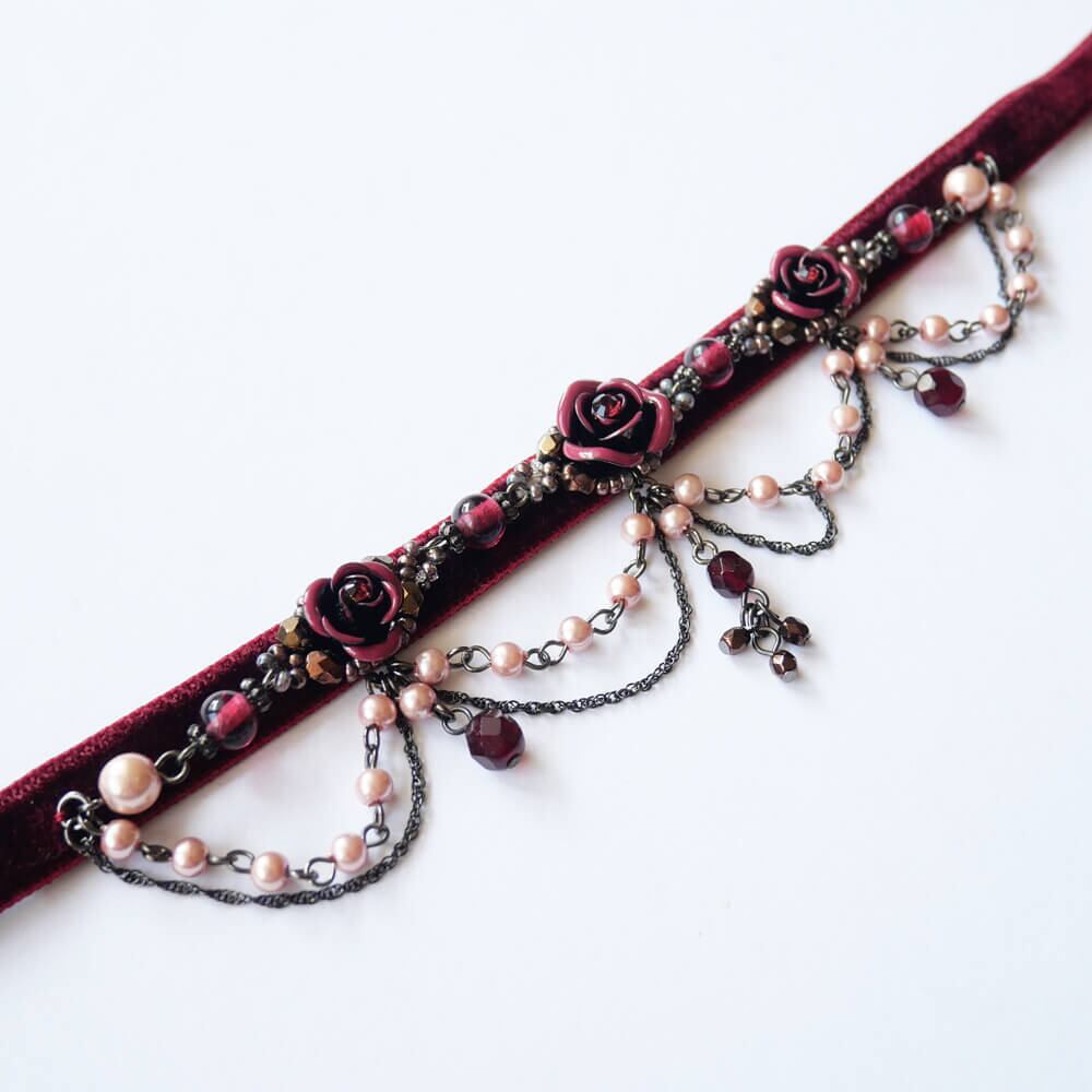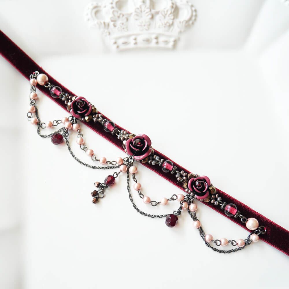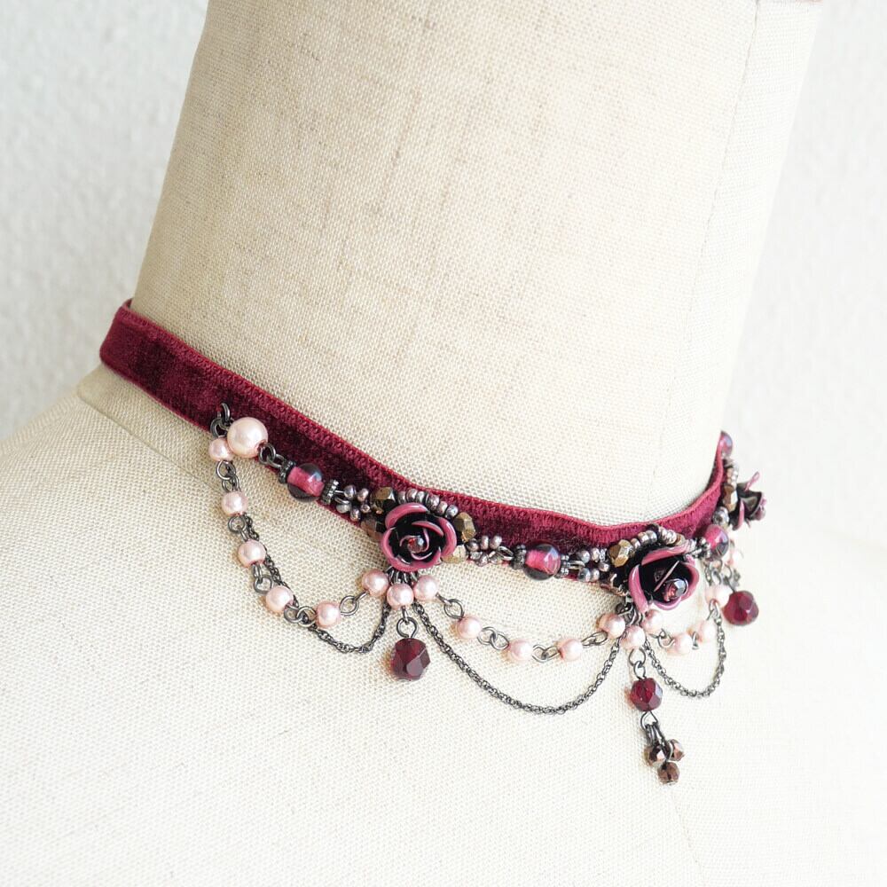 ワインカラーのベルベットに縫製したハンドメイドチョーカー