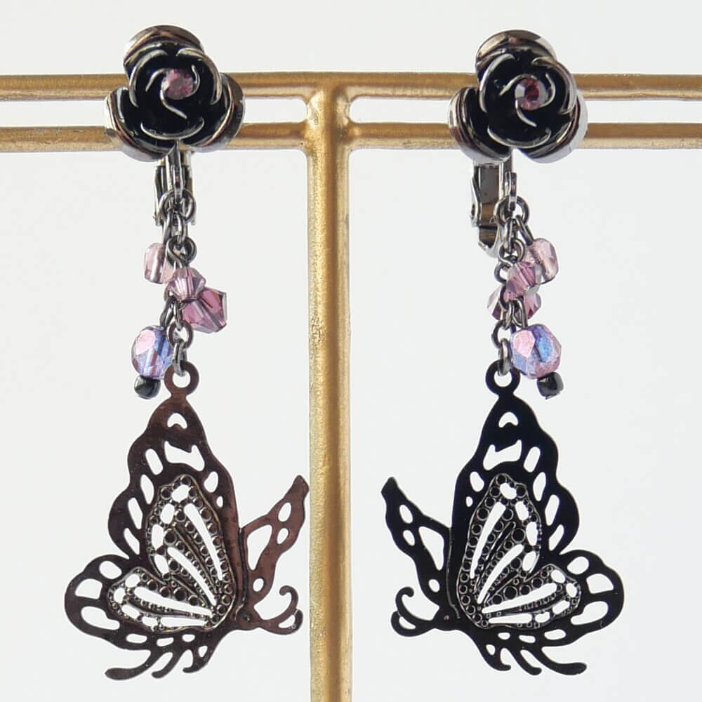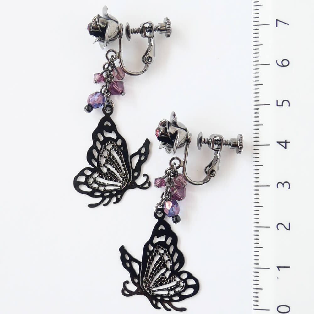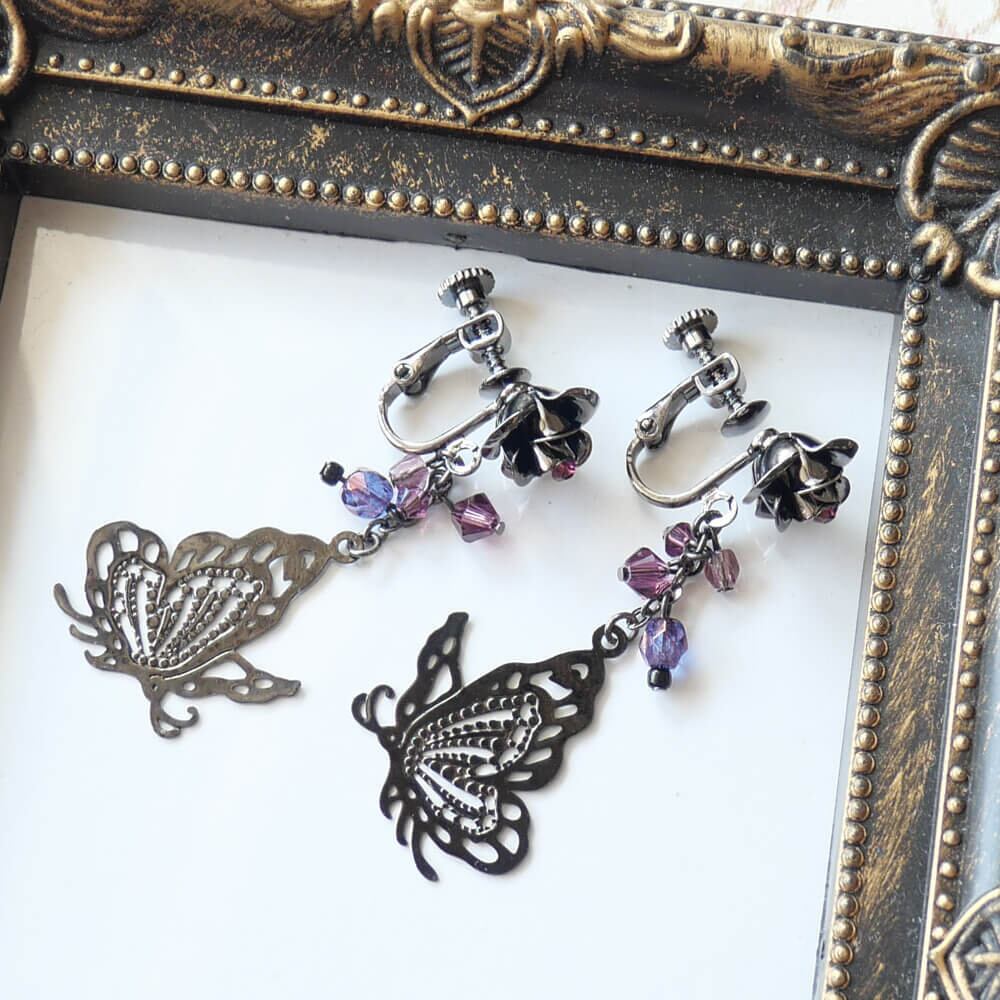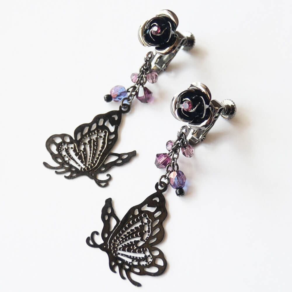 パープルローズ×ガンメタバタフライのゴスロリ風イヤリング