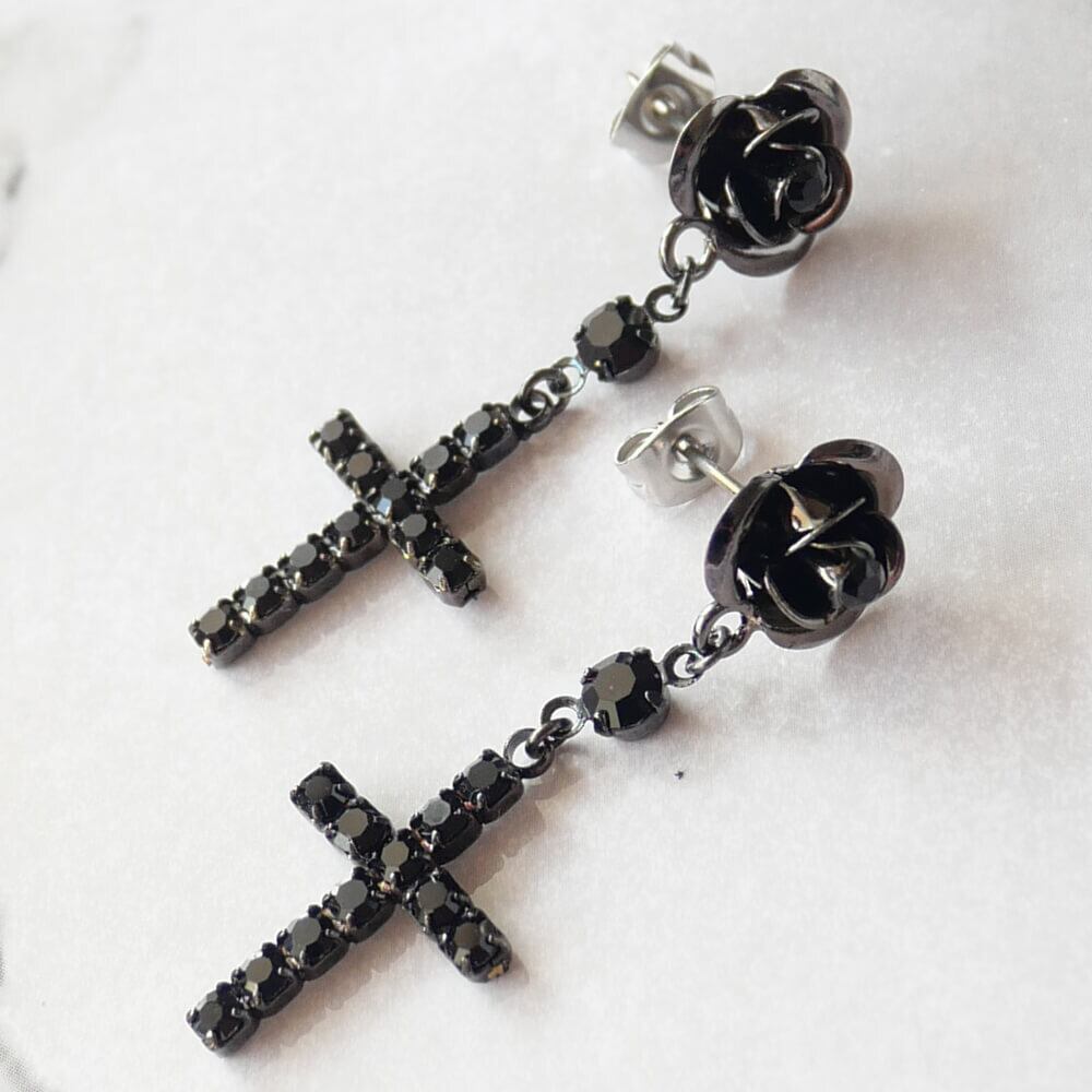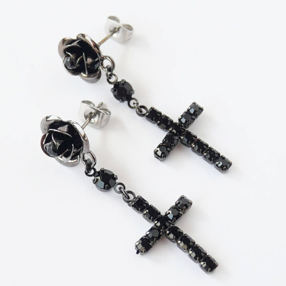 中央にブラックストーンの薔薇ピアスの下に黒十字架が下がります。