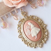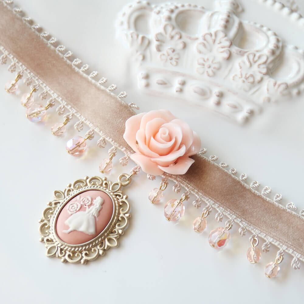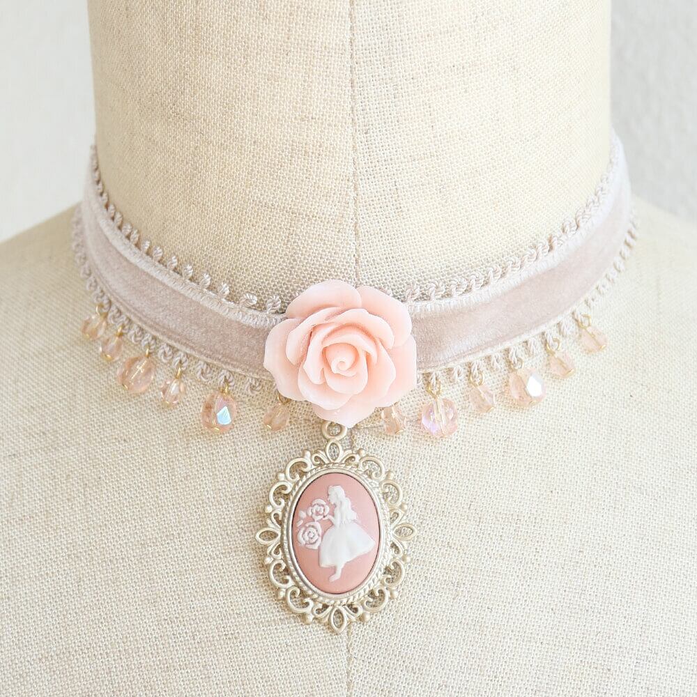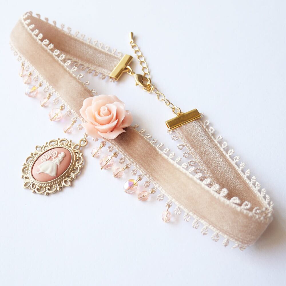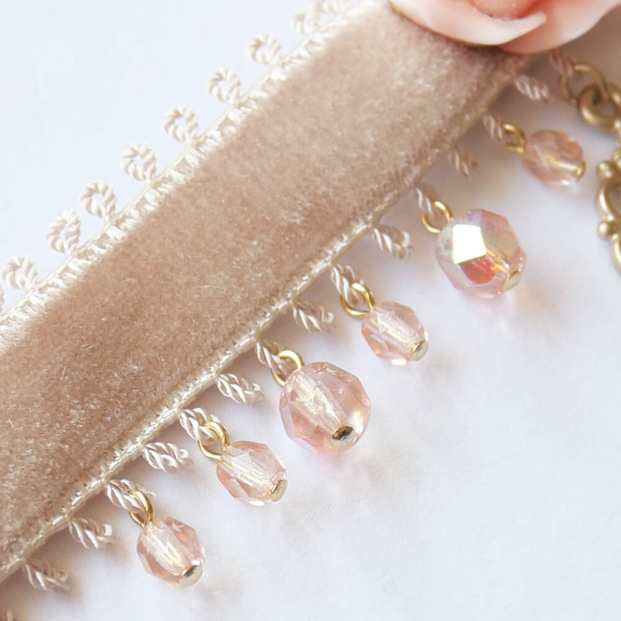 ピンク色のオーロラ加工のチェコビーズが首元で揺れる