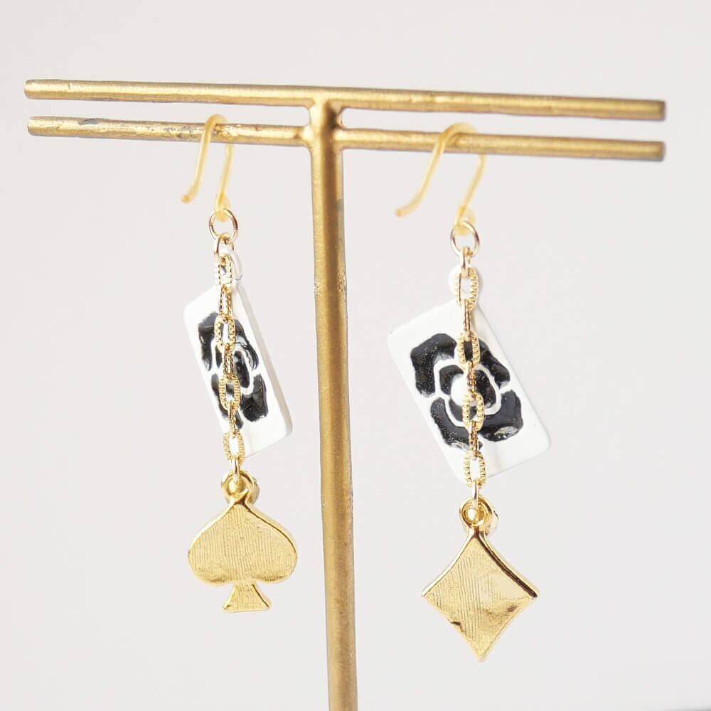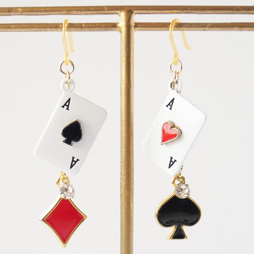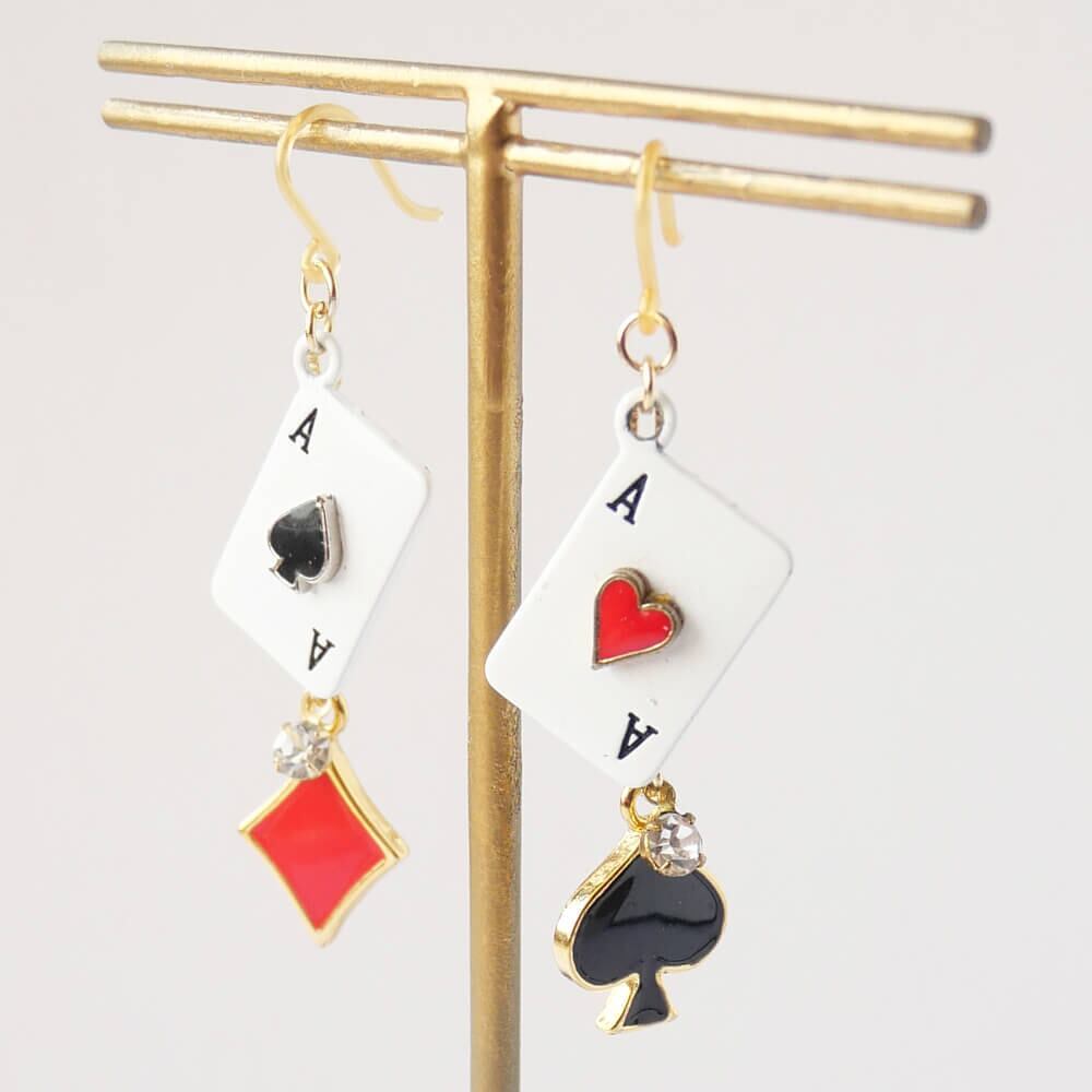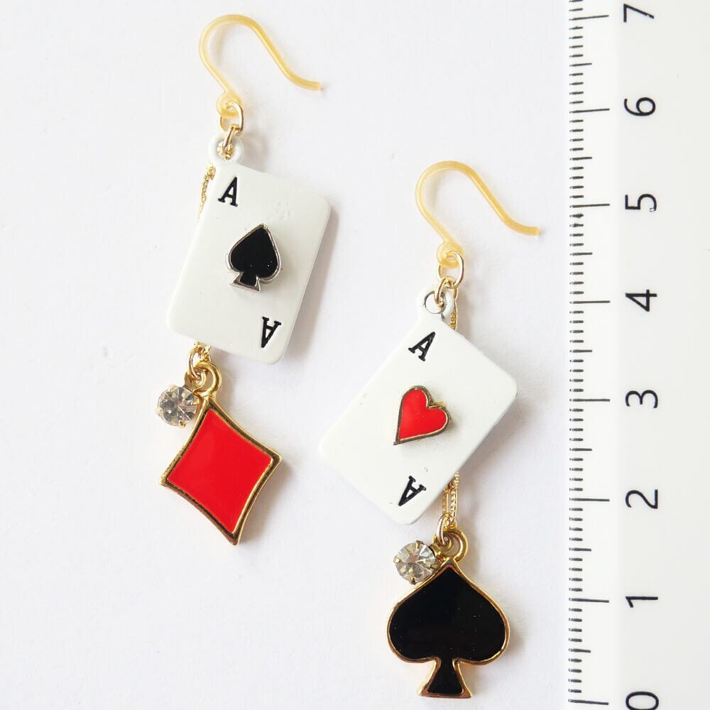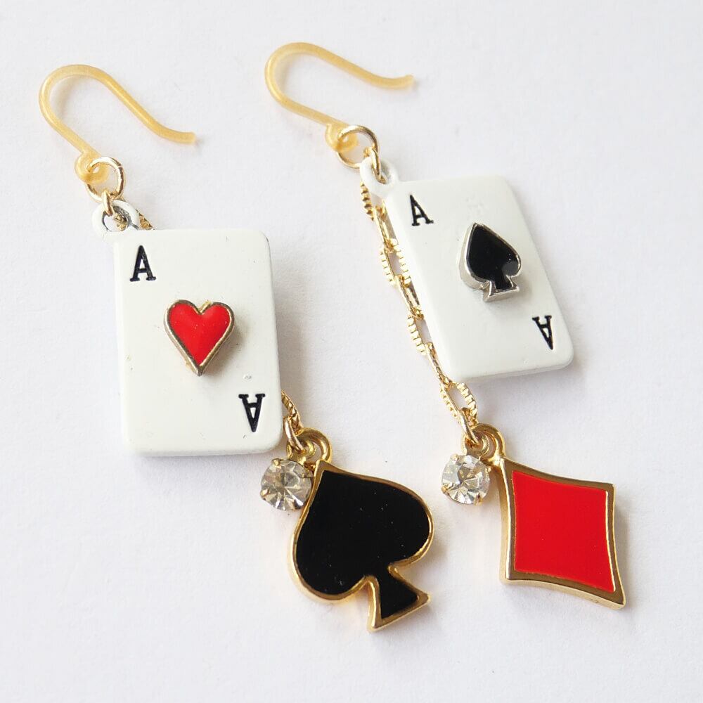 トランプのハート、スペード、ダイヤのパーツをリメイクした、ユニークなデザインのピアス。