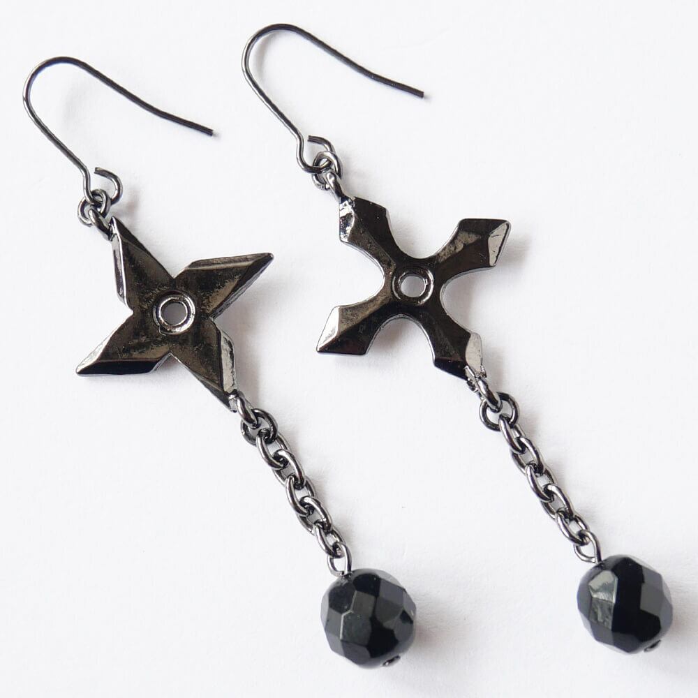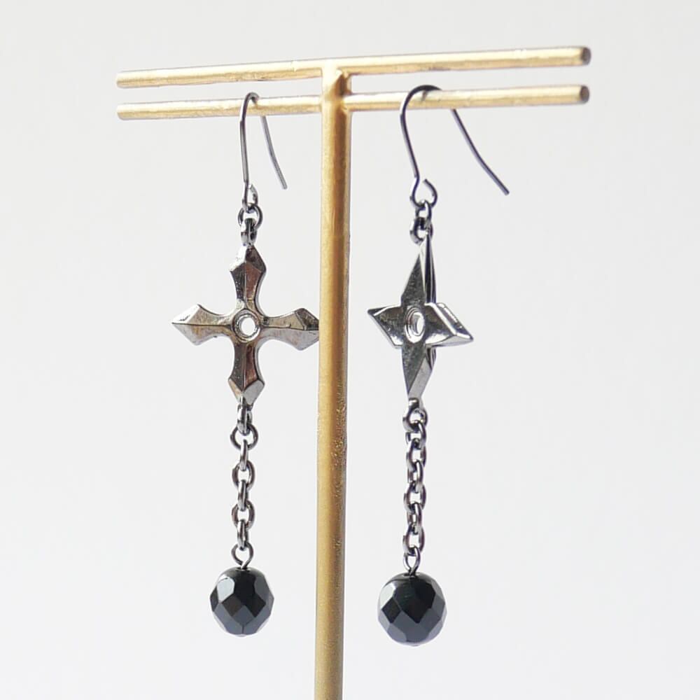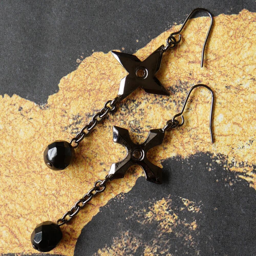 忍者の持つ煙幕玉をイメージした黒玉を下げたピアス