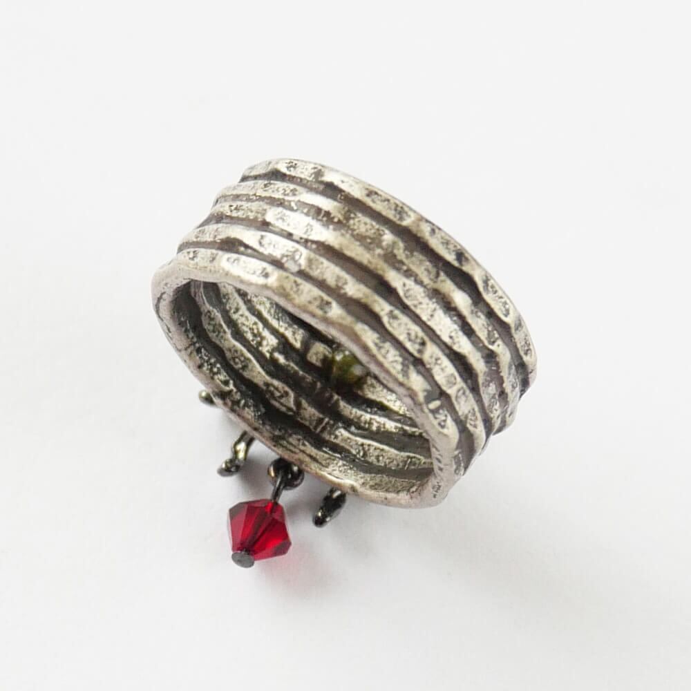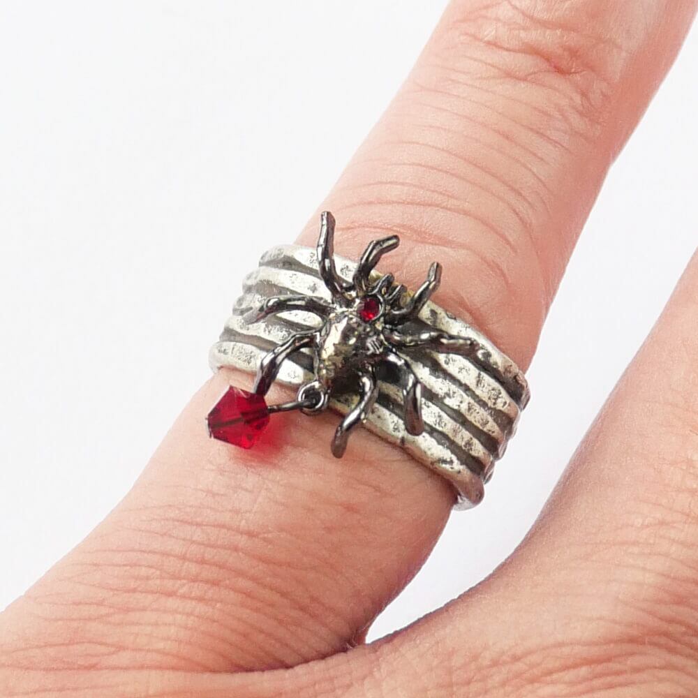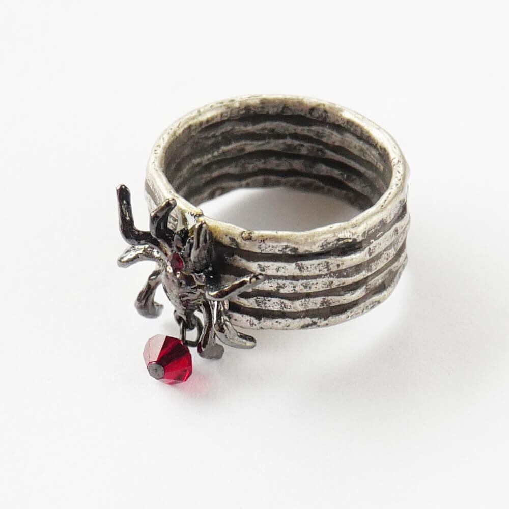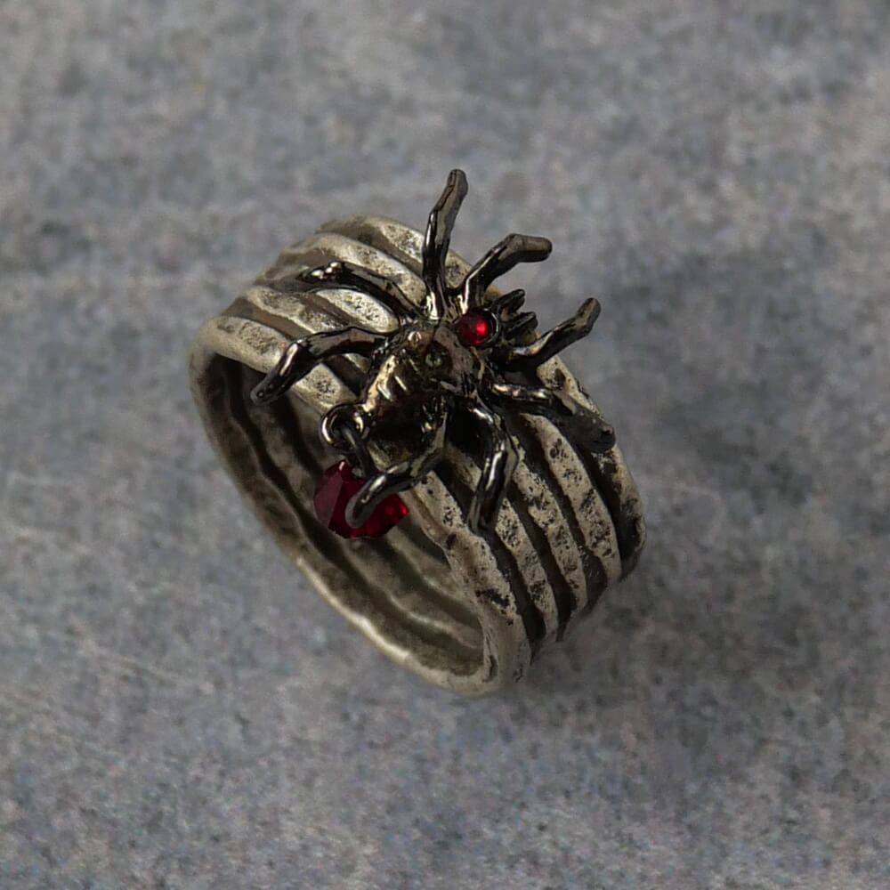 ガンメタカラーの蜘蛛にワンポイントで輝くレッドクリスタル