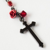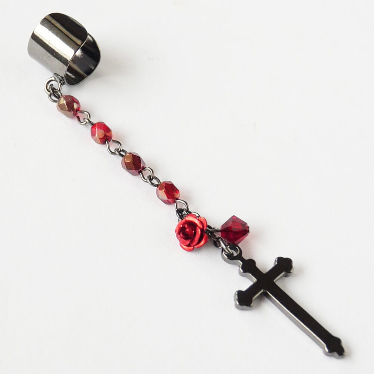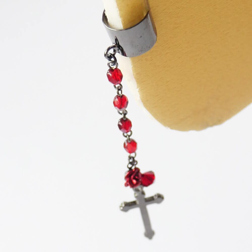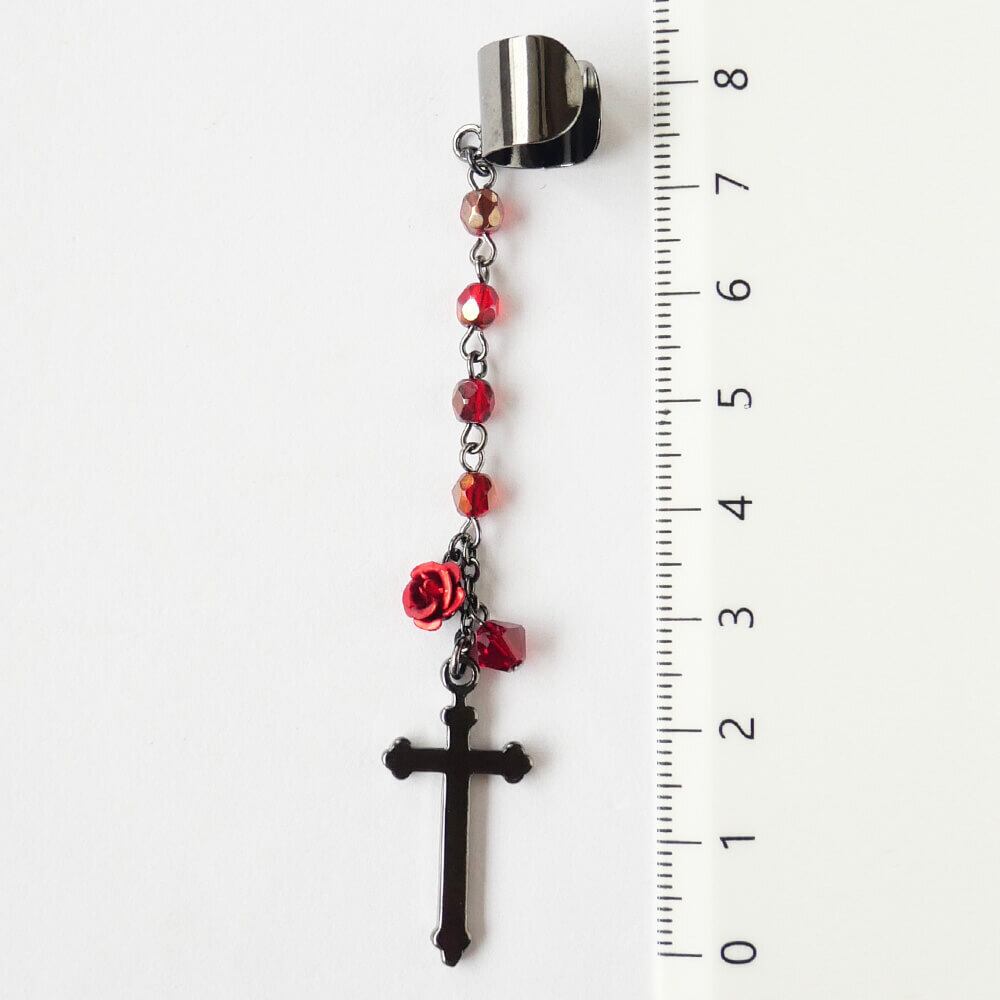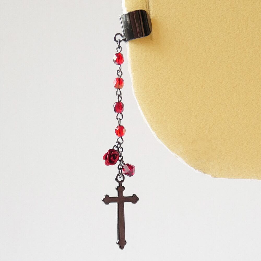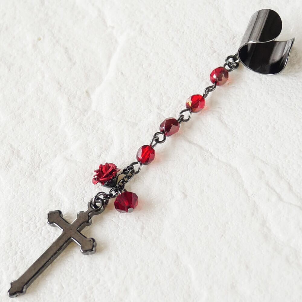 ゴシック系のシンプルクロスと赤バラのイヤカフ