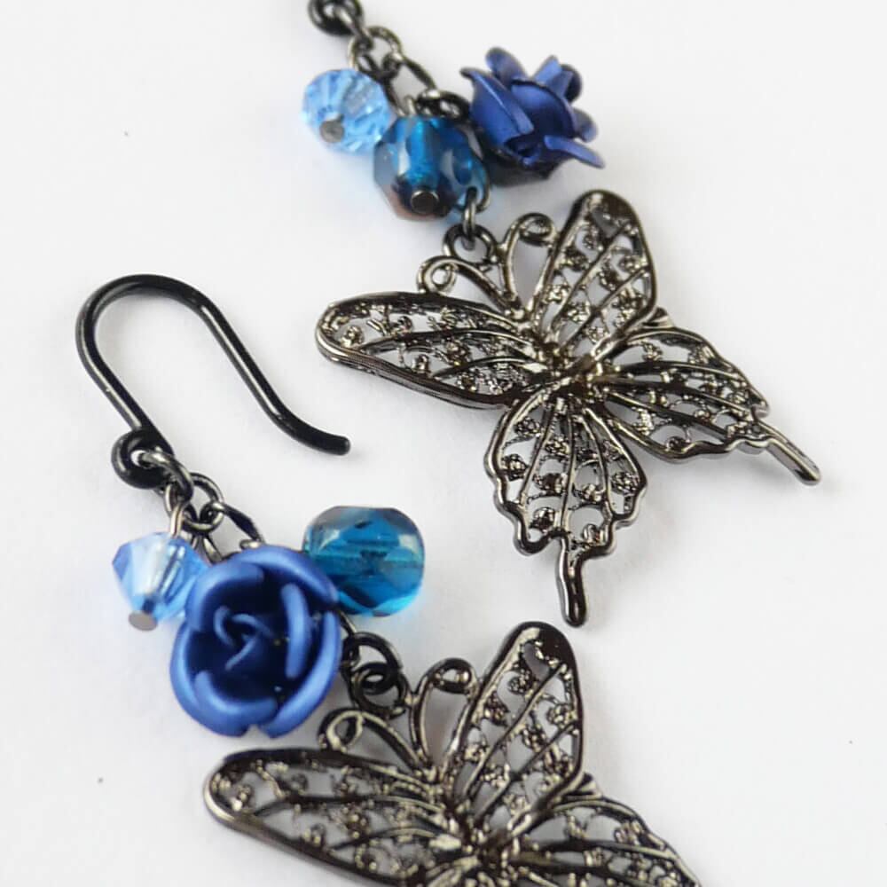 シックなガンメタ仕上げとブルー系クリスタルとチェコビーズが美しい輝きを放ち