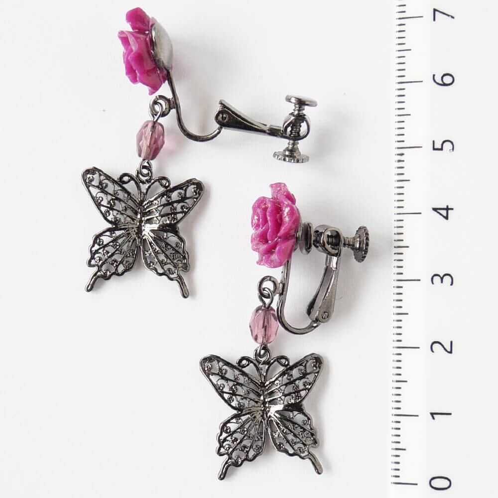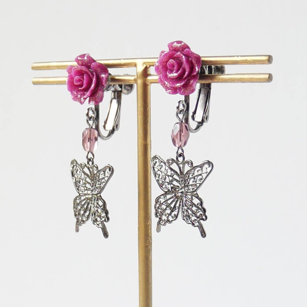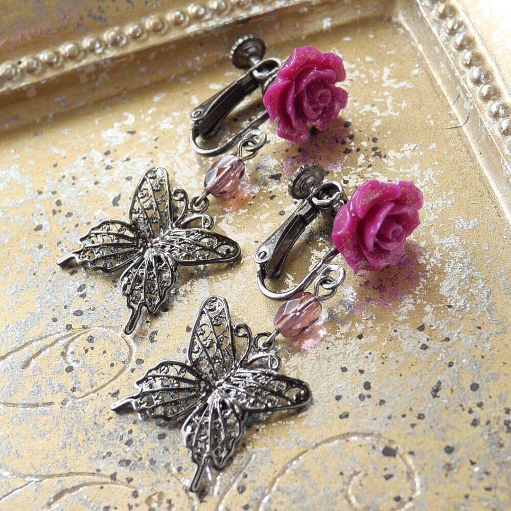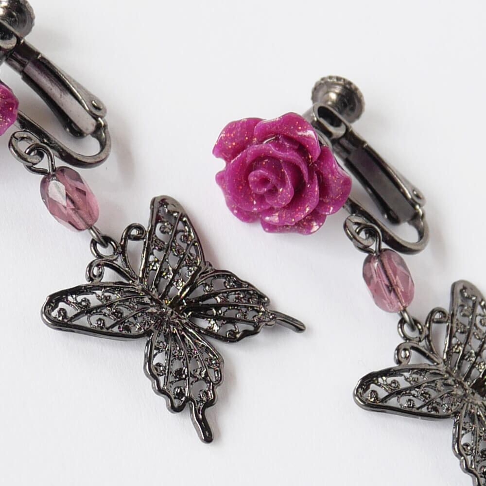 樹脂製のラメ入り紫薔薇が美しく輝き、耳元を華やかに彩ります。