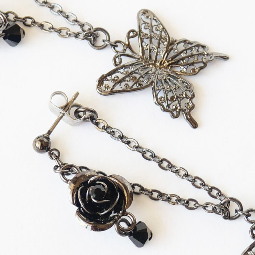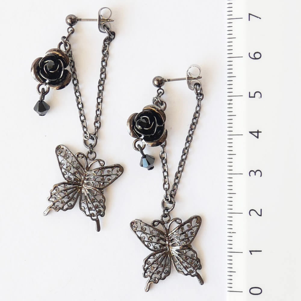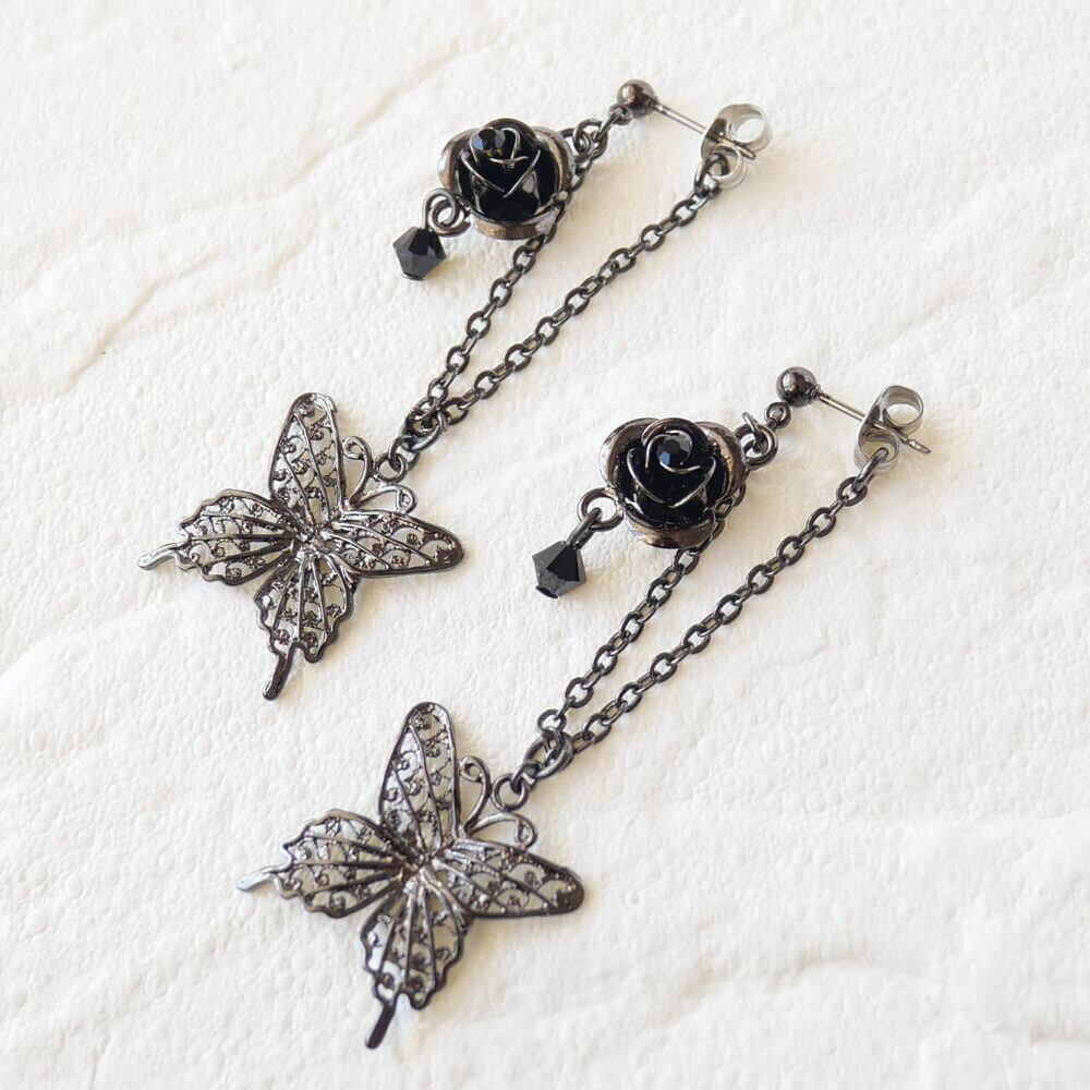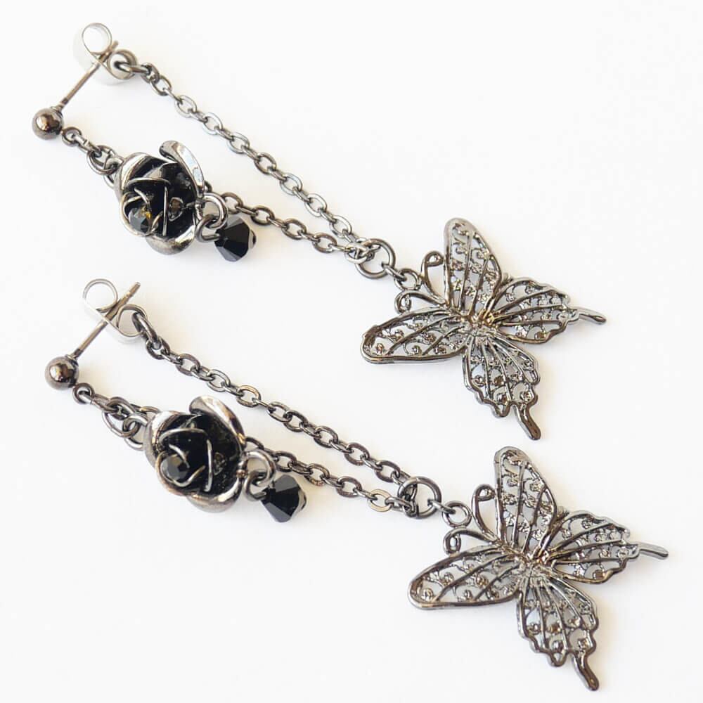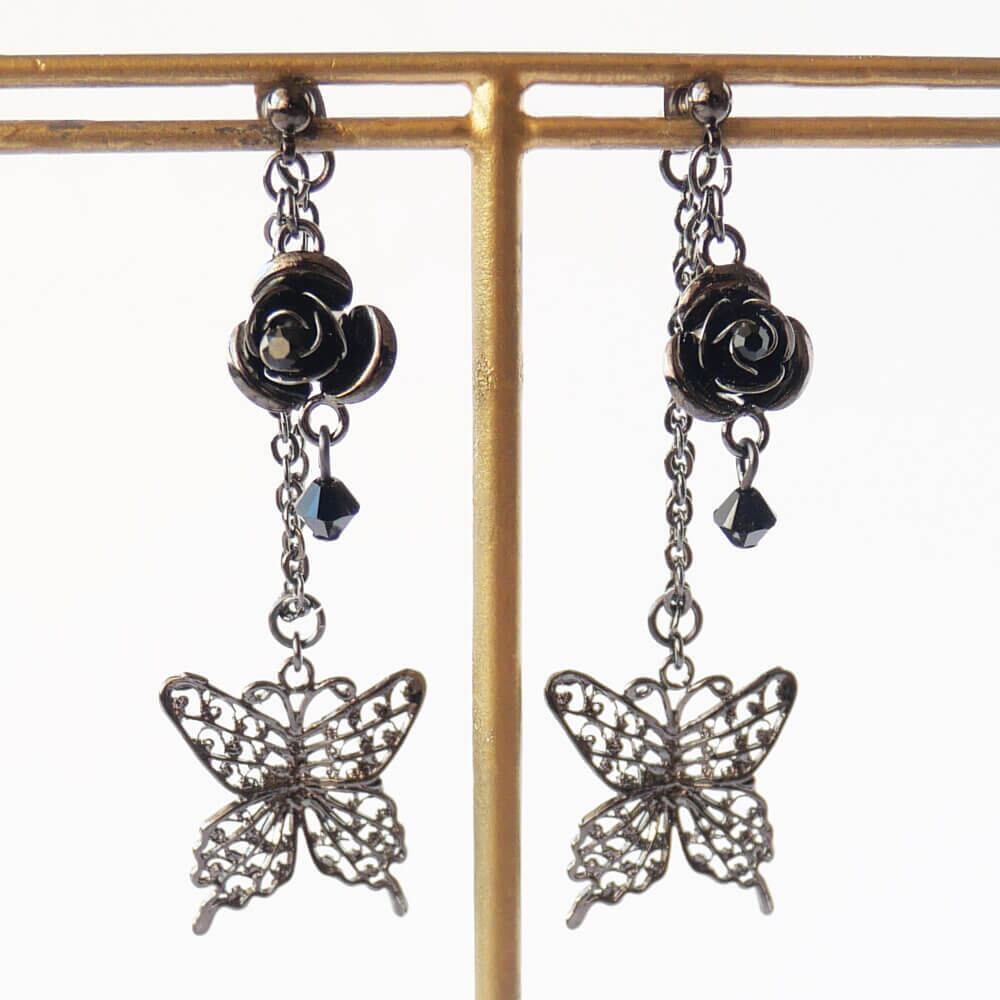 視覚的な魅力を一層引き立てる薔薇と蝶のモチーフが美しく調和したピアス