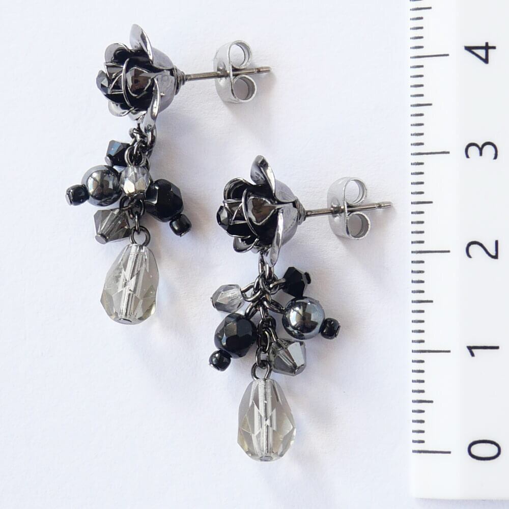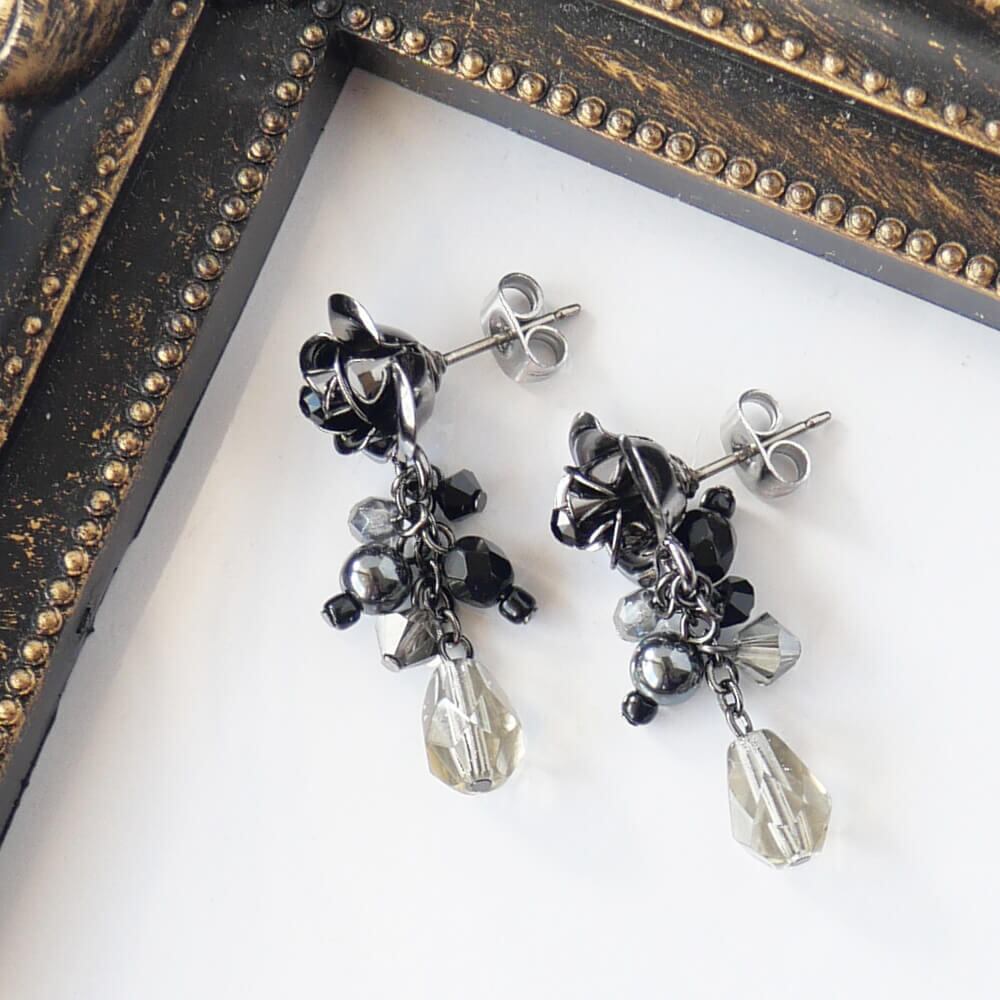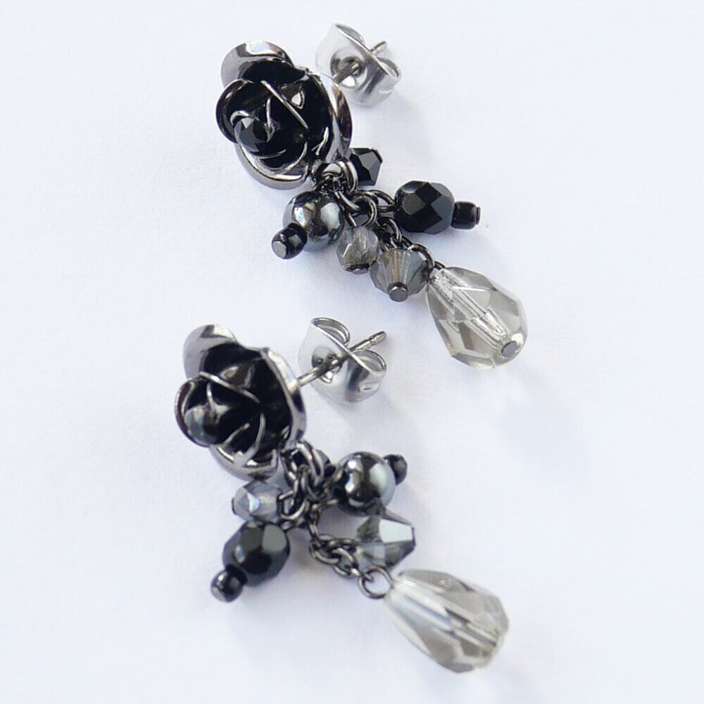 黒のストーンをのせたガンメタ仕上げの薔薇ピアス