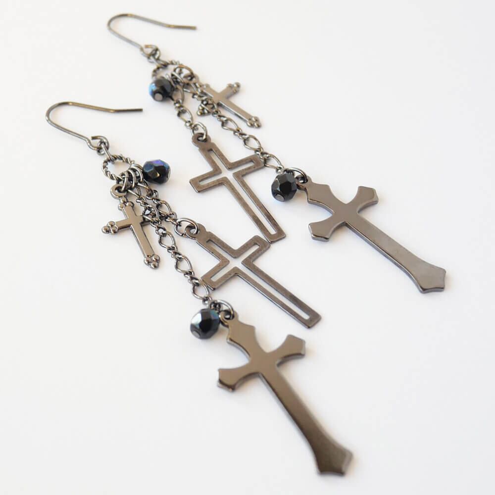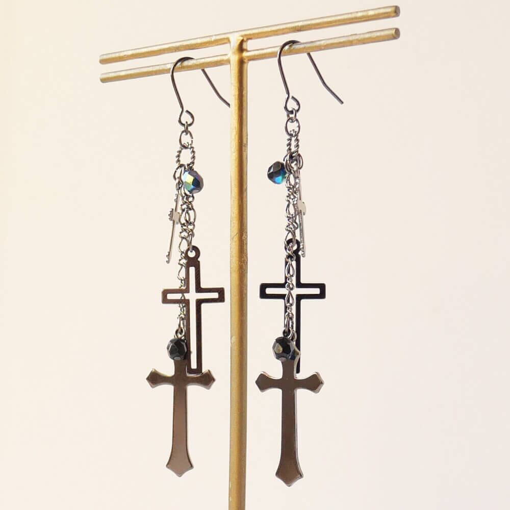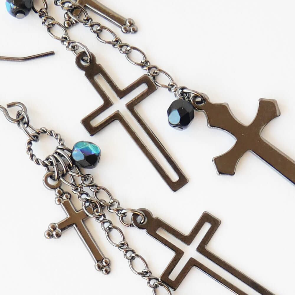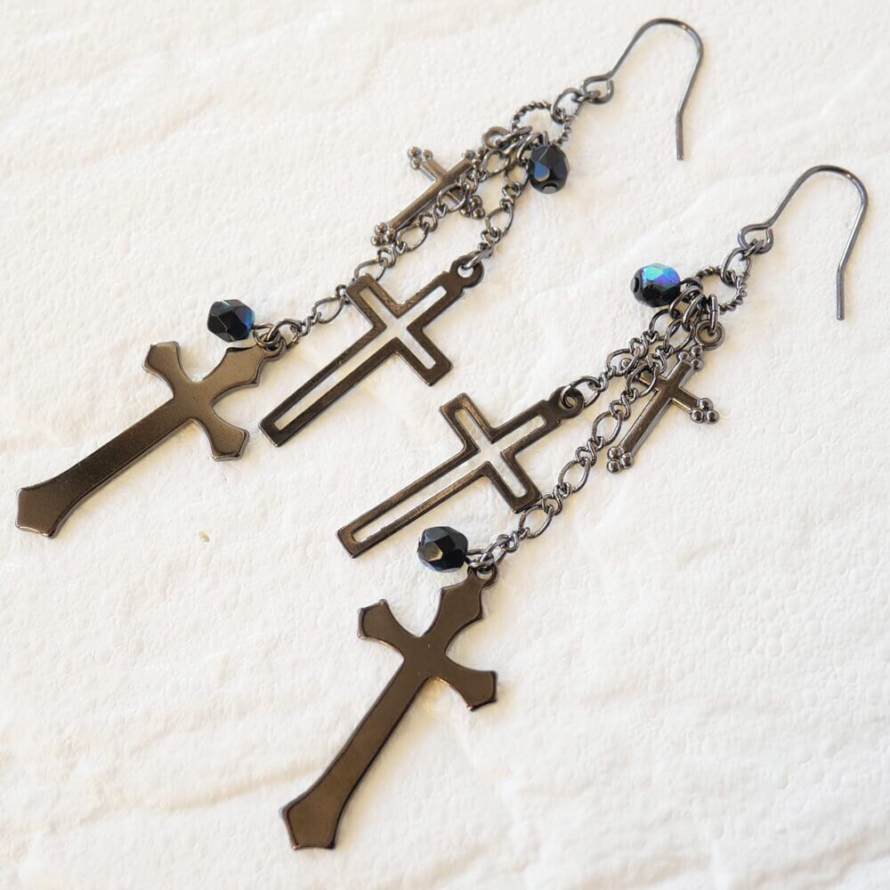 3種類の十字架とオーロラブラックのチェコビーズが揺れるロングピアス