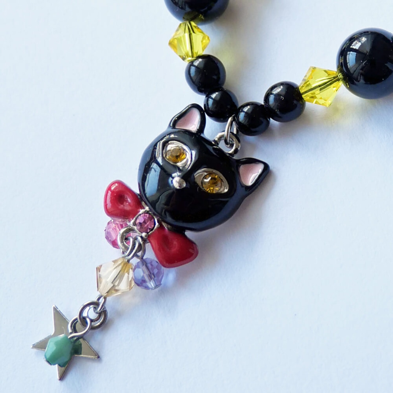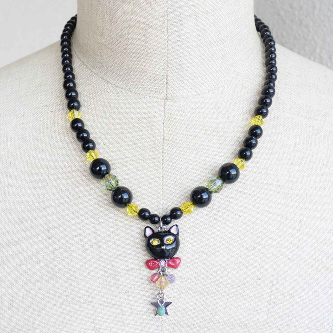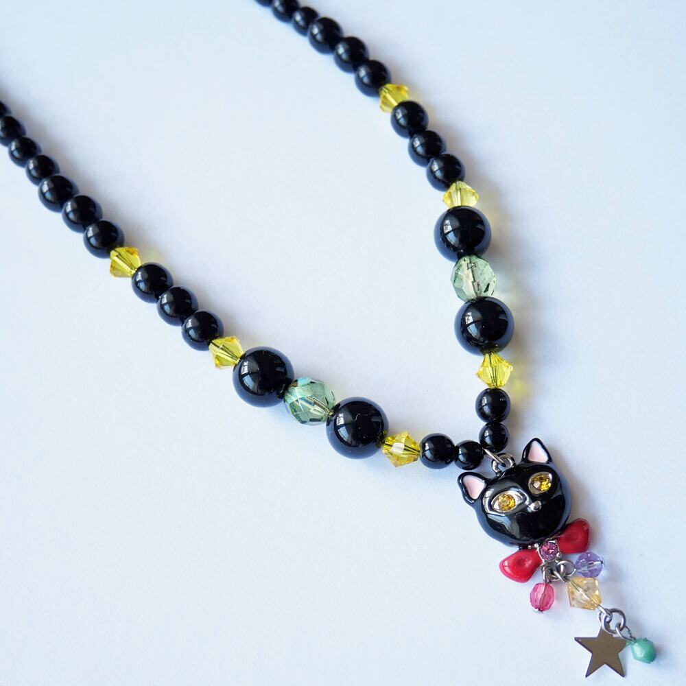 同系色のイエロー、グリーンのカットストーンと黒玉の