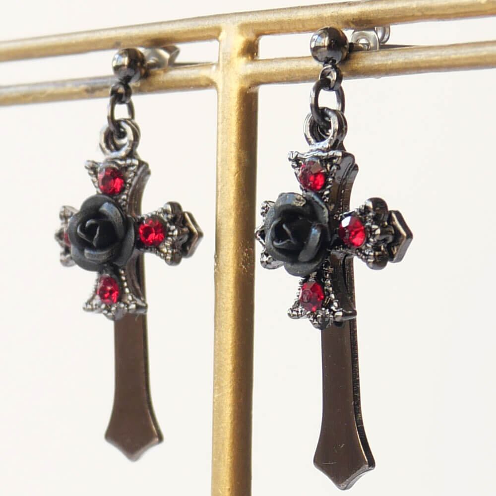 レッドストーン×ブラックローズがシックで洗練された印象を与えるゴス系ピアスです。