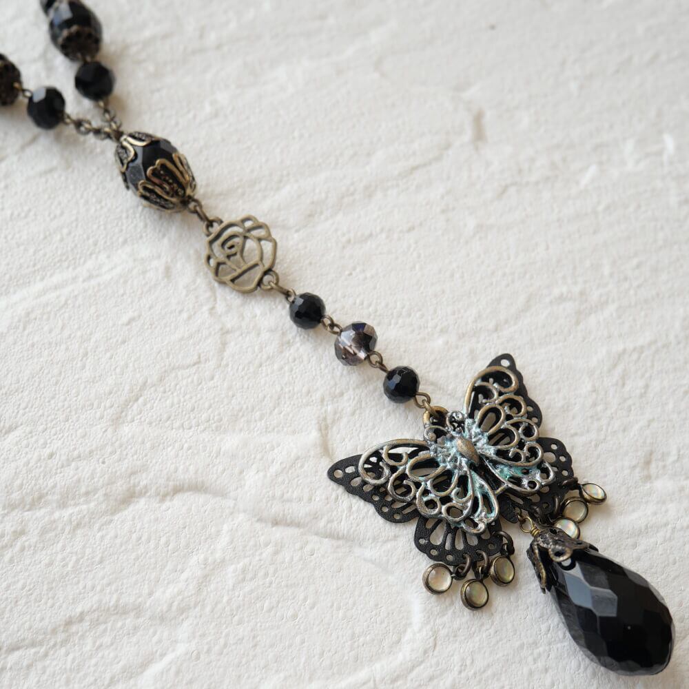 2種類のアンティクチェーンにカットブラックストーンを使ったネックレス
