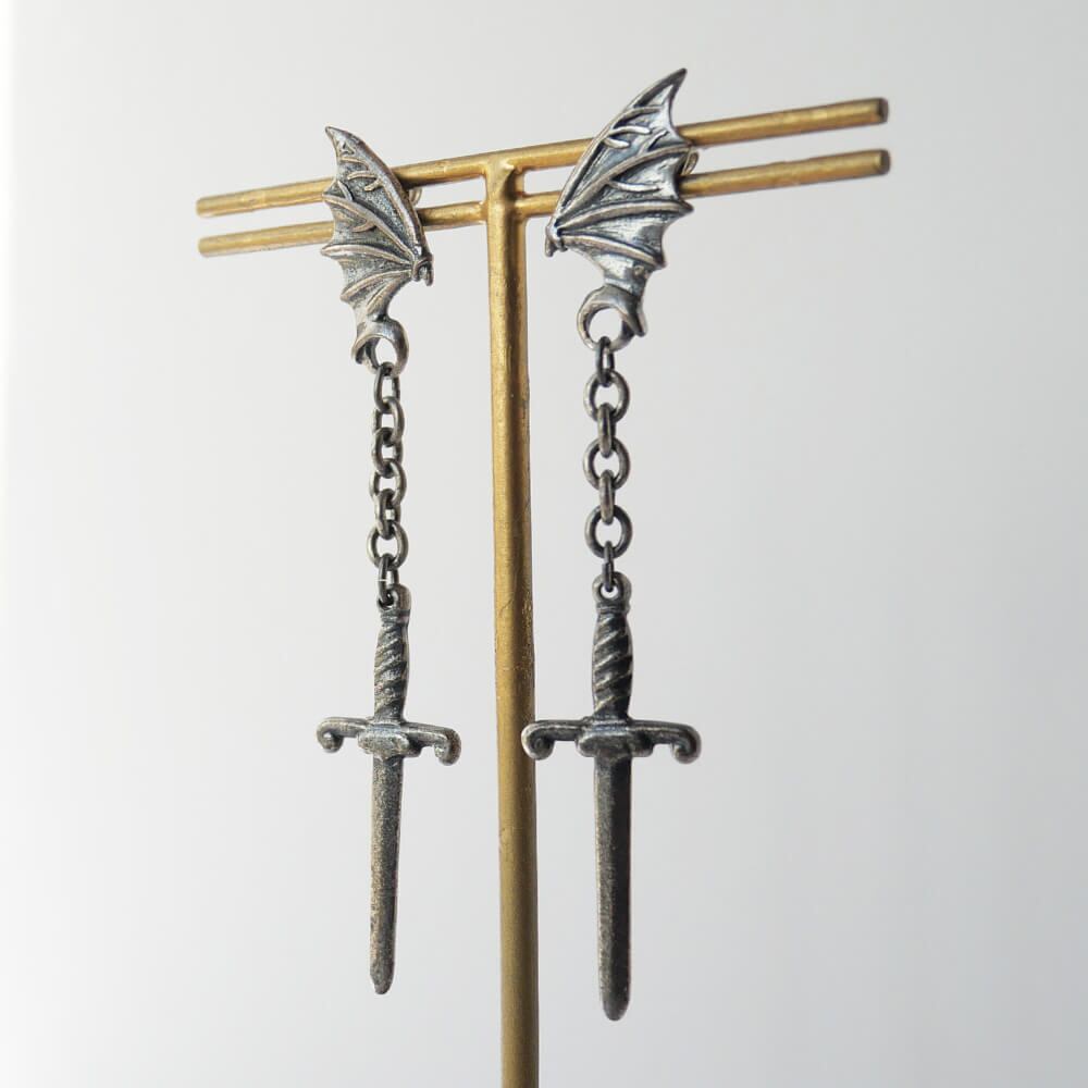 ハードなチェーンから下がる剣が、ミステリアスな印象を与えます。