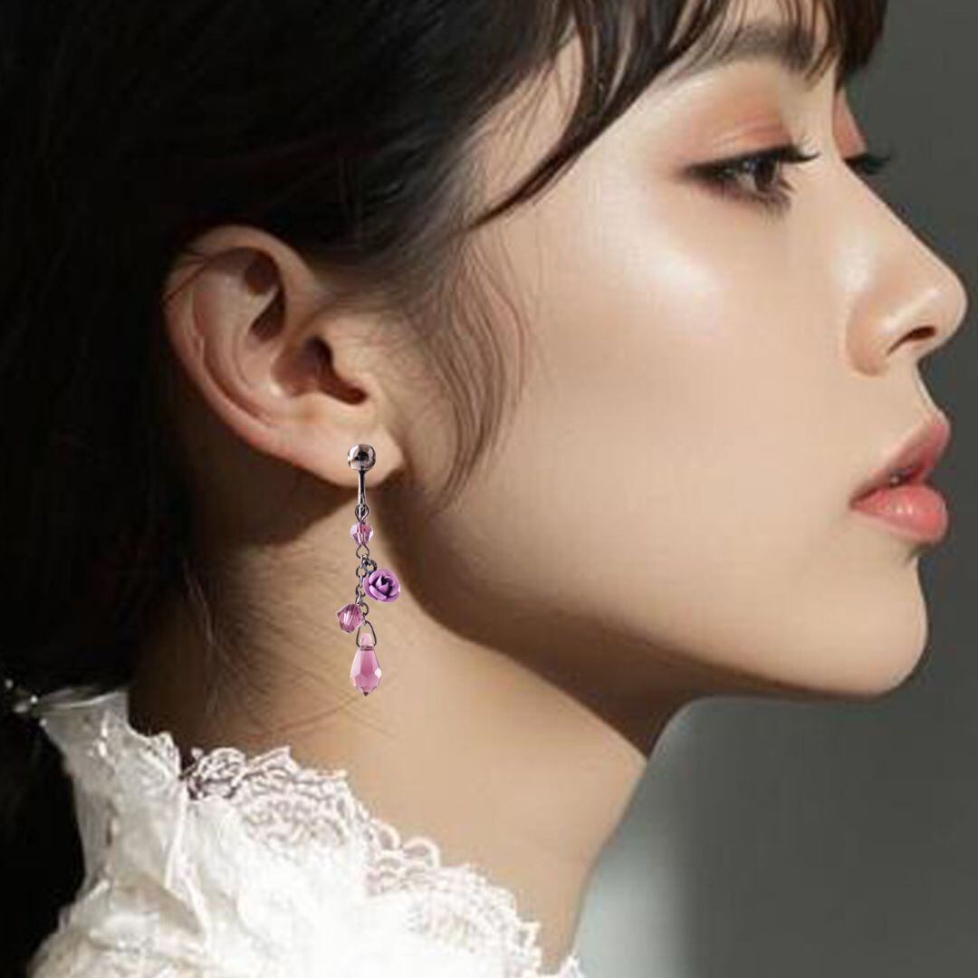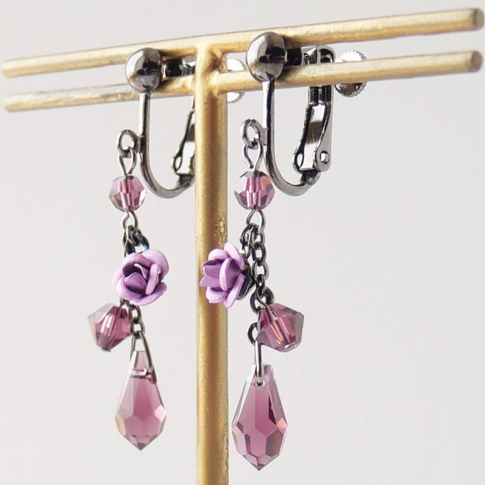 パープル系のクリスタルと紫薔薇の下、しずく型のカットガラスが耳元で優雅に揺れます。