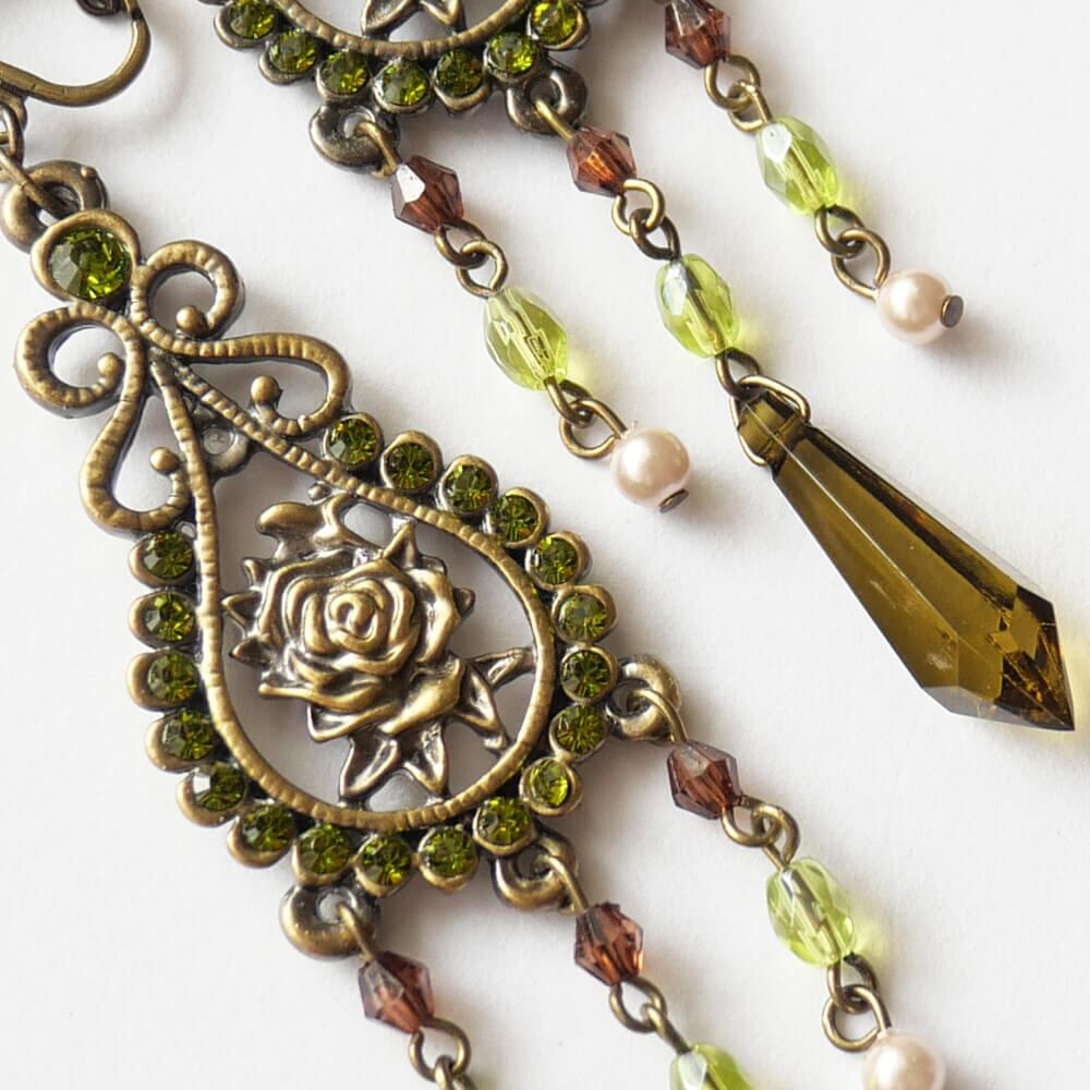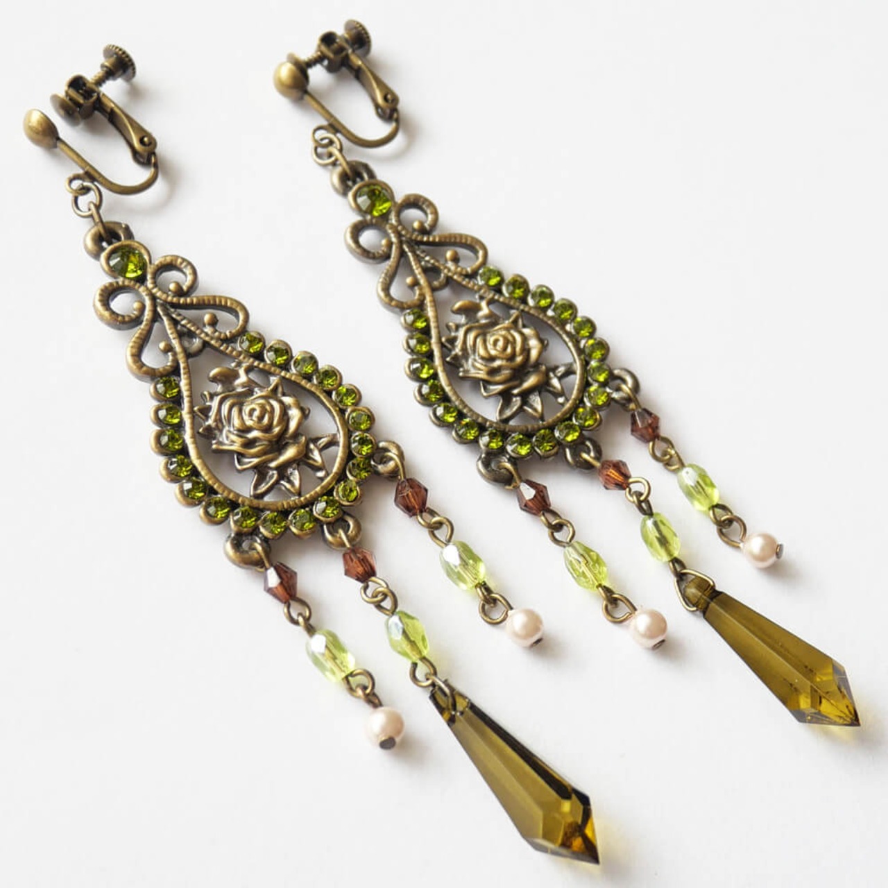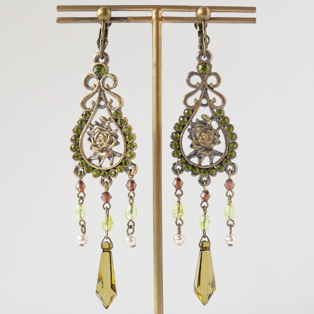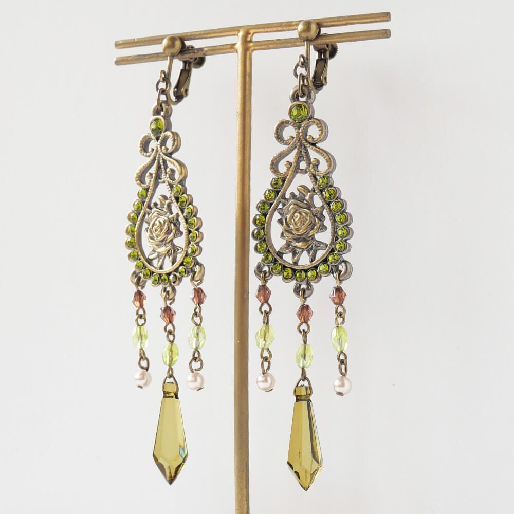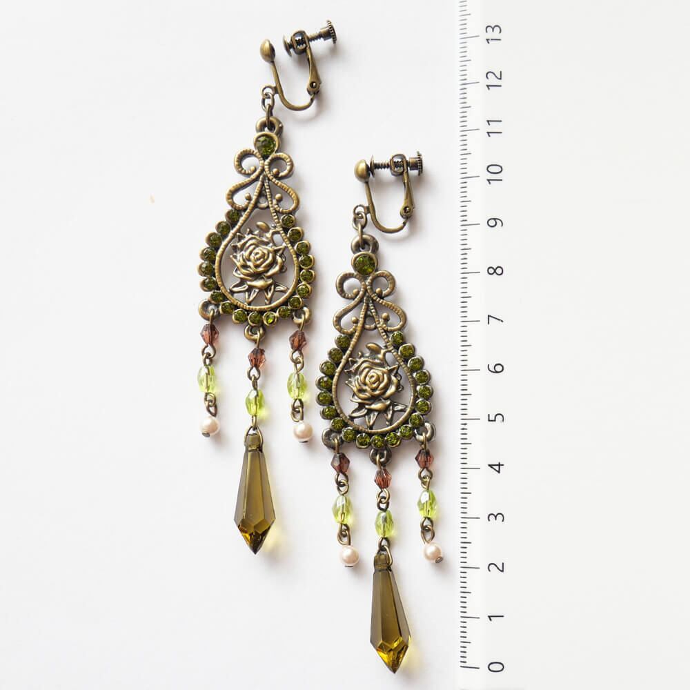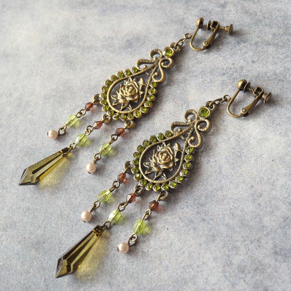 アンティーク イヤリング ゴシック グリーン ストーン ローズ