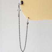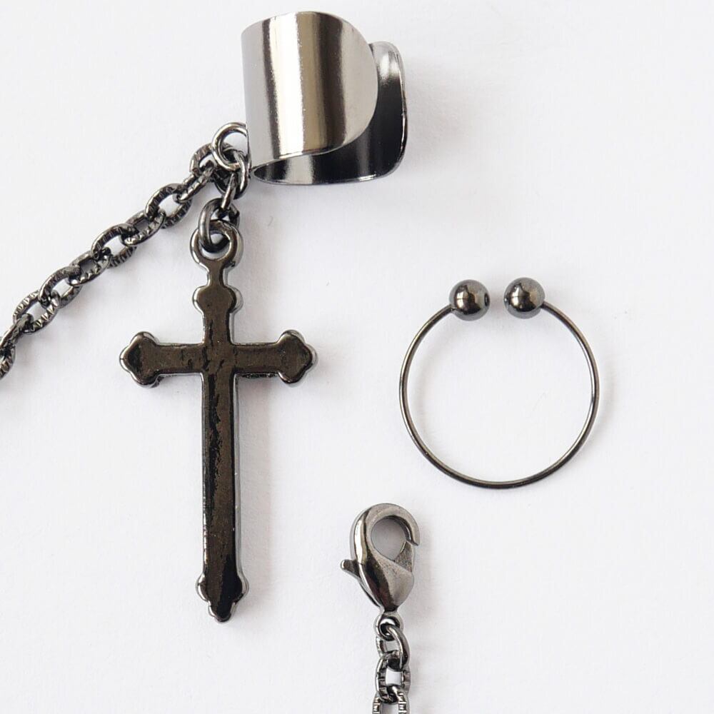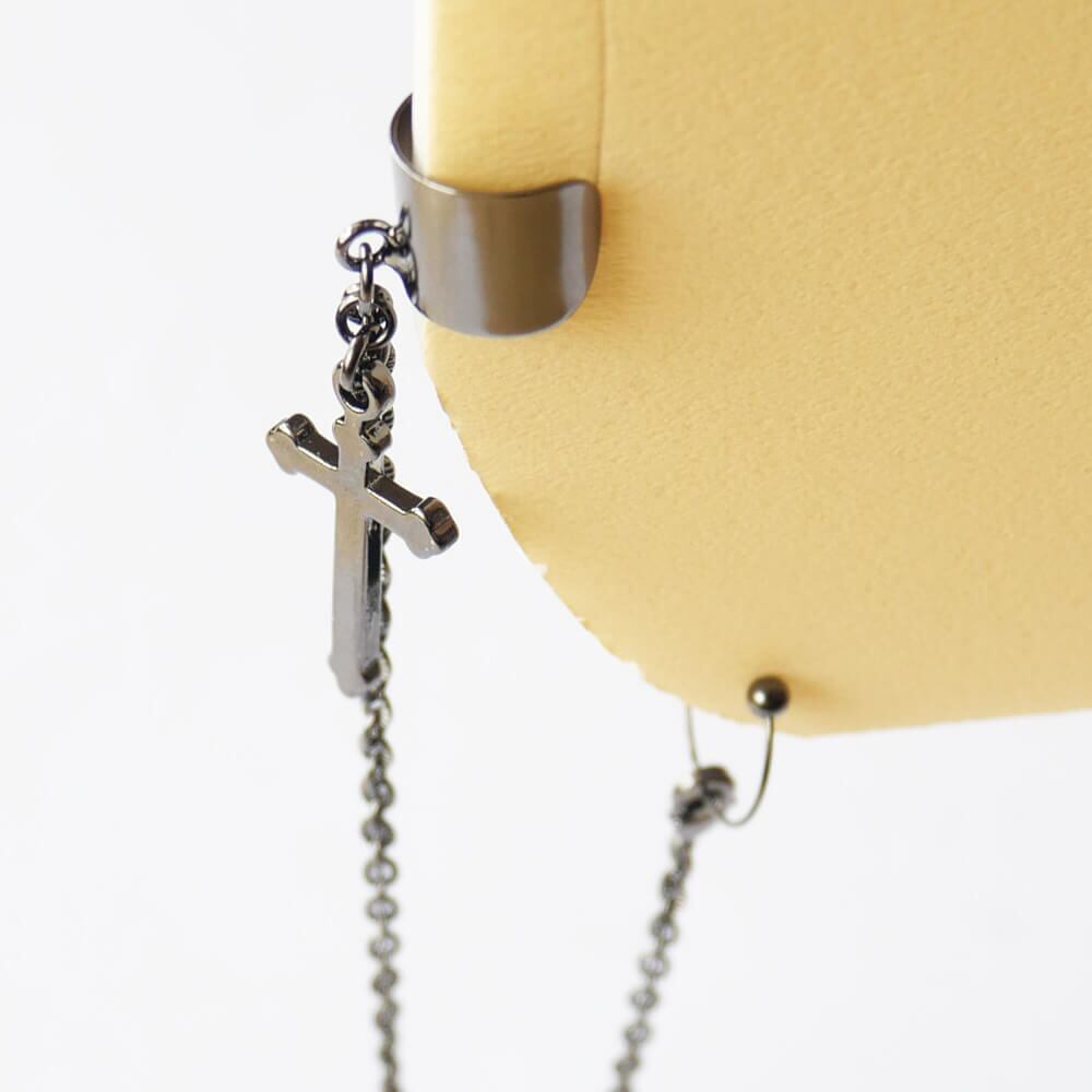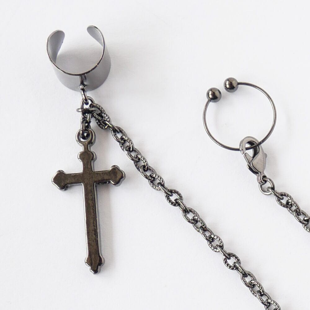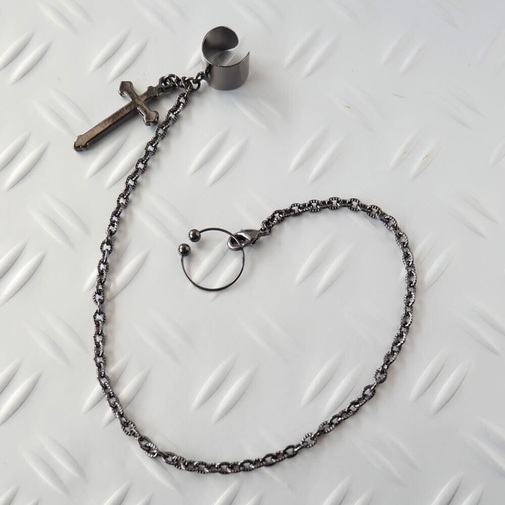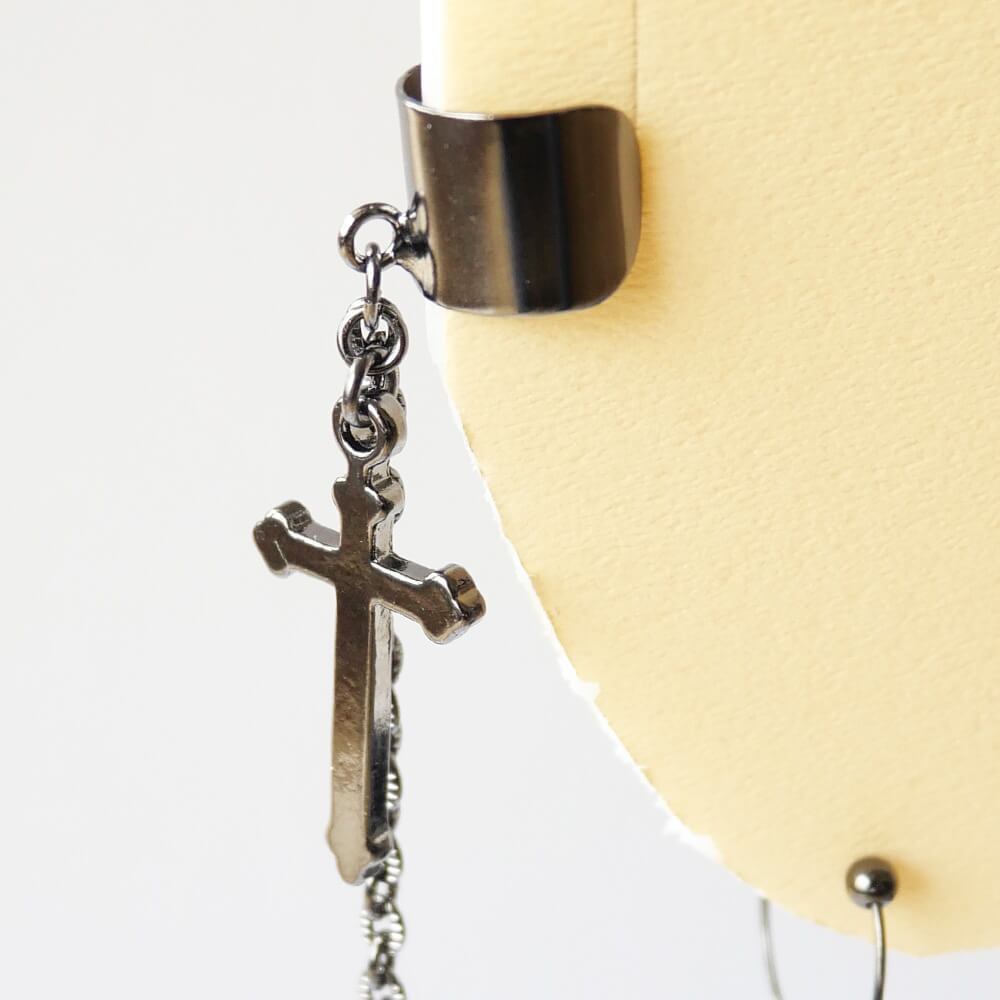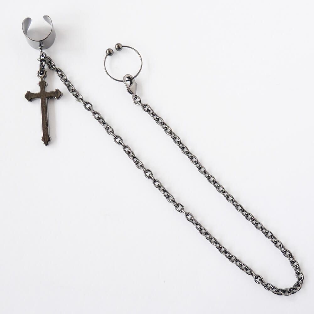 【ダミーピアス付】十字架イヤカフ&チェーン ガンメタ