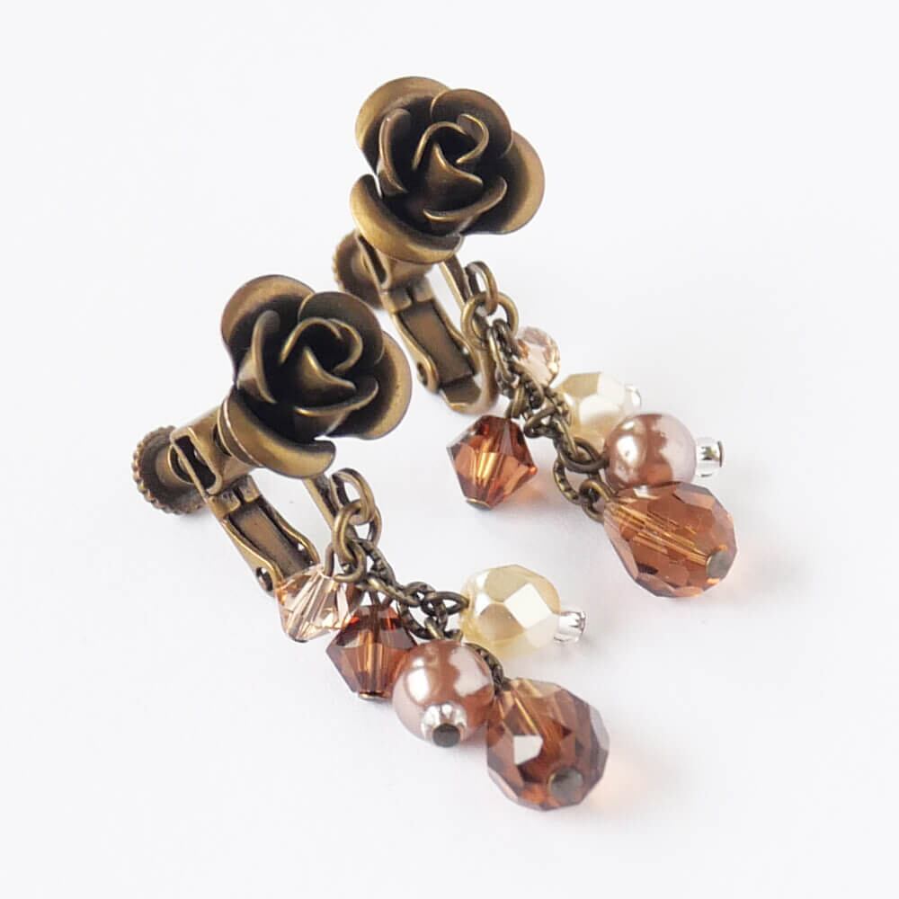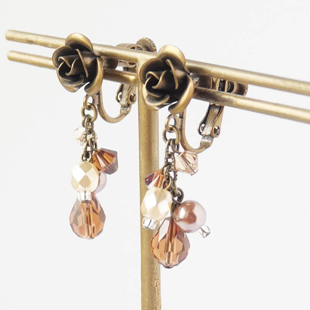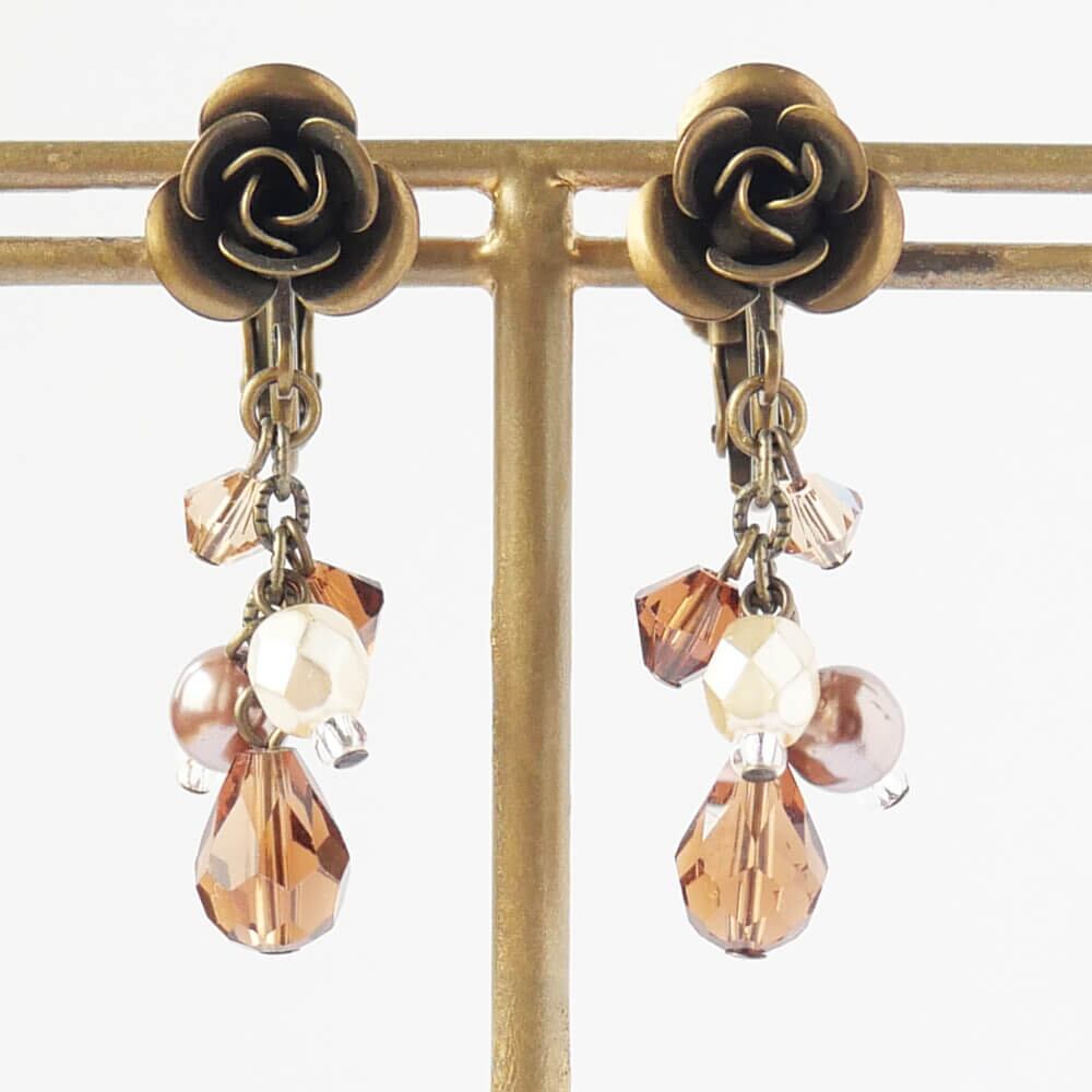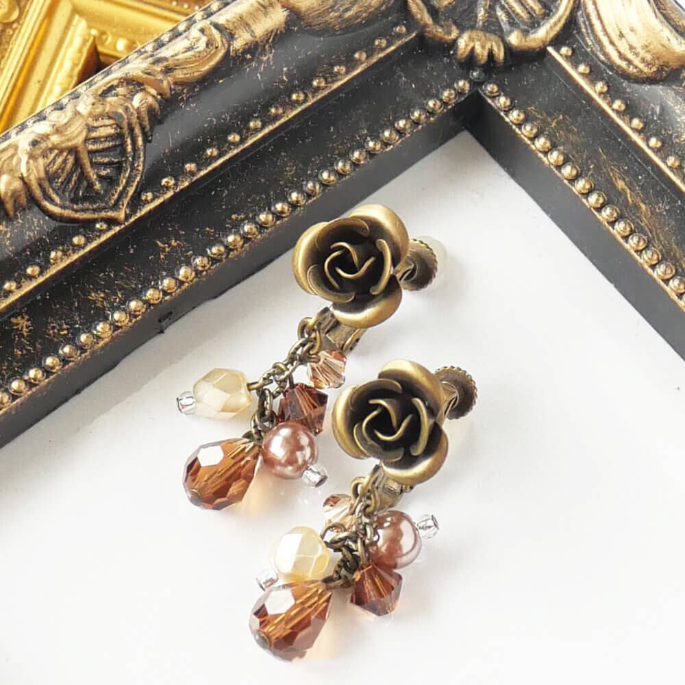 秋冬の装いに合わせたアンティークゴールド仕上げの薔薇イヤリング