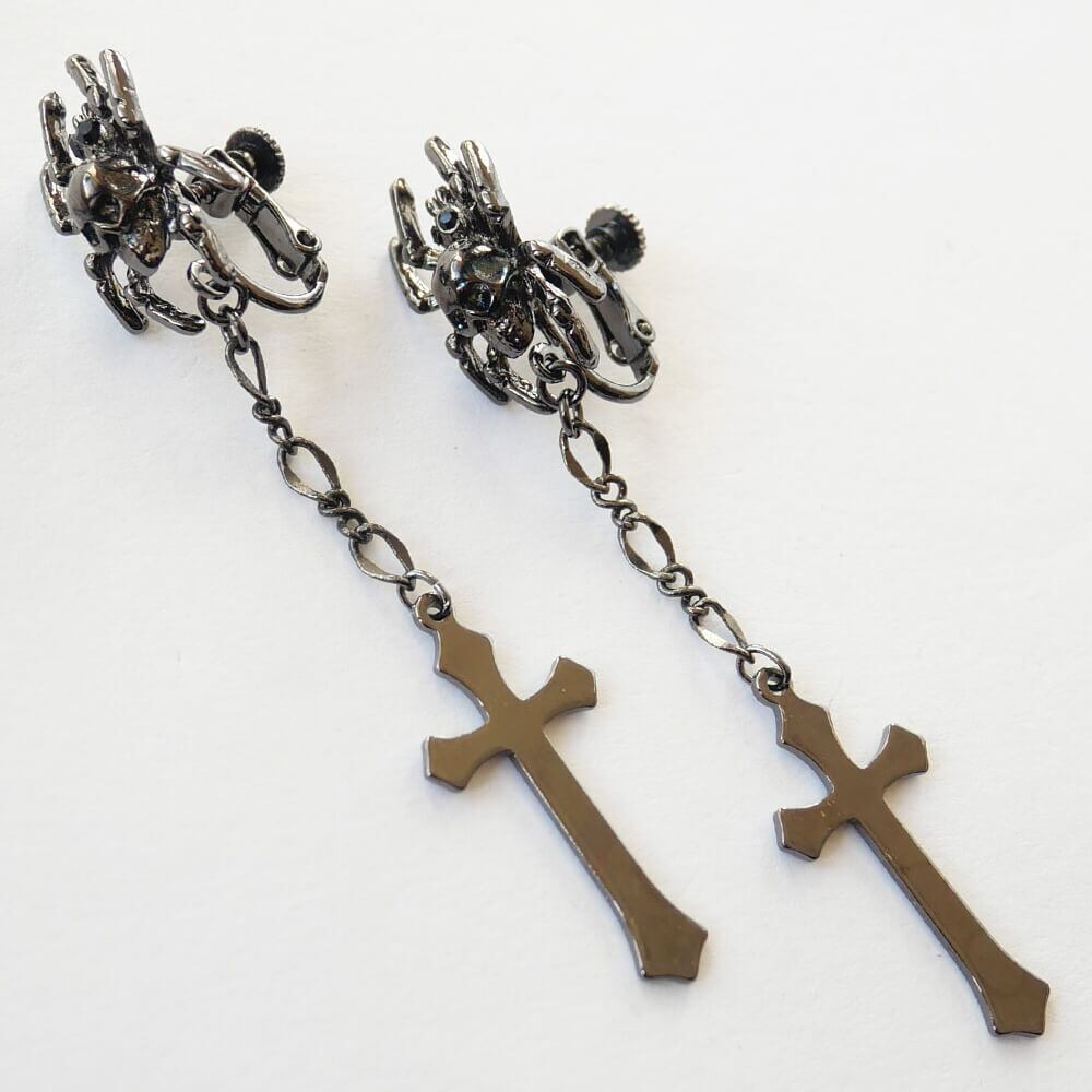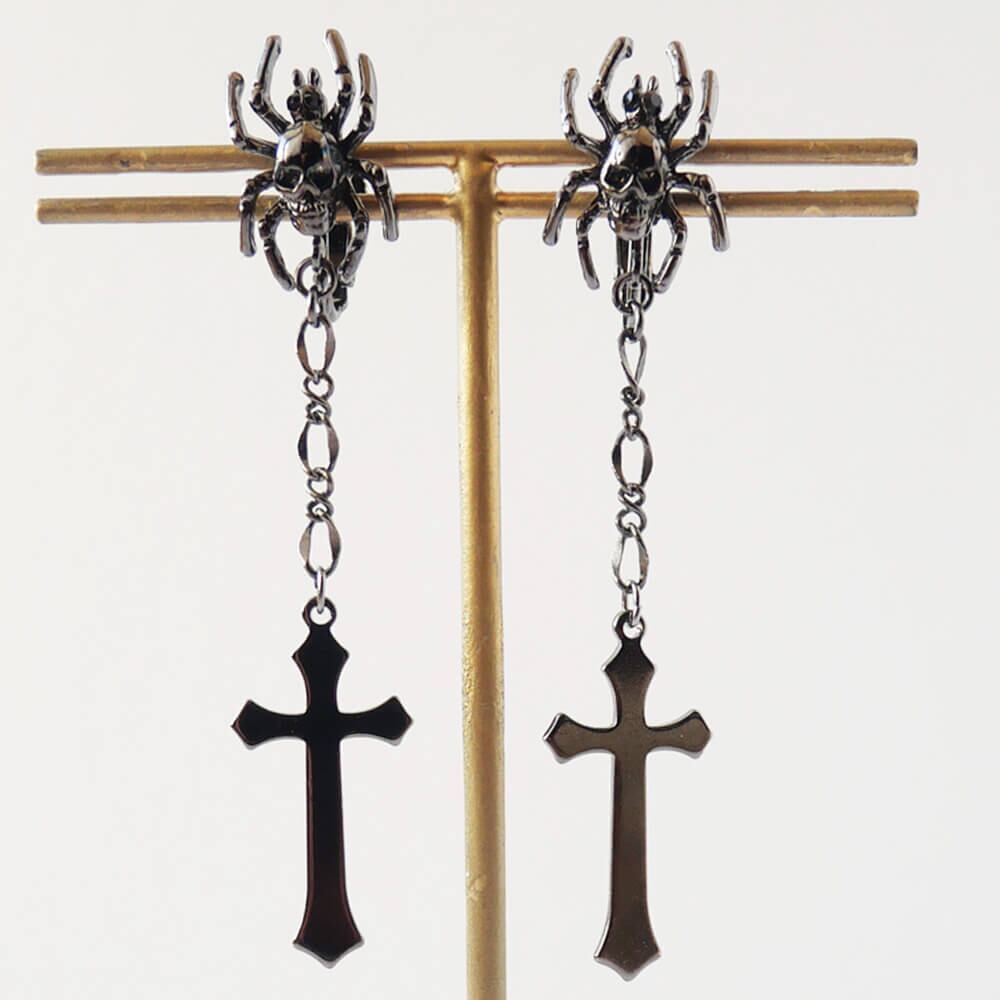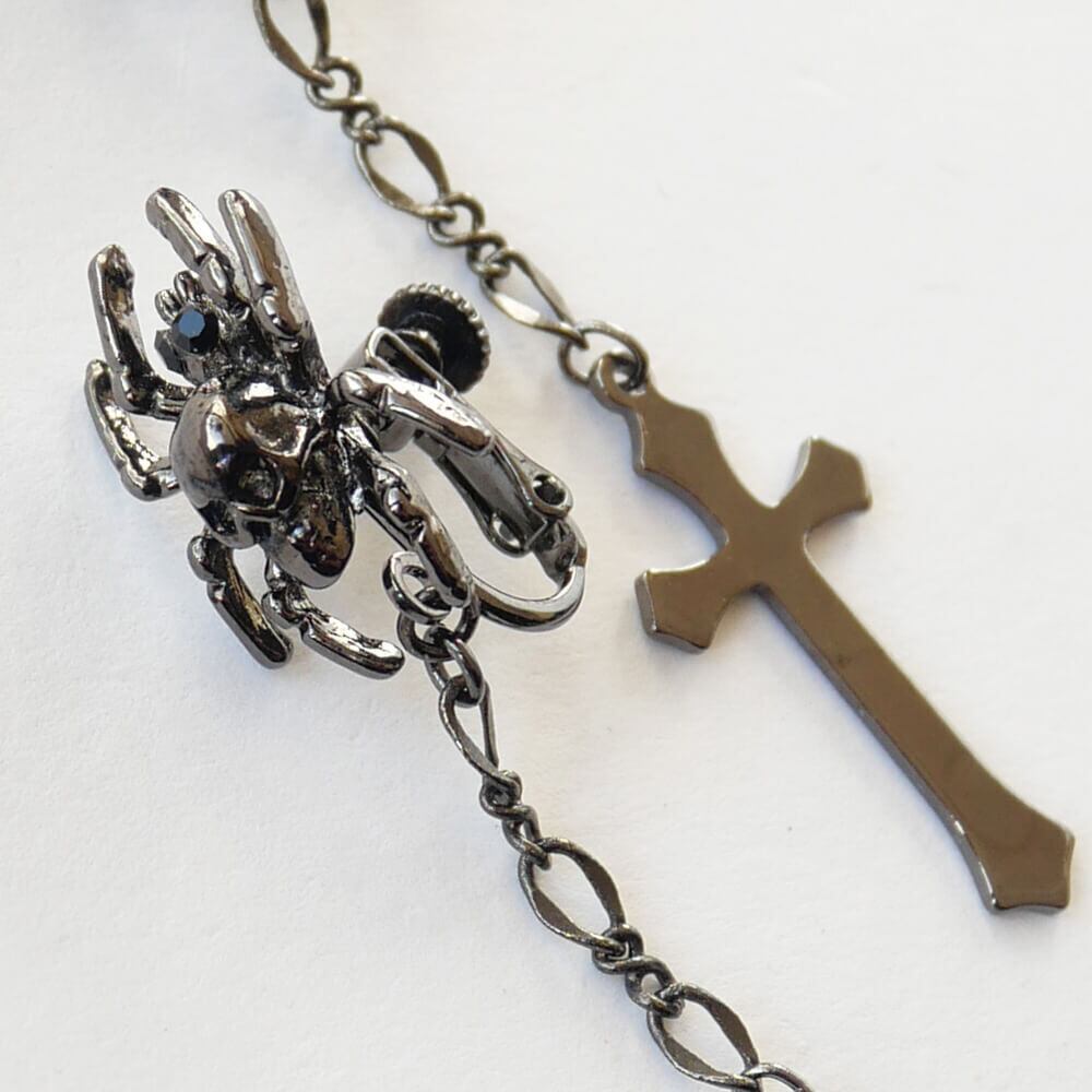 ドクロを背負った蜘蛛のデザインのイヤリング、ハードチェーンから下がる十字架