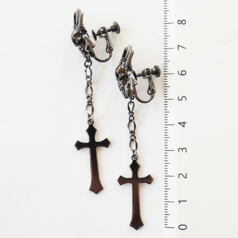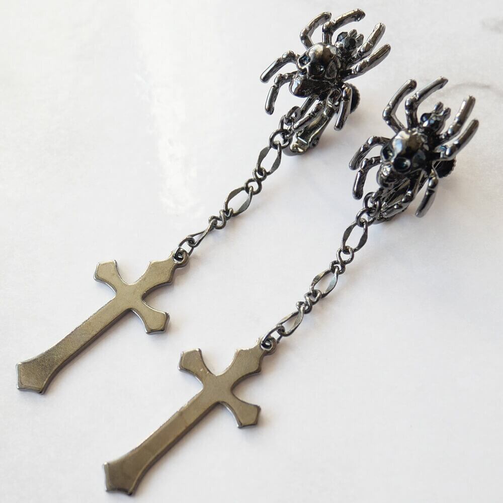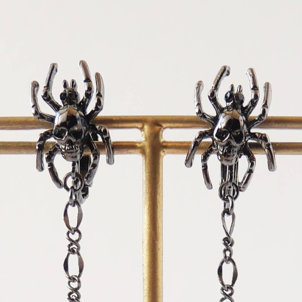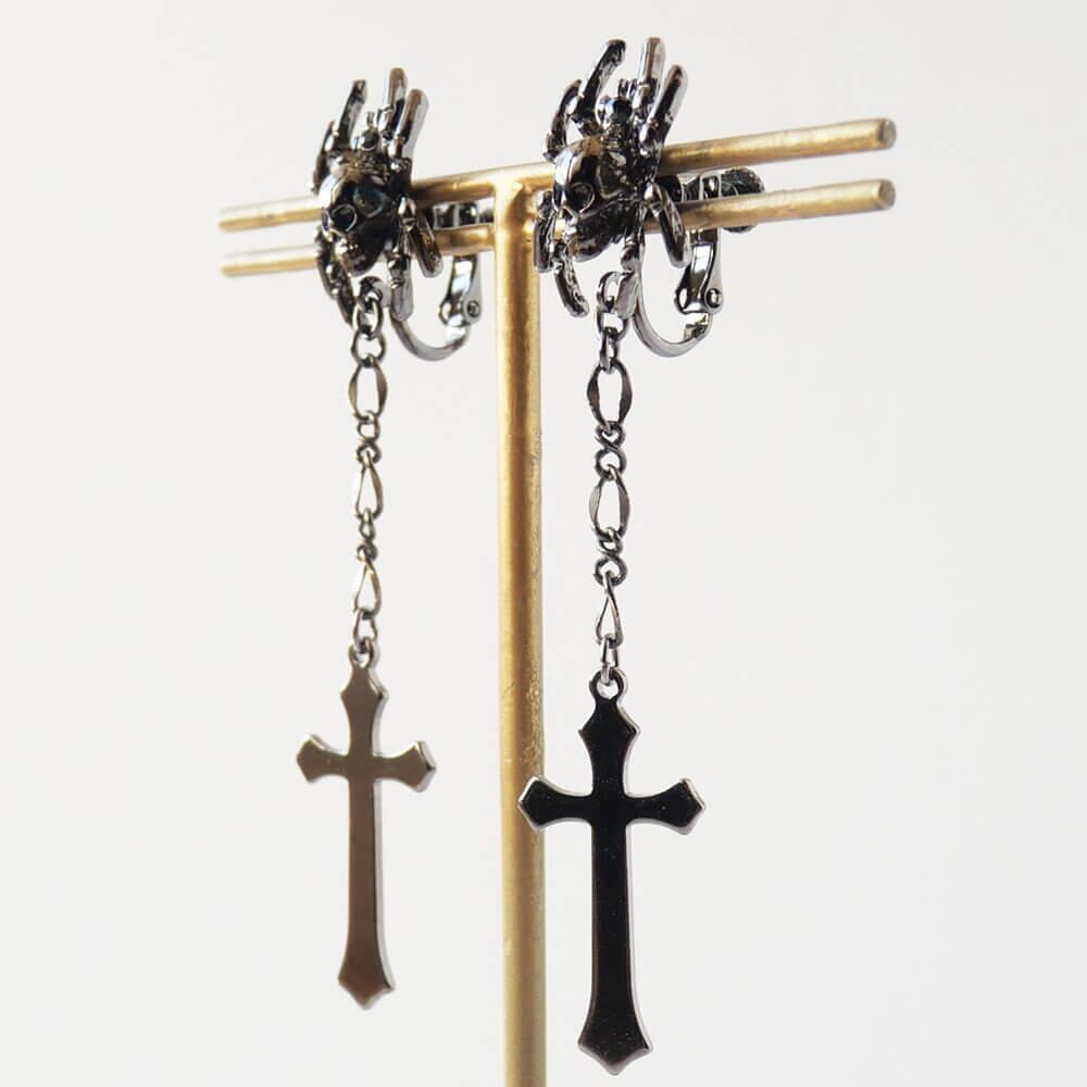 ドクロを背負った蜘蛛のデザインのイヤリング、ハードチェーンから下がる十字架