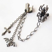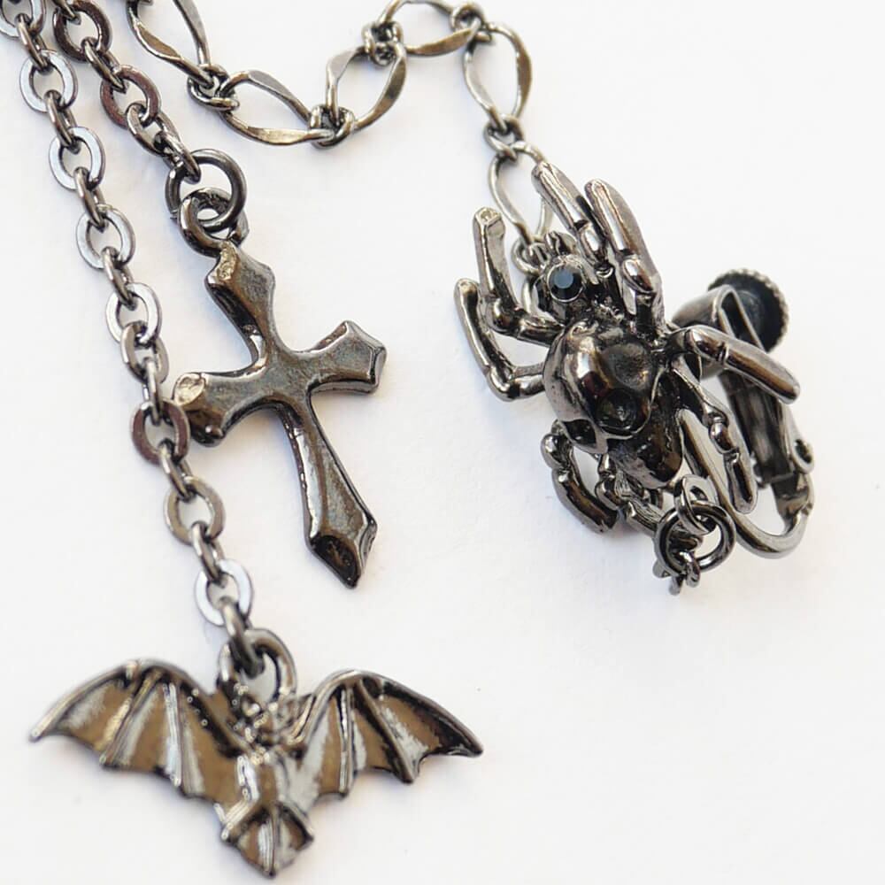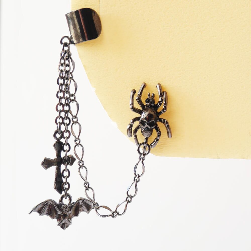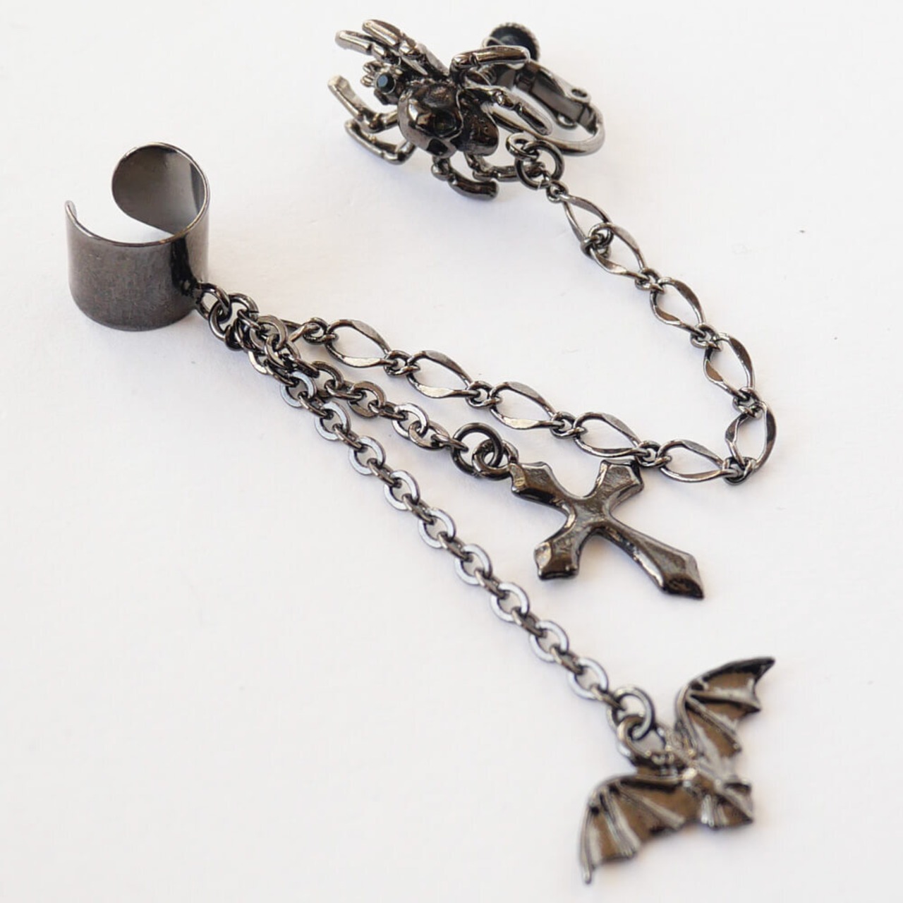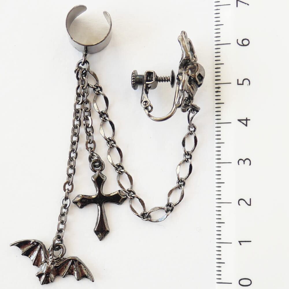 イヤーカフから下がる2本のチェーンには、蝙蝠と十字架が揺れて、ゴス系のガンメタ仕上げが全体にシックな印象を与えます。