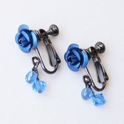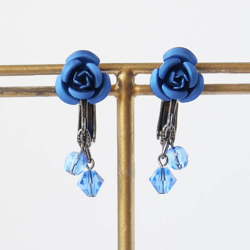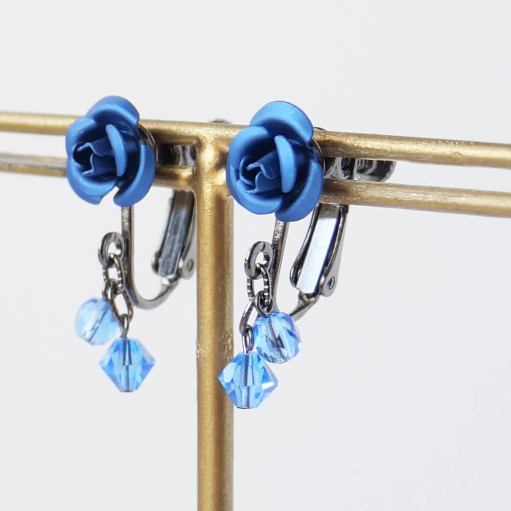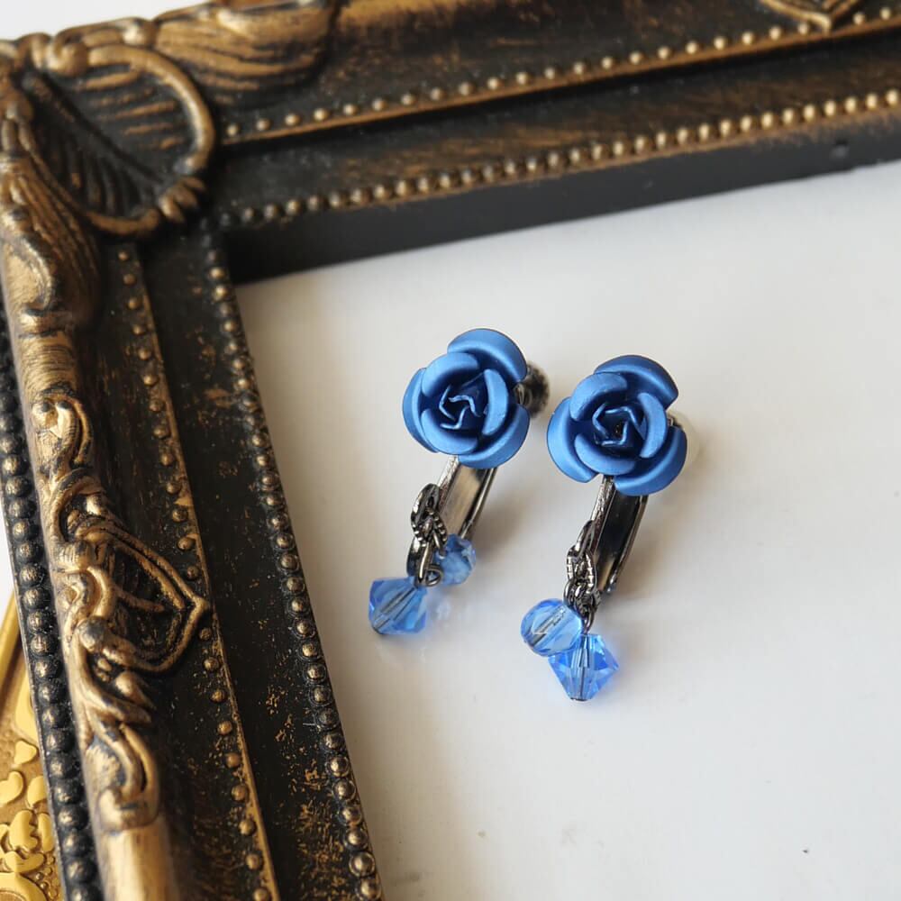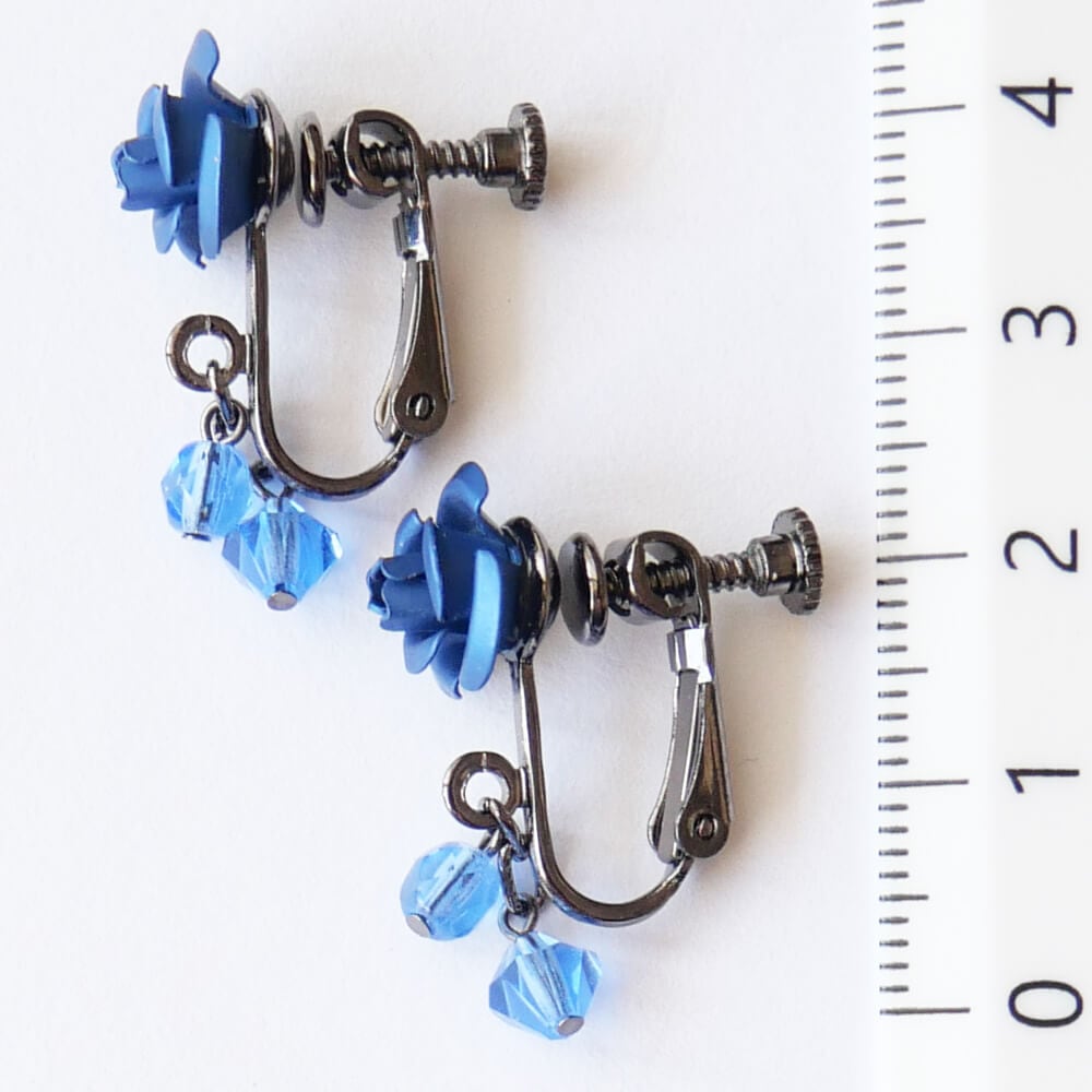 ブルー チェコ クリスタル 青薔薇 ローズ ガンメタ イヤリング