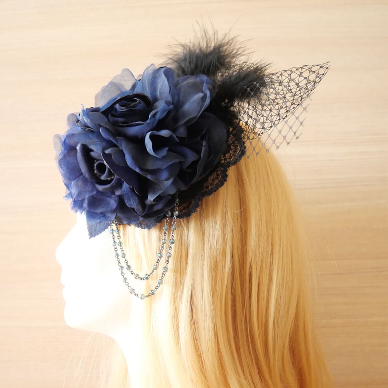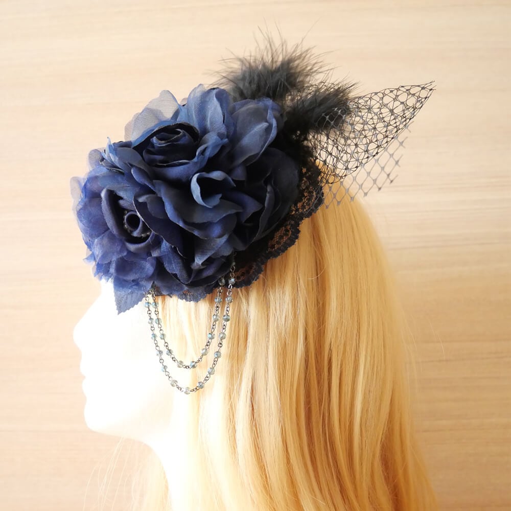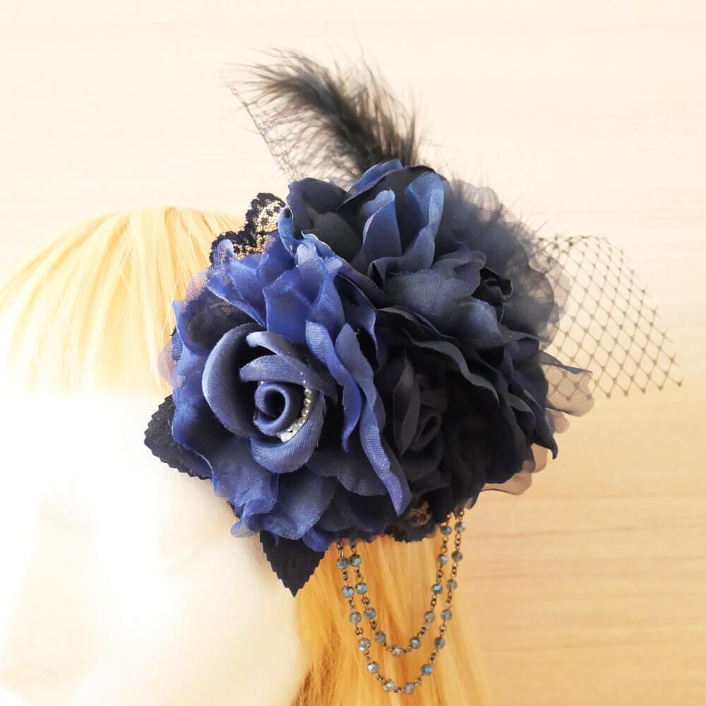 ブルーのフラワーをモチーフにヘアアクセサリーは、ゴスロリ系のヘッドドレス。