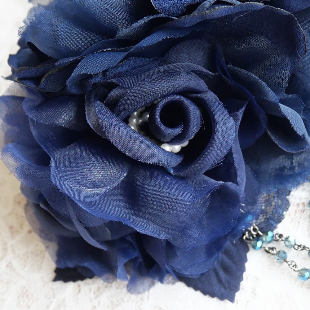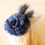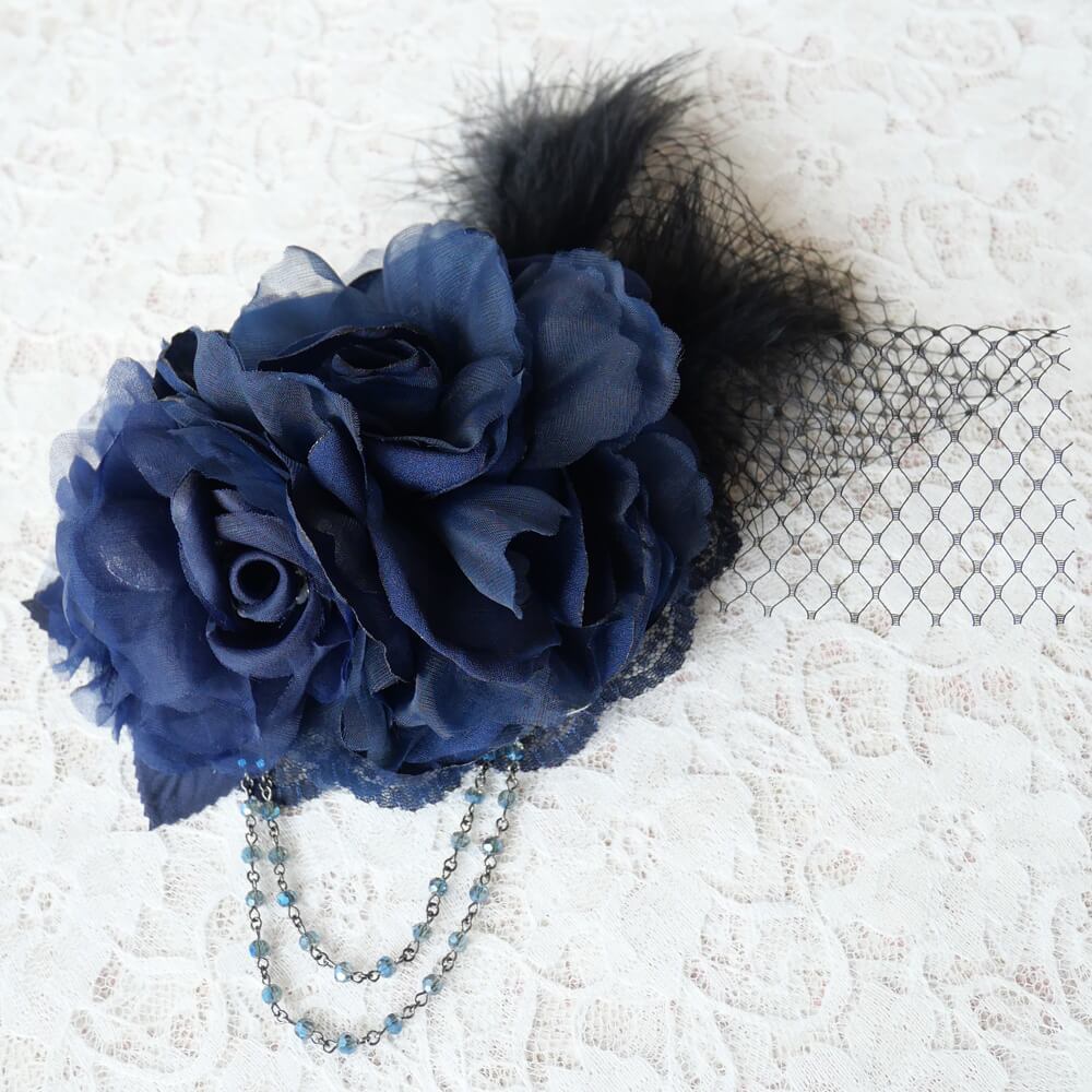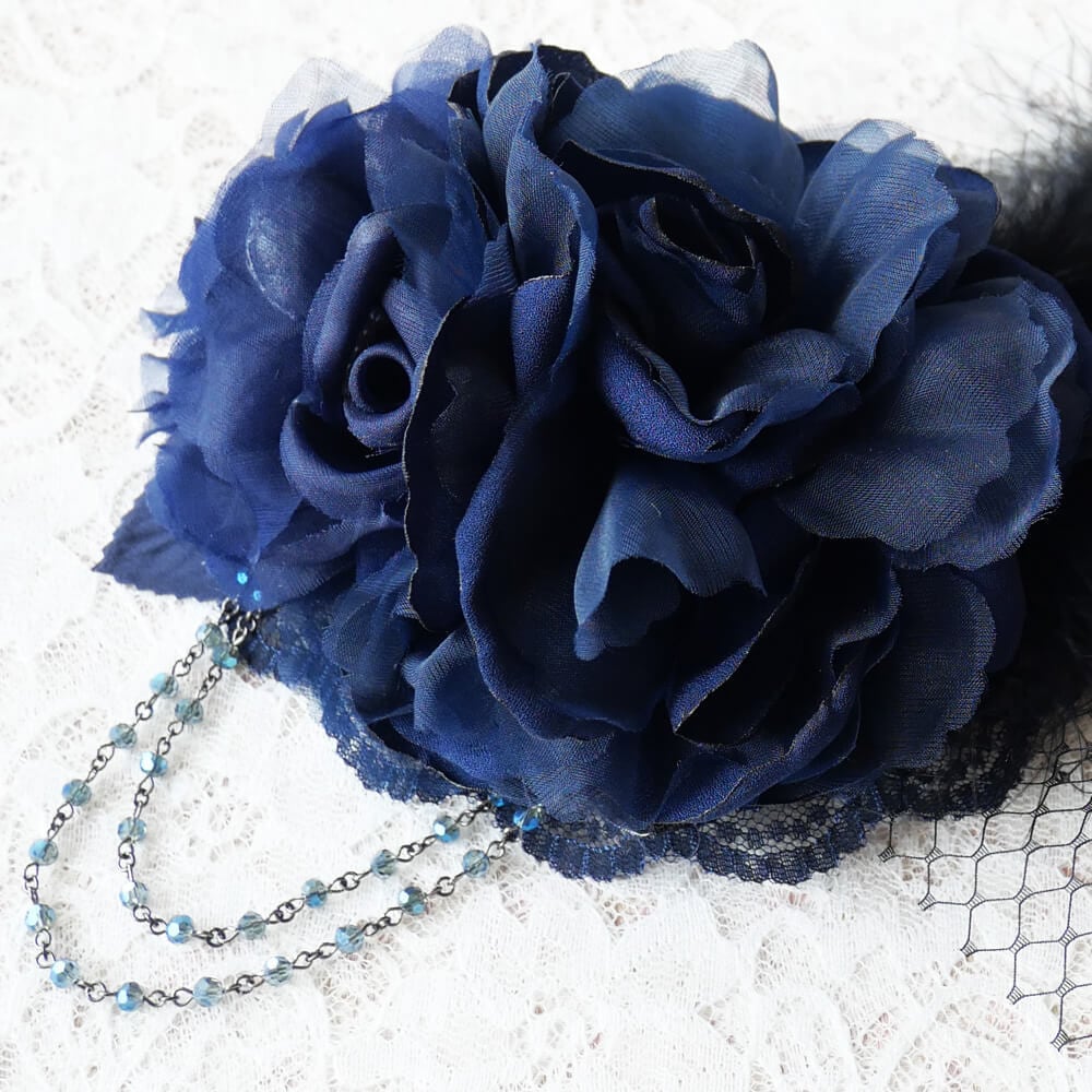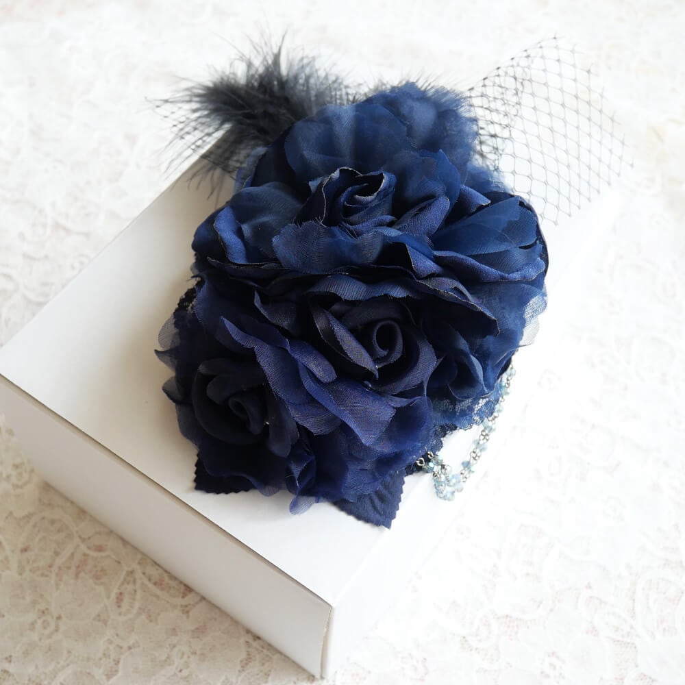 ブルー系のレースの上にコサージュを組み合わせとネットチュールにブラックフェザーがゴージャス感をアップ