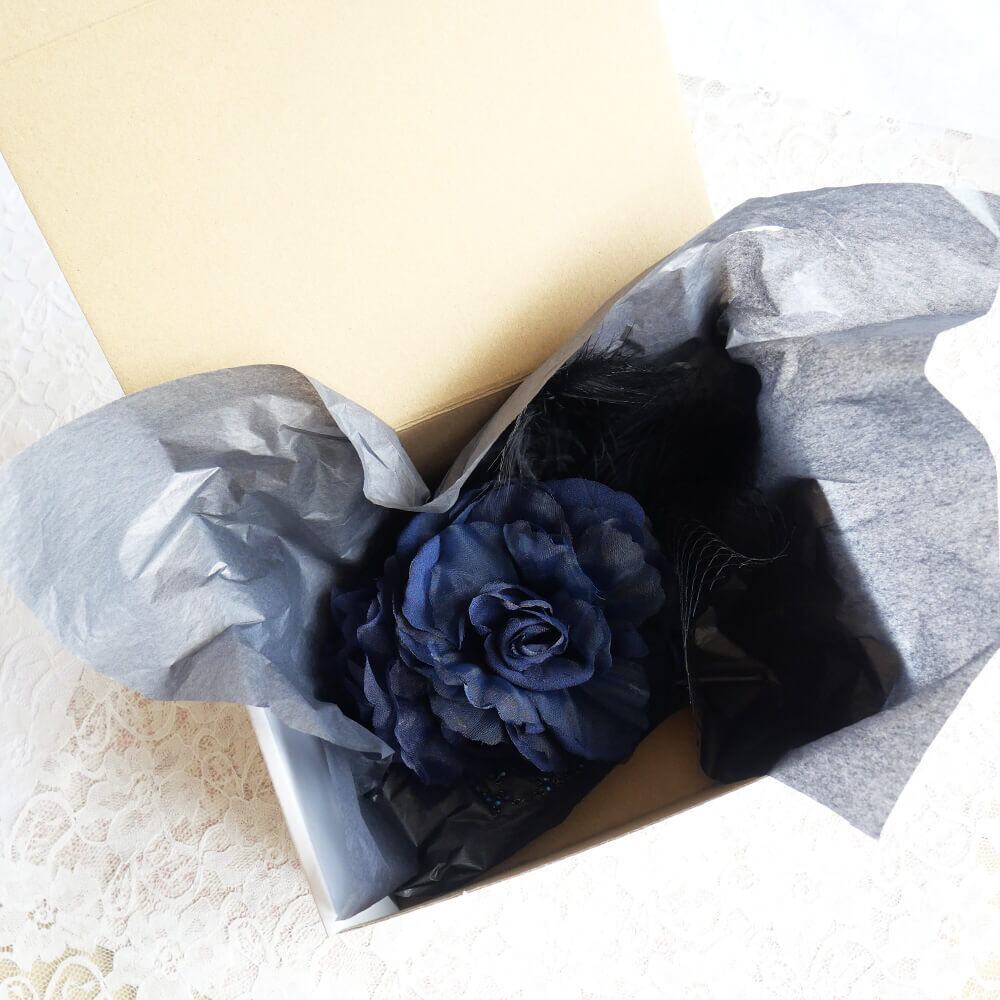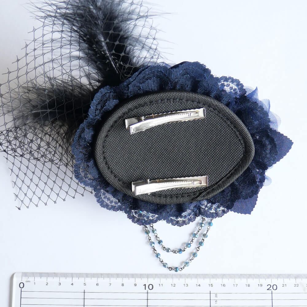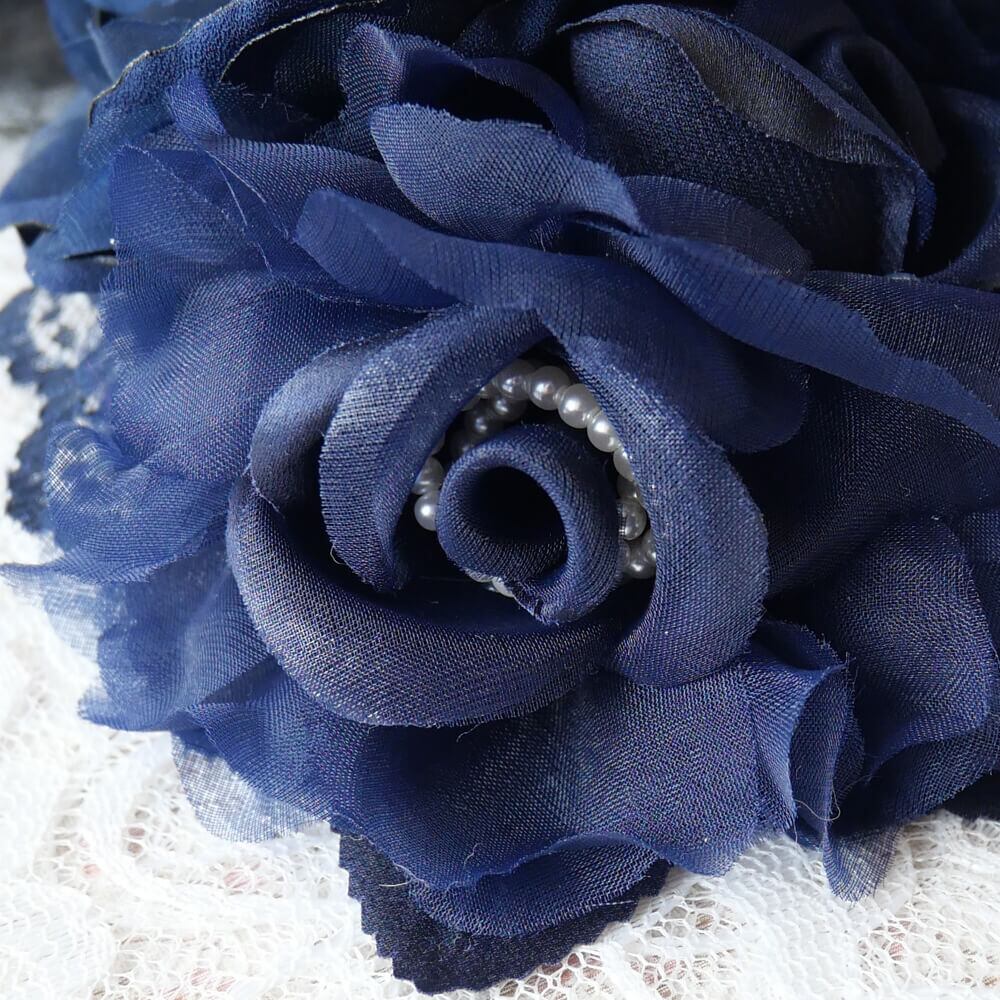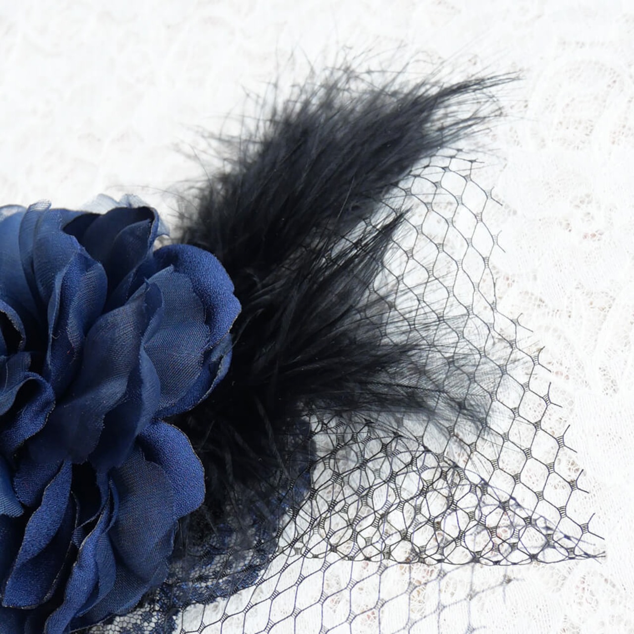 ブルー系のレースの上にコサージュを組み合わせとネットチュールにブラックフェザーがゴージャス感をアップ