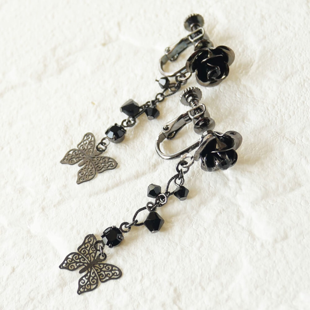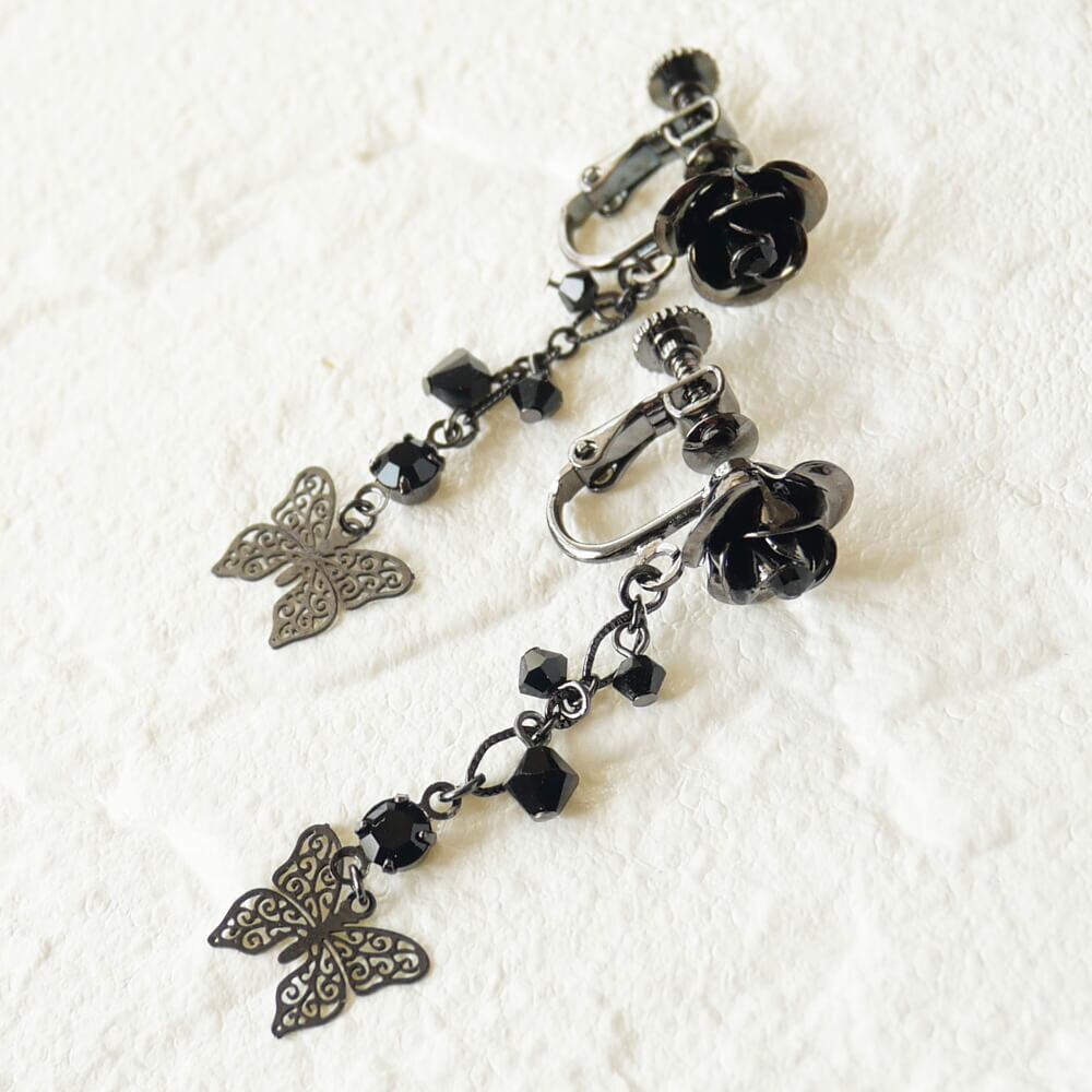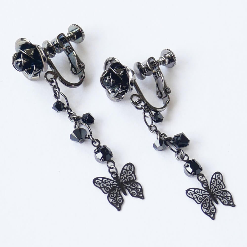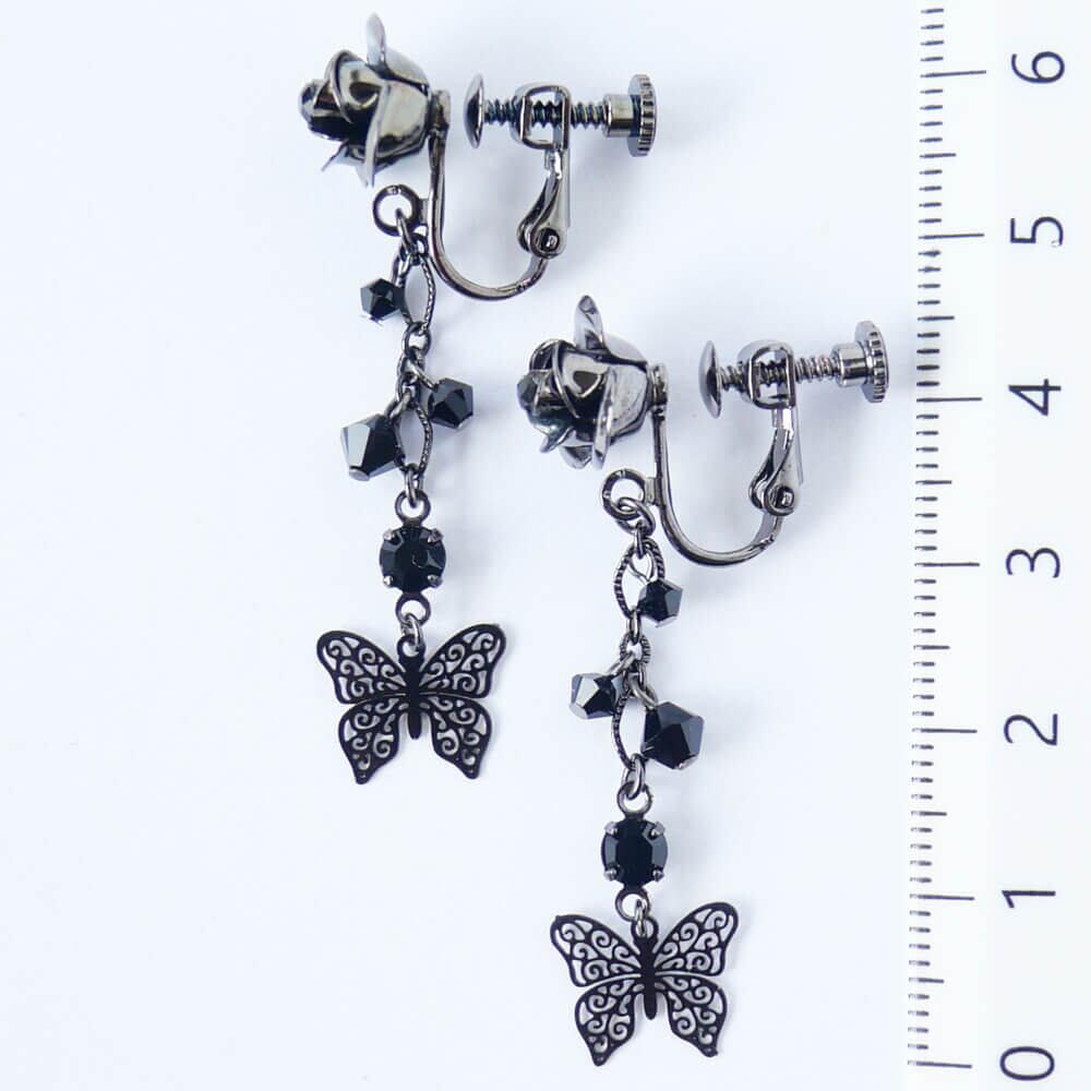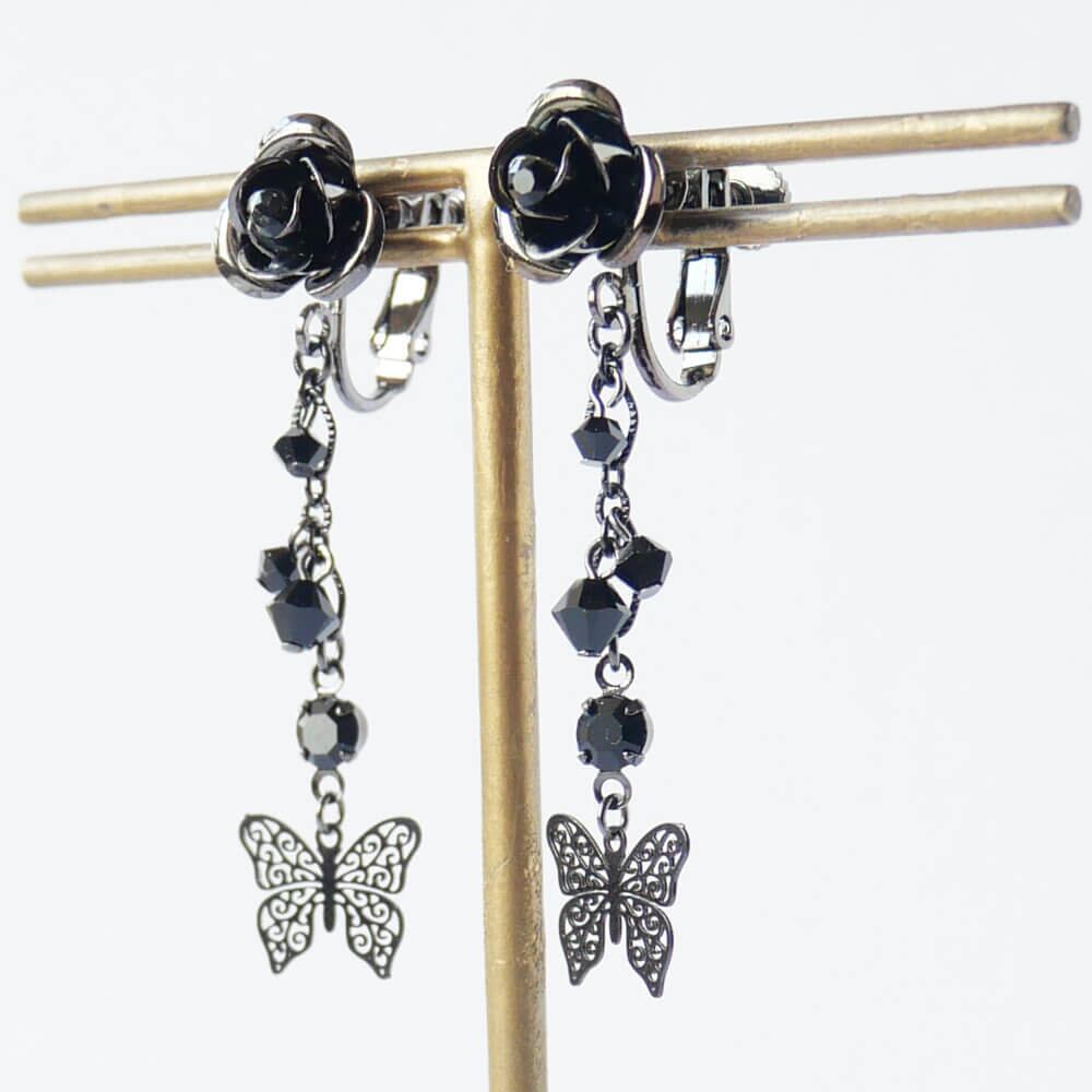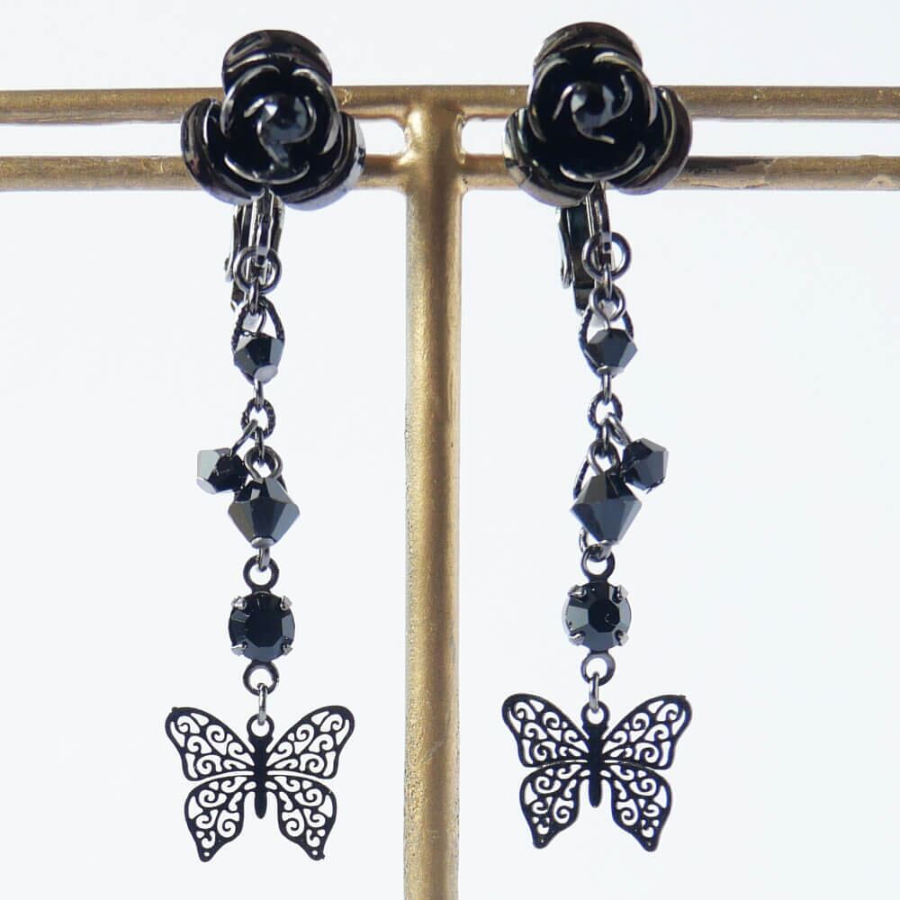 黒薔薇 ブラックストーン 蝶 ロング イヤリング