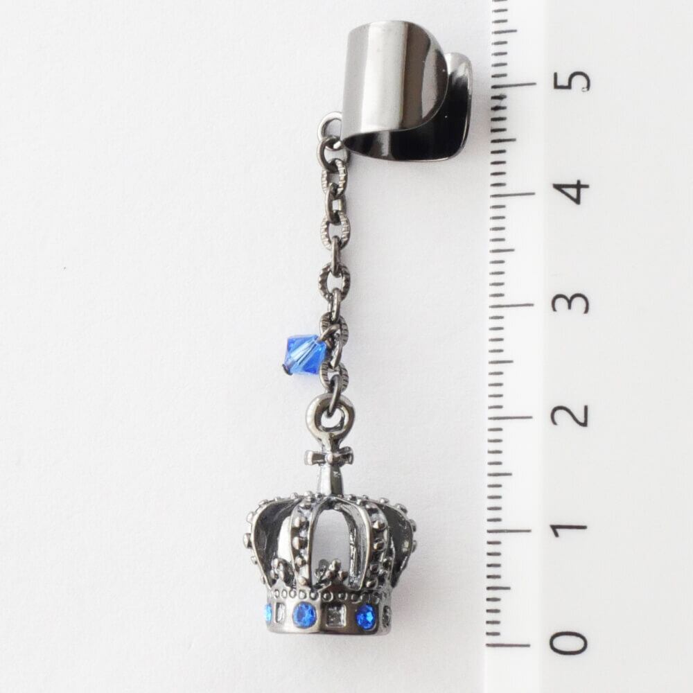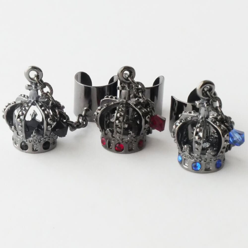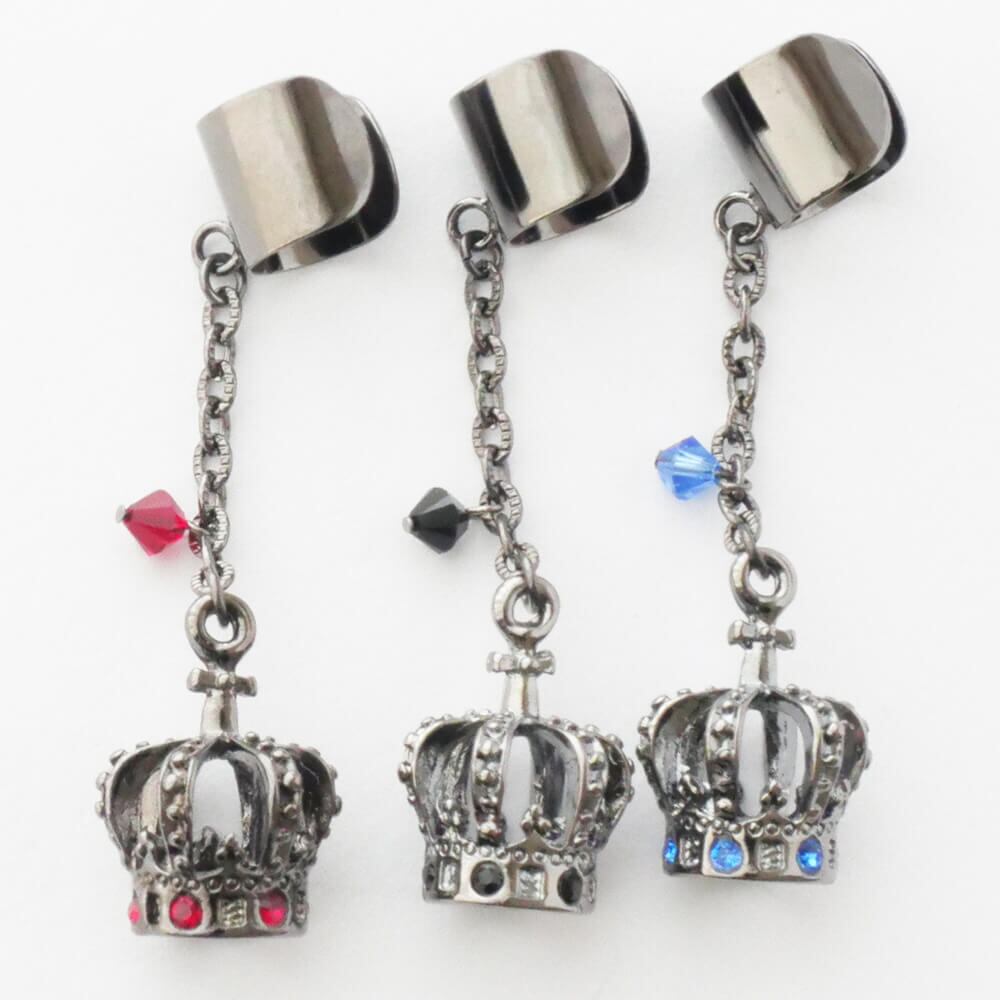 ガンメタ仕上げの王冠に、レッド、ブルー、ブラックのカラーストーンがあしらわれた王冠がメタルチェーンの下で揺れ、シンプルながらも存在感を放ちます