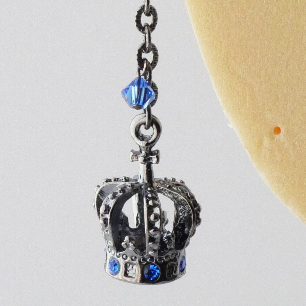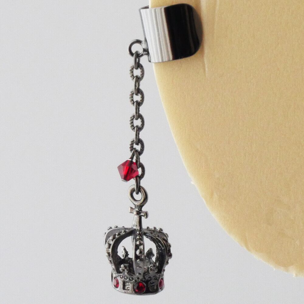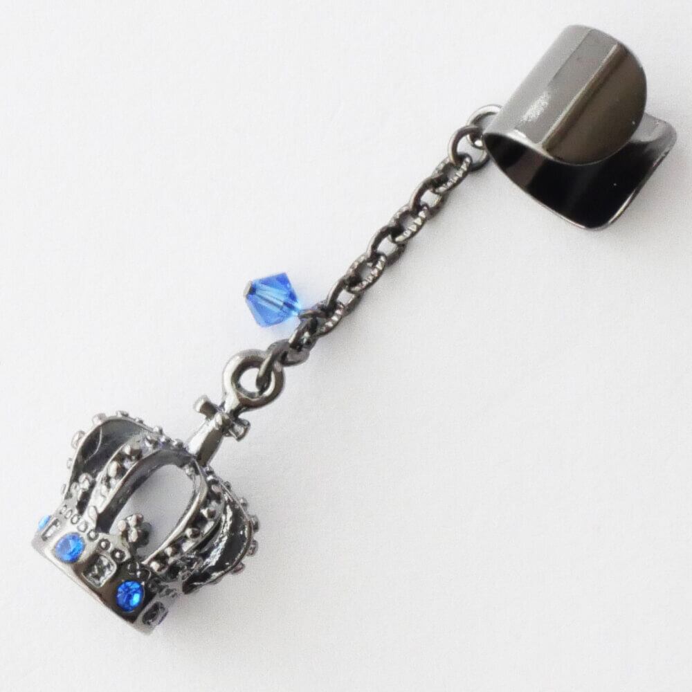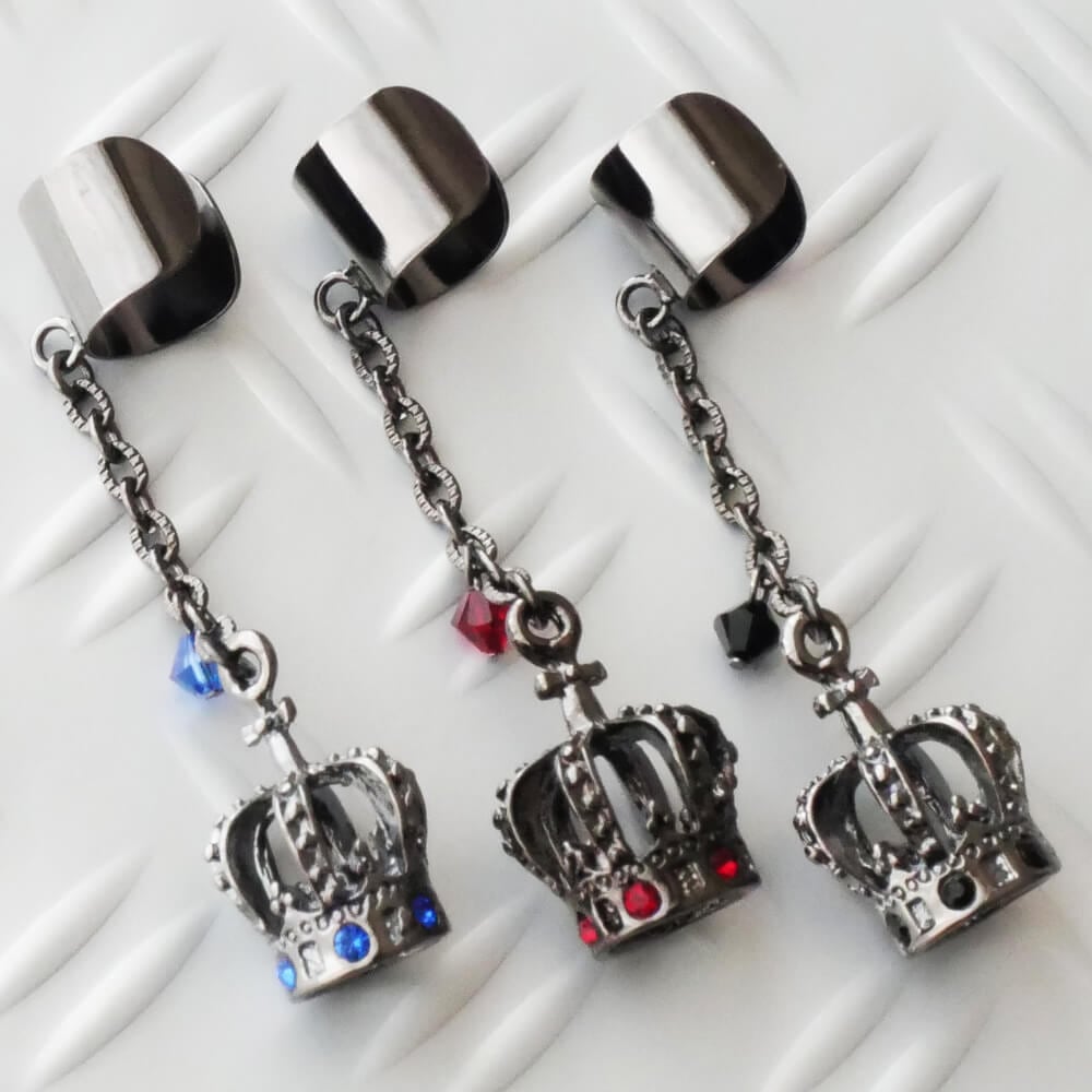 ガンメタ仕上げの王冠に、レッド、ブルー、ブラックのカラーストーンがあしらわれた王冠がメタルチェーンの下で揺れ、シンプルながらも存在感を放ちます