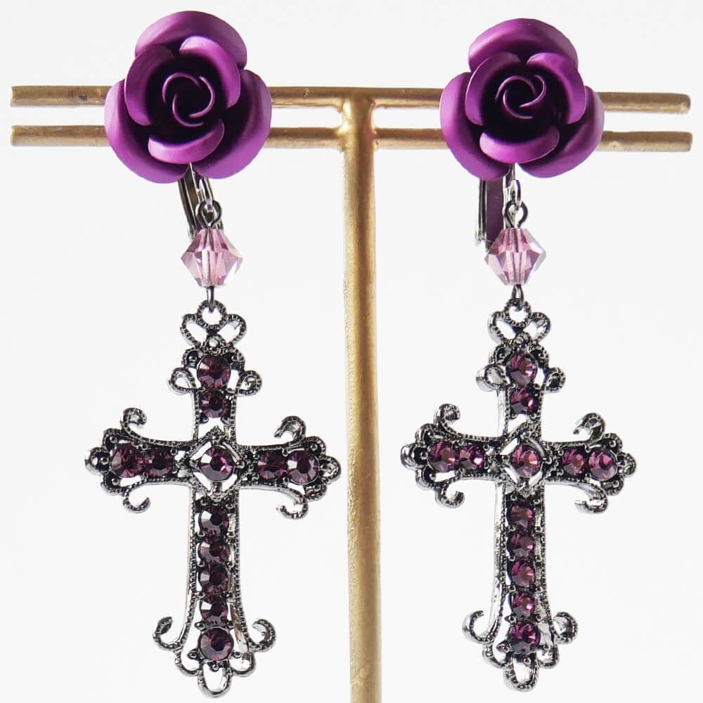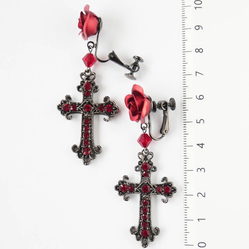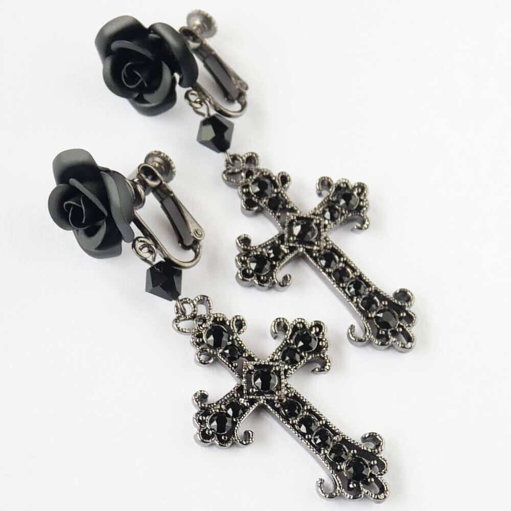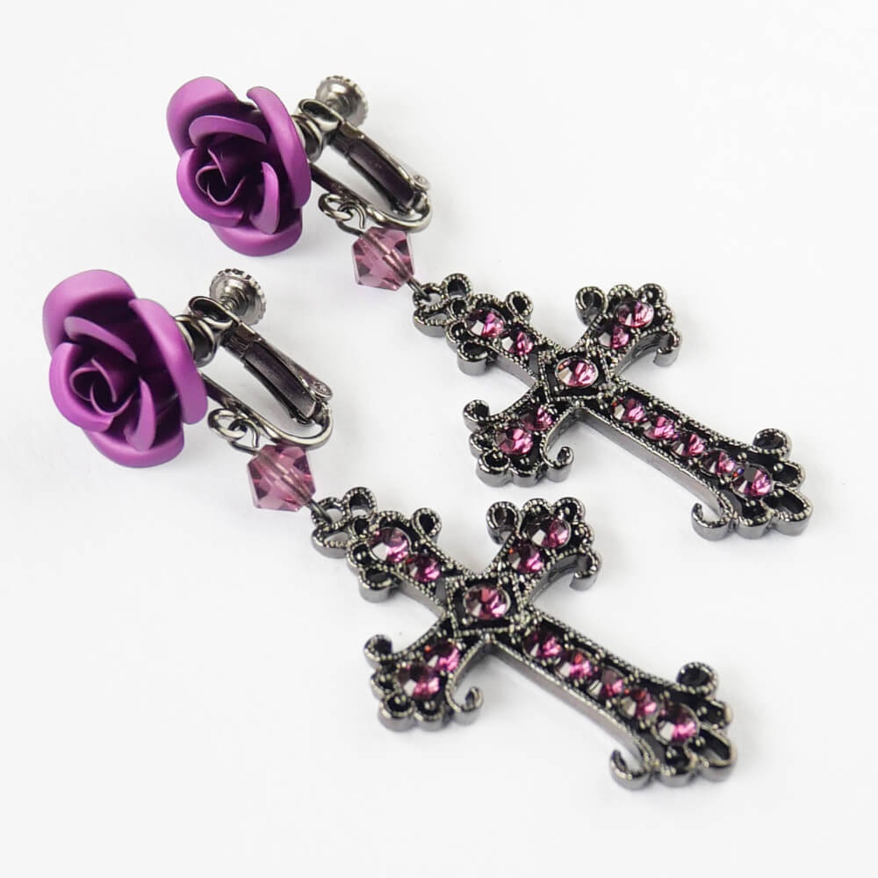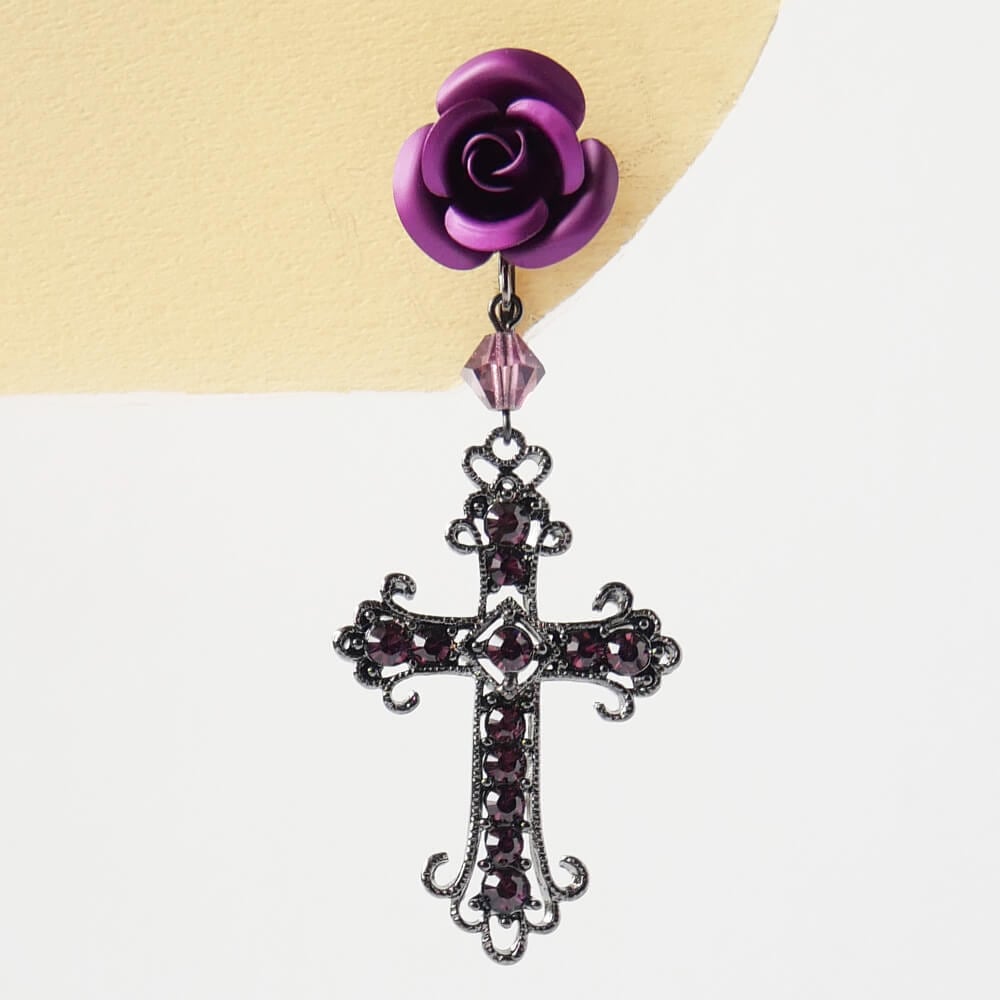 イヤリング 薔薇 十字架 ブラック パープル レッド ローズ クロス ゴスロリ 黒 紫 赤