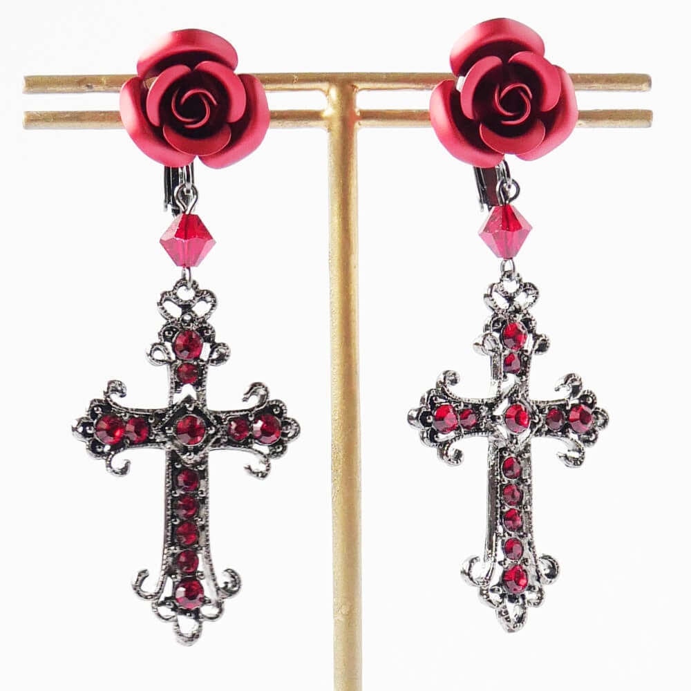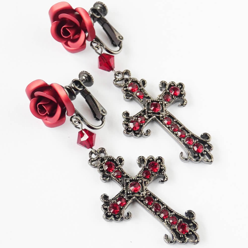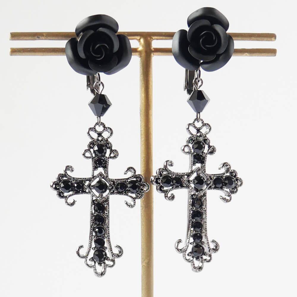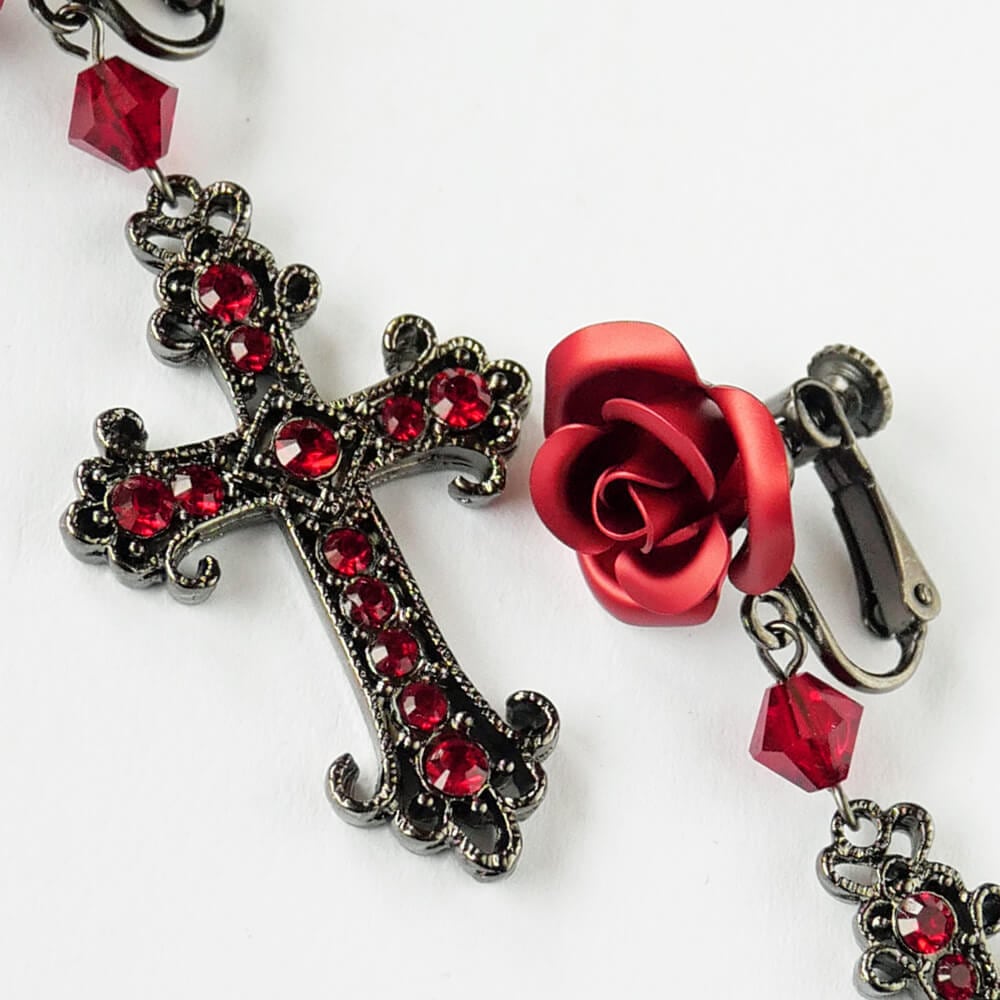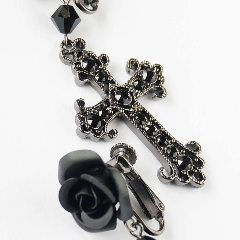 イヤリング 薔薇 十字架 ブラック パープル レッド ローズ クロス ゴスロリ 黒 紫 赤